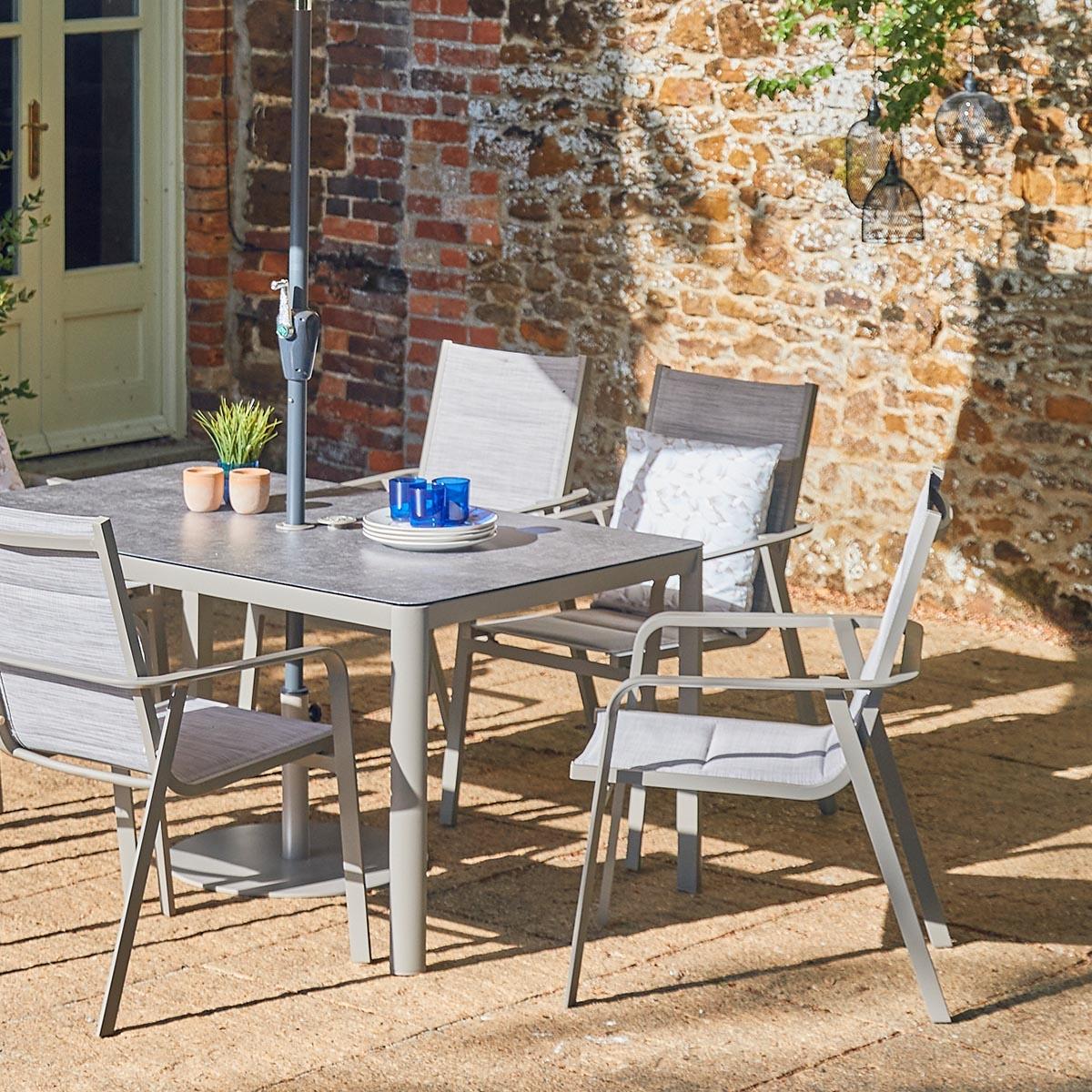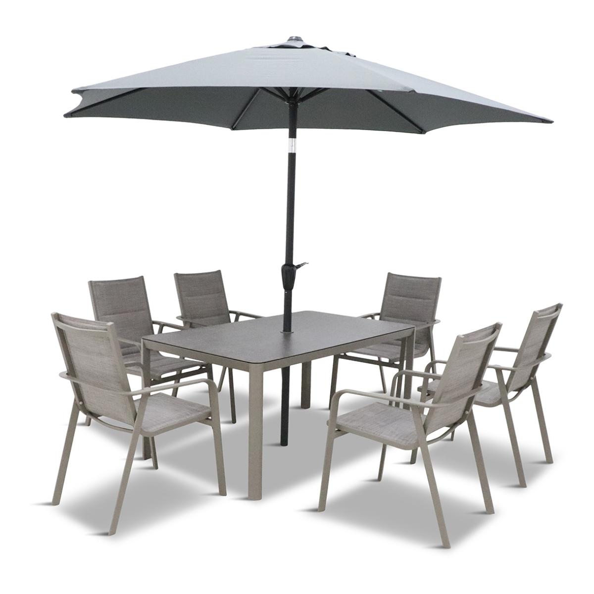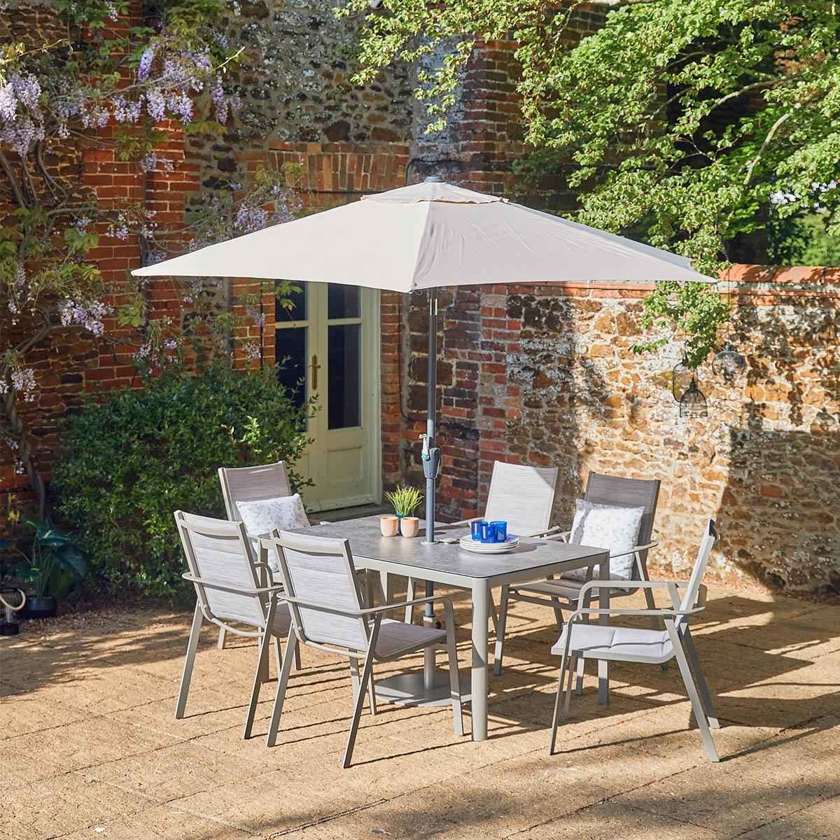 Please note, scatter cushions and accessories pictured are for demonstration purposes only and are not included. Introducing the Capri 6 Seat Dining Set from LG Outdoor, where sophistication meets quality craftsmanship. With its understated platinum-coloured premium powder coating, angular yet gracefully curved frame, you can be confident you've chosen the best quality for your outdoor space. The sleek tabletops are tastefully adorned with stone-effect, ceramic-coated toughened safety glass, ensuring both a pleasing aesthetic and long-lasting durability. Make a statement with your outdoor experience with the Capri Range, where every detail reflects a commitment to excellence and style. KEY FEATURES: Low Maintenance, Powder-Coated Aluminum Frames:Ensures durability and style. 'StainSAFE' Technology: Forms an invisible barrier against spills, ensuring effortless cleaning and maintenance. 'Eco Core' Elements: Incorporates eco-friendly materials, promoting sustainability and comfort in design. 6 x Stackable Padded Texteline Chairs Ceramic Glass Stone-Effect Table Top Floating Table Top 3.0m Crank & Tilt Parasol included Assembly Required DIMENSIONS: Chair: H 94cm x W 68cm x D 57cm Table:H 54cm x W 150cm x D 90cm Please note, all screens vary in colour reproduction and whilst every effort has been made to display the colour as accurately as possible it is for guidance only.
