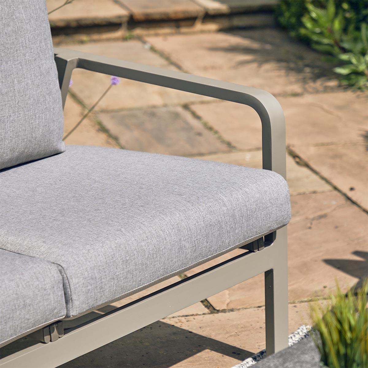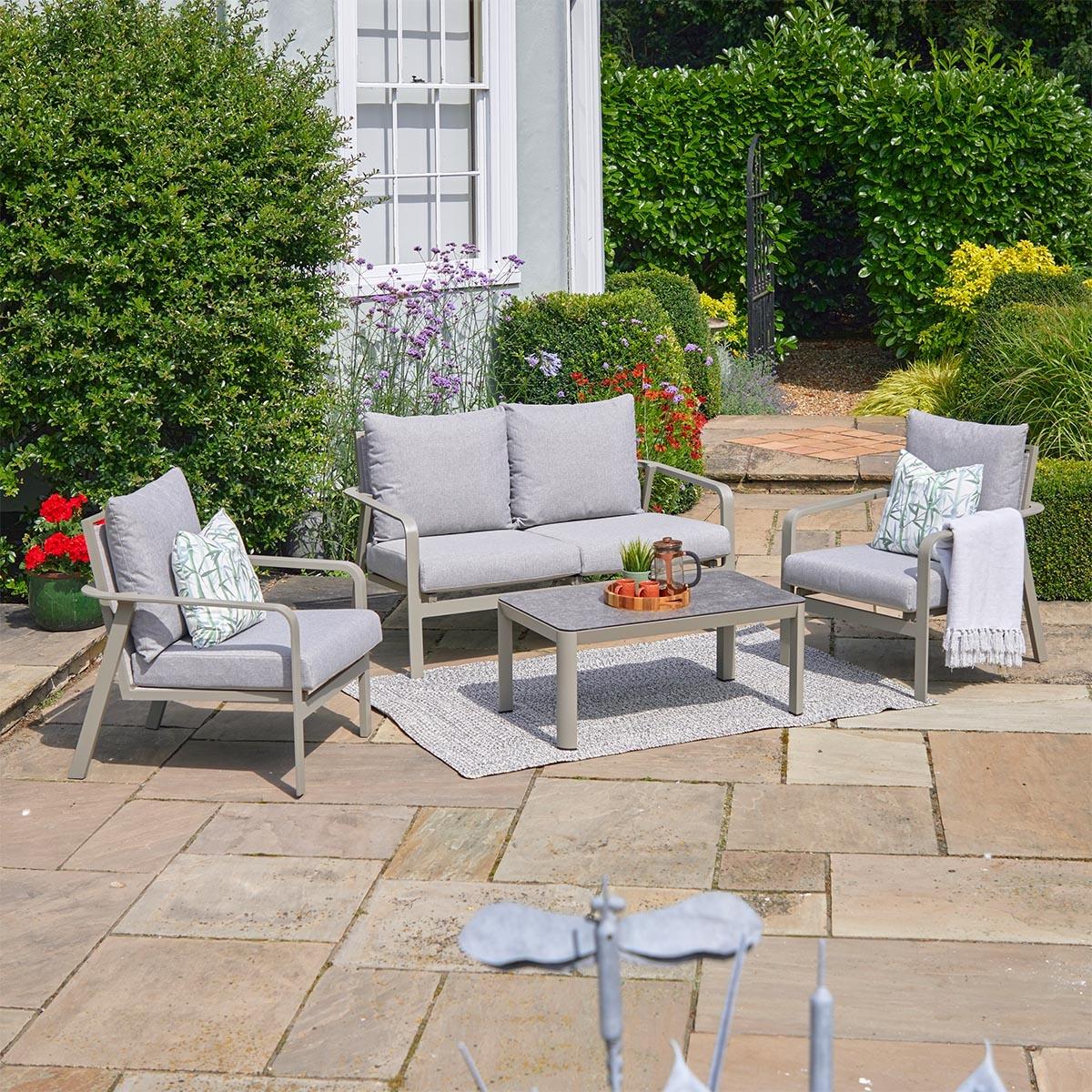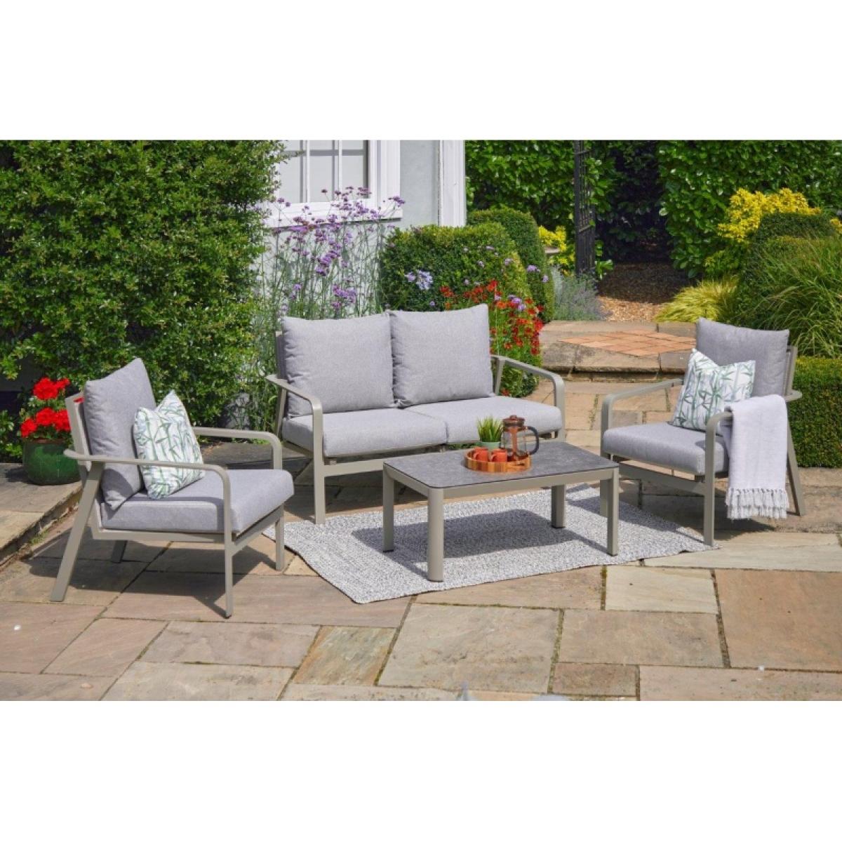 Introducing the Capri Lounge Set from LG Outdoor, where sophistication meets quality craftsmanship. With its understated platinum-coloured premium powder coating, angular yet gracefully curved frame, and the addition of high-quality supportive season-proof Eden cushions – water repellent, quick drying, and UV resistant – you can be confident you've chosen the best of quality for your outdoor space. The sleek tabletops are tastefully adorned with stone-effect, ceramic-coated toughened safety glass, ensuring both a pleasing aesthetic and long-lasting durability. Enhance your outdoor experience with the Capri Range, here every detail reflects a commitment to excellence and style. KEY FEATURES: Powder-Coated Aluminum Frames:Ensures durability and style. 'Eden' Season-Proof Cushions: Water repellent, quick-drying, and UV resistant for all-weather use. 'StainSAFE' Technology: Forms an invisible barrier against spills, ensuring effortless cleaning and maintenance. 'Eco Core' Elements: Incorporates eco-friendly materials, promoting sustainability and comfort in design. Ceramic Glass Stone-Effect Table Top Floating Table Top Assembly Required DIMENSIONS: Sofa:H 82cm x W 139cm x D 76cm Chair:H 94cm x W 70cm x D 76cm Table:H 40cm x W 95cm x D 55cm Please note, all screens vary in colour reproduction and whilst every effort has been made to display the colour as accurately as possible it is for guidance only.