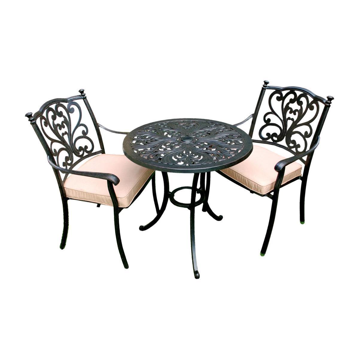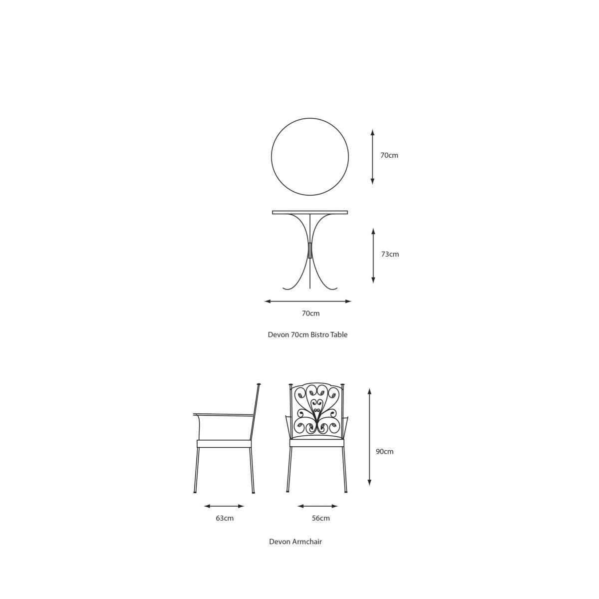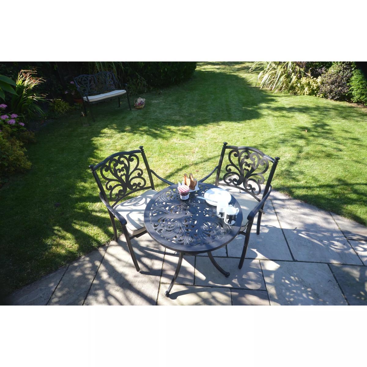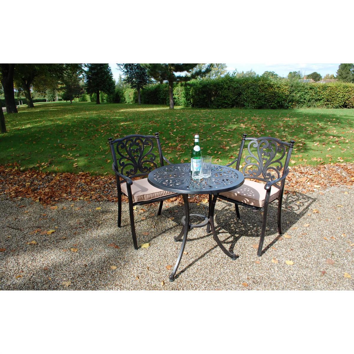 Create a stylish, relaxing space in your garden with this 2-seater Devon bistro table and chairs set from LG Outdoor. Key features: Powder-coated aluminium frames with bronze finish Water-repellent, UV-resistant cushions made of superior 'comfort filling' and natural-feel fabric Stackable armchairs Cast aluminium table top with a self-assembly base for added strength 3-year limited warranty on the cast aluminium frame excludes damage to the powder-coated finish caused by corrosion, scratching, pitting, fading or oxidisation 1-year limited warranty on the cushions Bronze-coloured, intricately designed frames are complemented by beige cushioning with brown piping. The cast aluminium frame is double powder coated and so can be left outdoors all year round. Armchairs are stackable for easy storage while the season-proof Eden cushioning is water-repellent, UV-resistant and made of superior 'comfort filling' and a natural-feel fabric. Please note: not all our ranges are on display in our shops. 0% APR Representative: this product is eligible for Interest Free Credit, available when you spend £1000 or more on selected home products. Terms and conditions apply