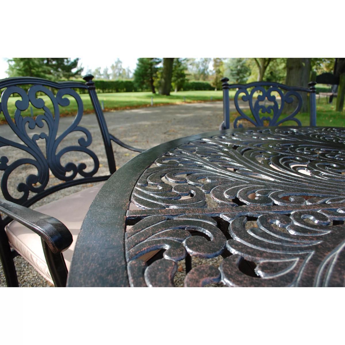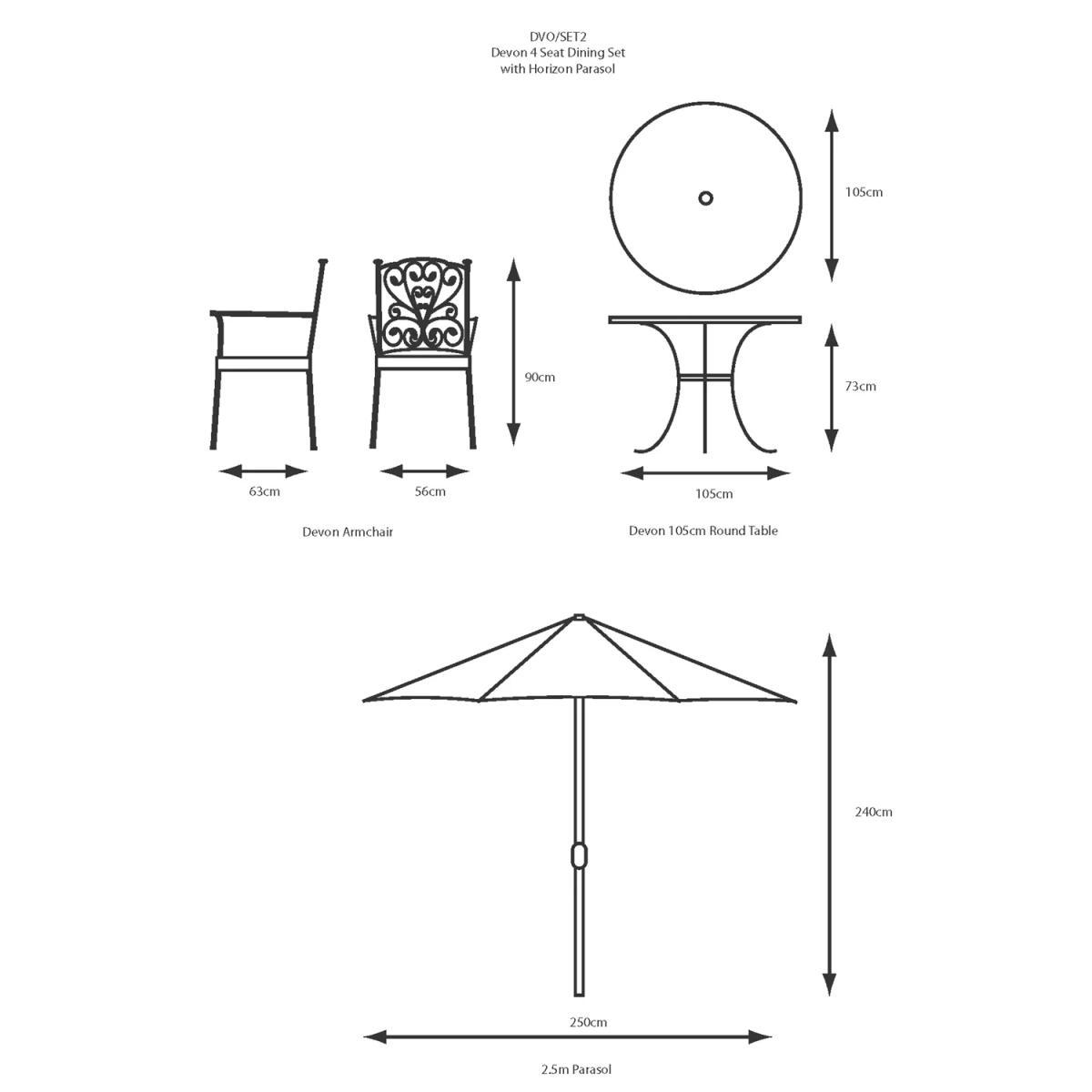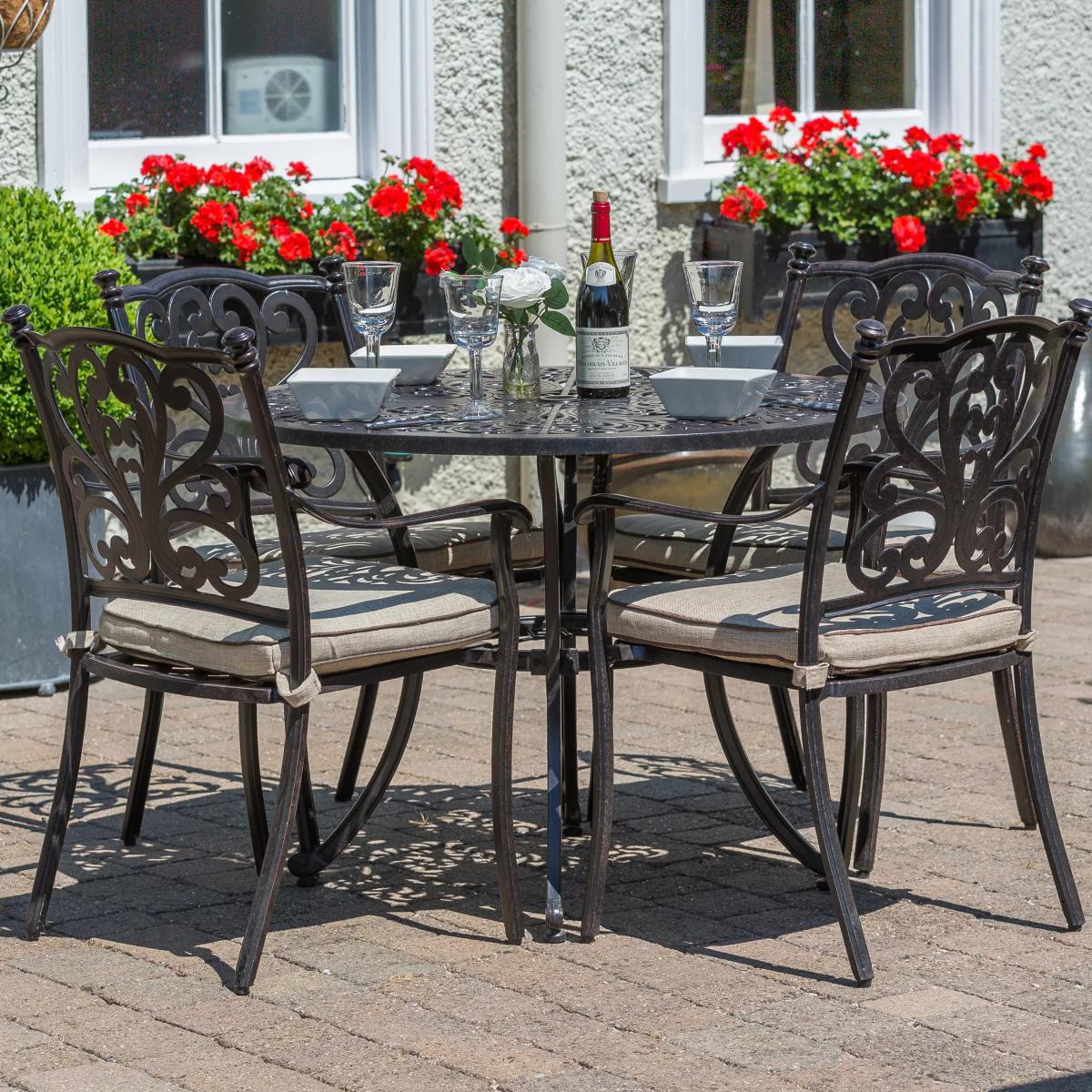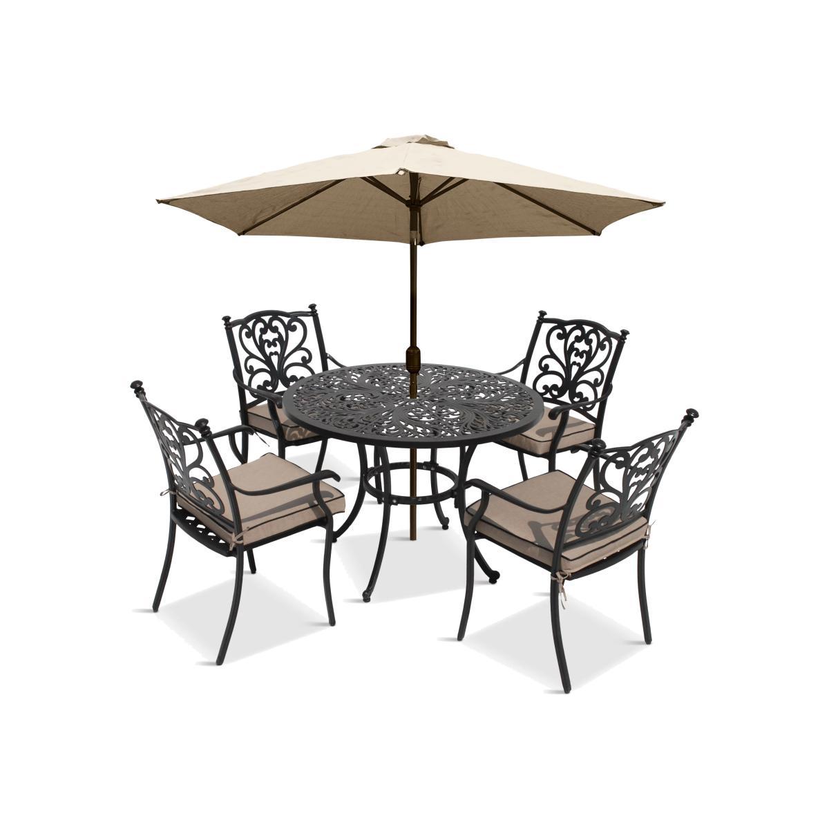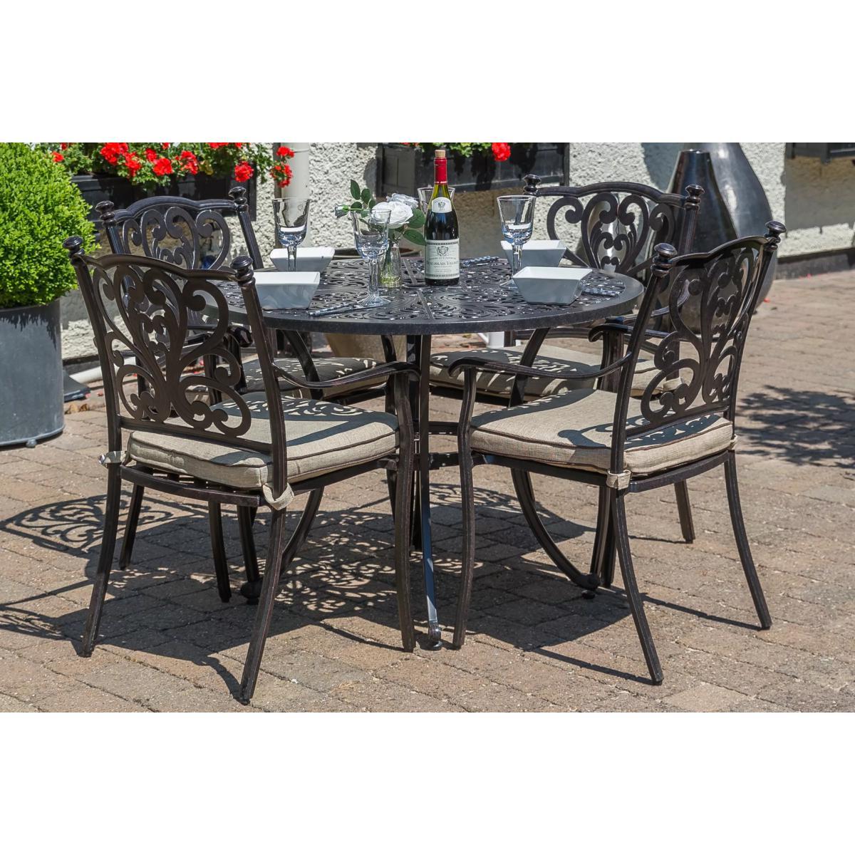 Create a stylish, relaxing space in your garden with this 4-seater Devon dining table and chairs set from LG Outdoor. Key features: Powder-coated aluminium frames with bronze finish Water-repellent, UV-resistant cushions made of superior 'comfort filling' and natural-feel fabric Stackable armchairs Cast aluminium table top with a self-assembly base for added strength Table has a parasol hole and comes with an adjustable parasol (parasol base is not included) 3-year limited warranty on the cast aluminium frame excludes damage to the powder-coated finish caused by corrosion, scratching, pitting, fading or oxidisation 1-year limited warranty on the cushions Bronze-coloured, intricately designed frames are complemented by beige cushioning with brown piping. The cast aluminium frame is double powder-coated and so can be left outdoors all year round. Armchairs are stackable for easy storage while the season-proof Eden cushioning is water-repellent, UV-resistant and made of superior 'comfort filling' and a natural-feel fabric. Want to see it first? You may want to see and get a feel for the product in one of our shops before ordering. We'll be able to tell you where the range you'd like to view is on display.