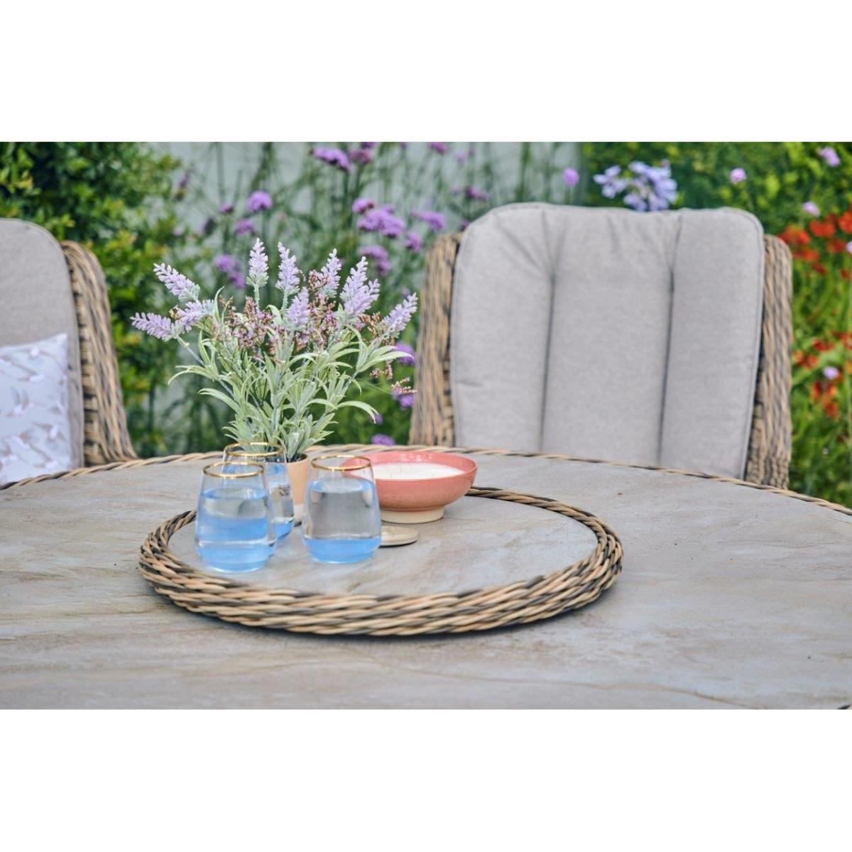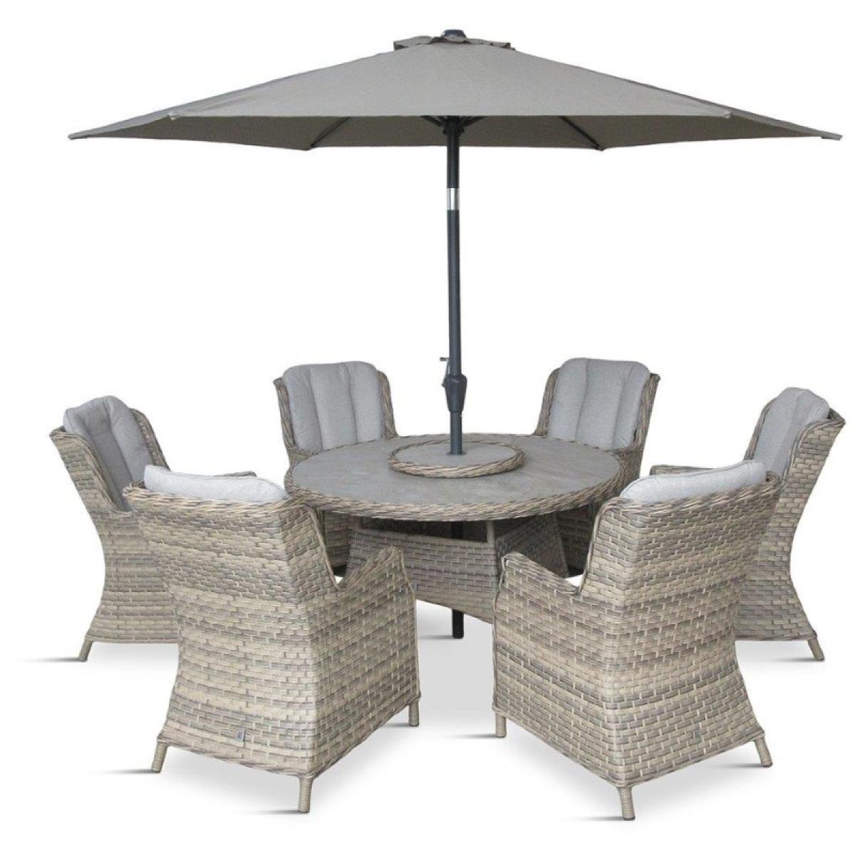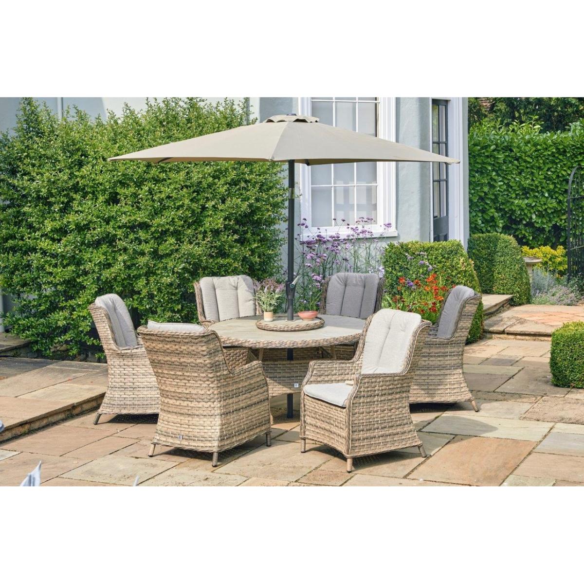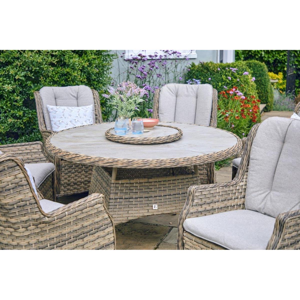 Introducing the Florence 6 Seat dining set from LG Outdoor, where craftsmanship and timeless design unite. Florence presents a unique multi-toned weave—its lightly textured flat weave subtly accented with twisted rod weave edges. The table tops feature stone-effect, ceramic-coated toughened safety glass for enduring aesthetics. With cushions designed for water repellence, quick drying, and UV resistance, Florence promises year-round comfort and resilience. Embracing a classic high-back design, Florence blends form and comfort seamlessly. Enhance your outdoor space with the Florence Range, where every detail reflects LG Outdoor's commitment to timeless beauty and impeccable quality. KEY FEATURES: Seats 6 people Unique multi-toned weave frames Stone-effect, ceramic-coated toughened safety glass tabletops Water-repellent, UV resistant, quick-drying cushions Chairs with a classic high-back design Includes Deluxe 3m Tilt & Crank parasol Includes Lazy Susan 3 Year Limited Warranty DIMENSIONS: Armchair:H 95cm x W 64cm x D 80cm Table:H 74cm x W 140cm x D 140cm Lazy Susan Diameter: 55cm Parasol Diameter: 3m Please note, all screens vary in colour reproduction and whilst every effort has been made to display the colour as accurately as possible it is for guidance only.