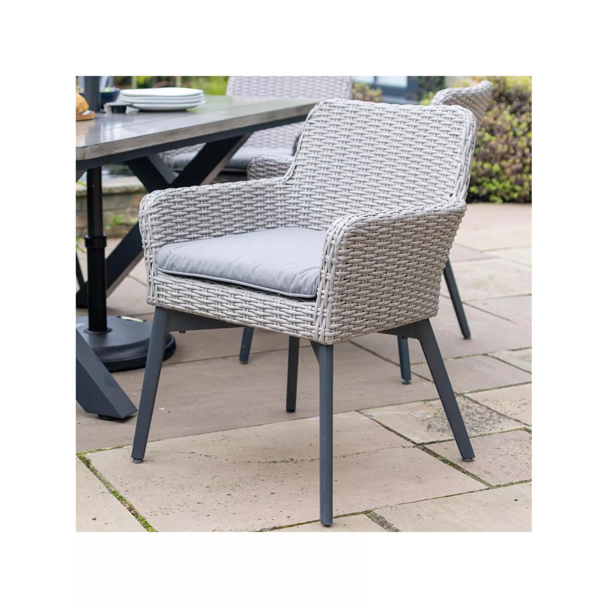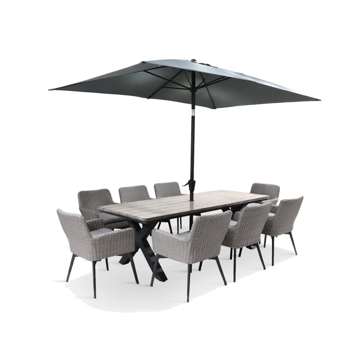 Sophisticated and modern, the weather-resistant Java range from LG Outdoor features light grey wood-effect table surfaces and half-moon two-ply Ever. Weave seating on brushed aluminium frames. The seamless integration of weave and aluminium creates a distinctive look, while the low, deep design exudes comfort, enhanced by grey fabric cushions. This eight-seater set includes a rectangular dining table and a deluxe parasol in the middle with a crank mechanism for easy opening and lowering of the canopy, and a tilt mechanism to control the direction of the shade. Key features: Eight Ever. Weave garden armchairs Eight-seater rectangular dining table with wood-effect top and parasol hole Crank and tilt parasol Robust aluminium frames Shower-resistant seat cushions Easy to maintain