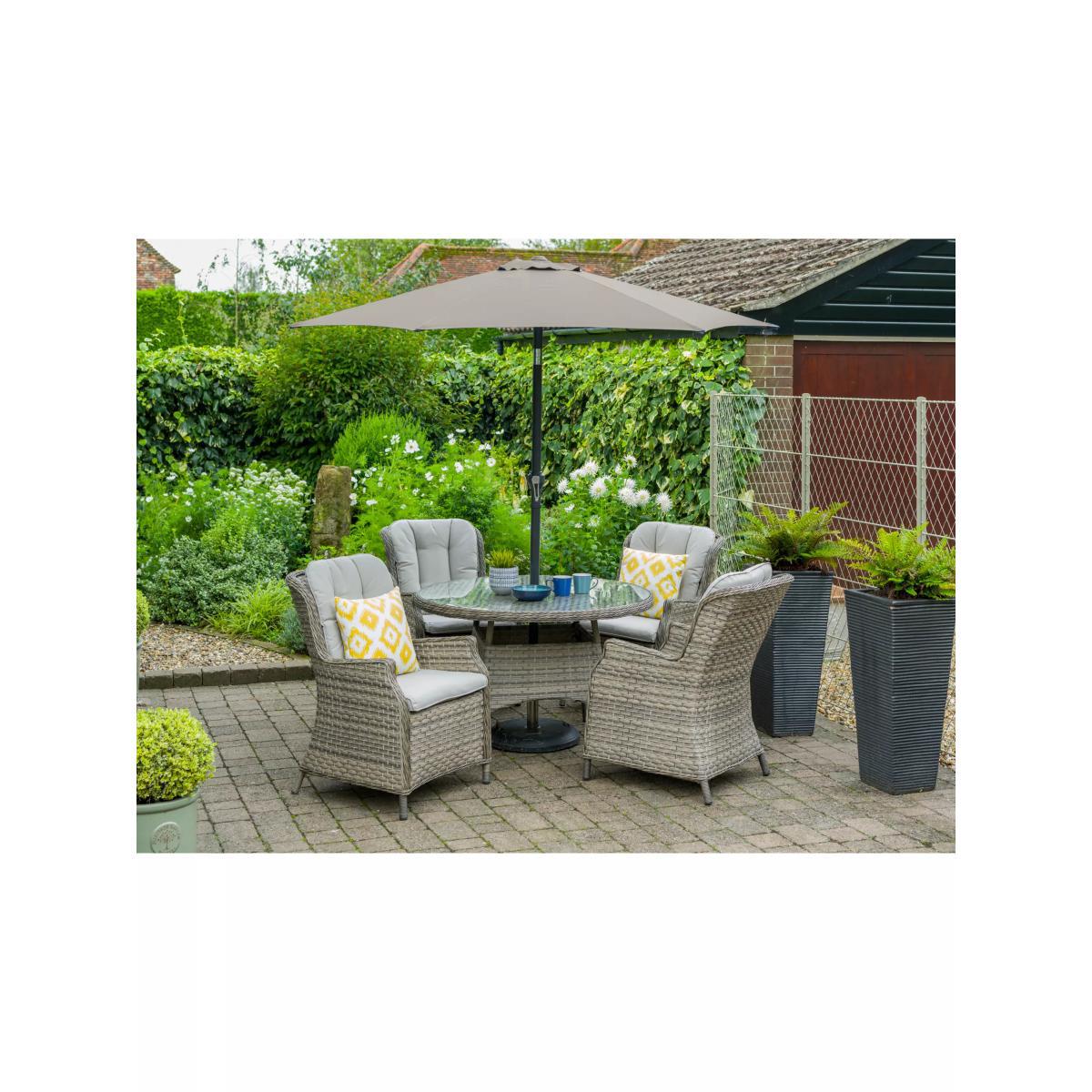 The traditional-style Lyon range from LG Outdoor pairs robust aluminium frames with all-weather Ever. Weave in multi-toned brown and wheat. The furniture is lightweight, sturdy, weather-resistant and easy to maintain. This set includes a round dining table, four highback armchairs and a parasol to keep you shaded from the sun. Season-proof Eden cushions in the range enhance your comfort and are water-repellent during light rainfall, quick-drying and are UV-resistant to prevent colour fading. They're made with a natural-feel fabric and comfortable filling, derived from recycled plastic bottles. The oatmeal-toned cushions are stain-resistant and need only simple sponge-cleaning to tackle spills. They have removable covers for easy cleaning. Store the cushions during persistent and heavy rain and over winter months. Key features: Four highback garden armchairs Garden dining table with 5mm safety glass top Sturdy aluminium frames with polymer Ever. Weave Season-proof fabric cushions and backrests for comfort 2.5m graphite pole and base with taupe canopy parasol Want to see it first? You may want to see and get a feel for the product in one of our shops before ordering. We'll be able to tell you where the range you'd like to view is on display.