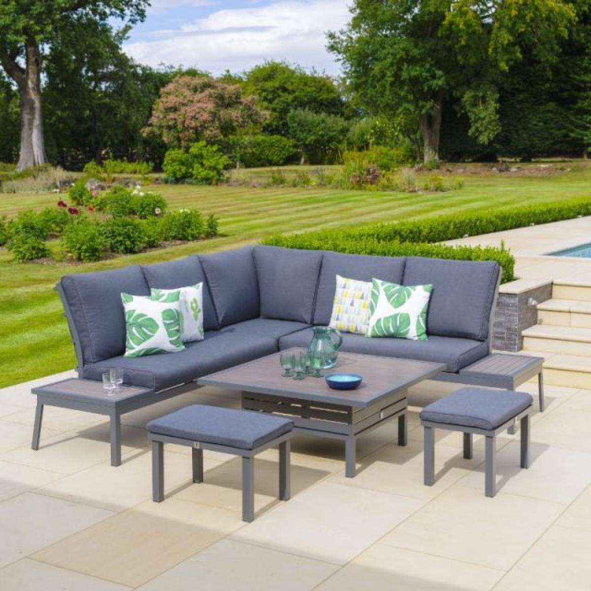 With its sleek design, bold graphite grey aluminium frame and a super-realistic wood-effect tabletop, the Milano is one of our favourite modern outdoor collections. The Milano Adjustable Modular Dining Set from LG Outdoor allows you to turn your low coffee table to dining table in one easy move. The set includes left and right sofas, a corner section, footstools, and cushions. The wood-effect aluminium tabletop is hand-brushed and slatted for a super-realistic effect, so it looks like wood, but without the maintenance. The tabletop is inset into the weave base for a seamless, stylish look. Milano's double powder coated aluminium frames are anti-rust, so can be left outdoors all year round. All LG Outdoor furniture sets have their patented Eden Season-proof cushions with a superior filling and natural feel fabric. Eden cushions bring you all the benefits of a weatherproof cushion, with no compromise on comfort. You can leave them outside all summer as they are water repellent and UV resistant, drying quickly so you can use within hours of getting them wet. The cushions are in a modern anthracite grey with zip cushion covers making them easily removable for cleaning. Eden cushions are StainSAF. E - using LG's unique technology to form an invisible barrier over every inch of the cushion fabric, so sponge clean a spill and the cushion will look brand new again! Even better, the Eden cushion filling is made from ECOCORE, a filling using recycled plastic bottles. LG Outdoor are always looking at new ways in which they can help our environment. For extra comfort, the Texteline under the cushions is made from woven PVC-coated polyester thread, formulated to withstand the elements. LG Outdoor products come with 3-year limited warranty. Don't forget your furniture cover and why not add a flash of colour with a selection of our scatter cushions? Please note, the scatter cushions and accessories pictured are not included but you can view our range here. The LG Outdoor Deluxe Cover - Large Modular (DXCOV8) will fit this set Corner Set Footprint: 245cm x 245cm Table Dimensions: Width 105cm x Depth 105cm Some assembly is required Scatter cushions are not included, but are available to purchase separately All screens vary in colour reproduction and whilst every effort has been made to display the colour as accurately as possible it is for guidance only.
