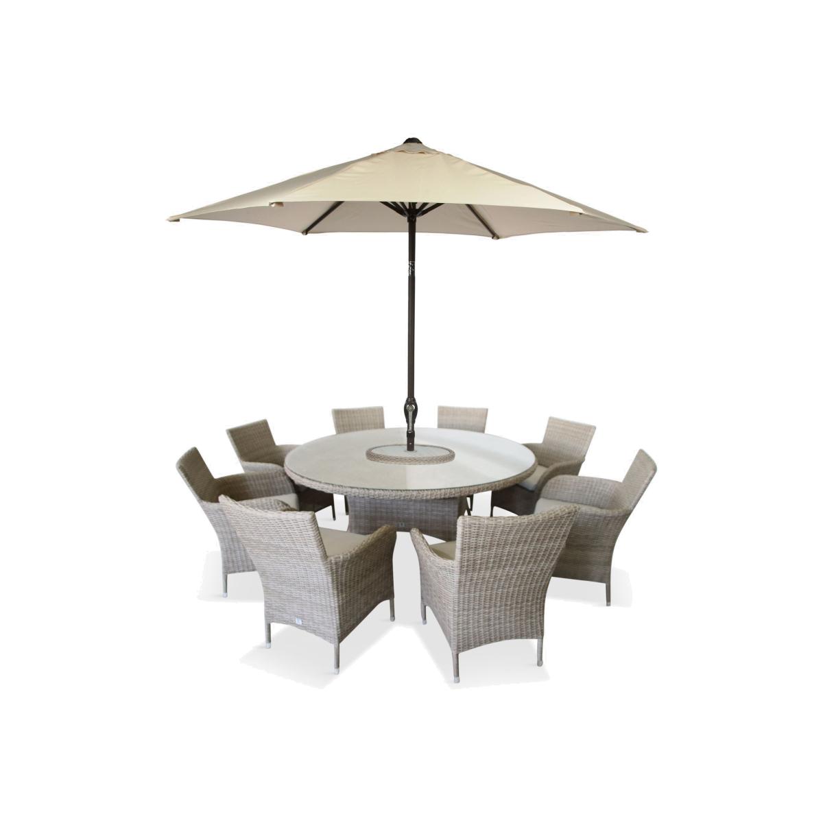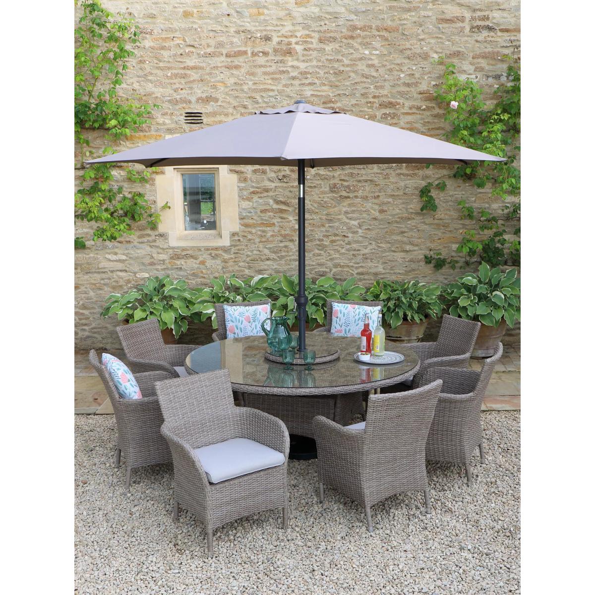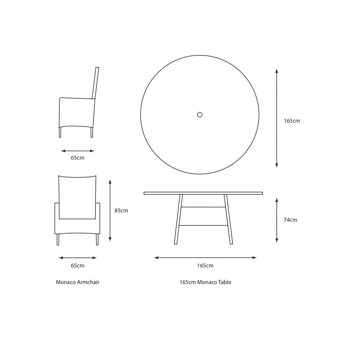 The Monaco range from LG Outdoor pairs robust aluminium frames with natural-looking, all-weather synthetic wicker. The furniture is lightweight, sturdy, weather-resistant and easy to maintain. The highback dining armchairs are designed for comfort and the round dining table has a 5mm-thick safety glass top. This set comes with an adjustable parasol for shade and protection. Season-proof Eden seat cushions in the range enhance your comfort and are water-repellent during light rainfall, fast-drying and are UV-resistant to prevent colour fading. The cushions have bull-nosed curved edges for added comfort and removable zip-up covers for easy cleaning. Store the cushions during persistent and heavy rain and over winter months. Key features: Eight-seater round garden dining table with glass top Eight Ever. Weave synthetic wicker garden dining armchairs Sturdy aluminium frames Season-proof Eden seat cushions for comfort Table has a parasol hole and comes with an adjustable parasol. Parasol base not included