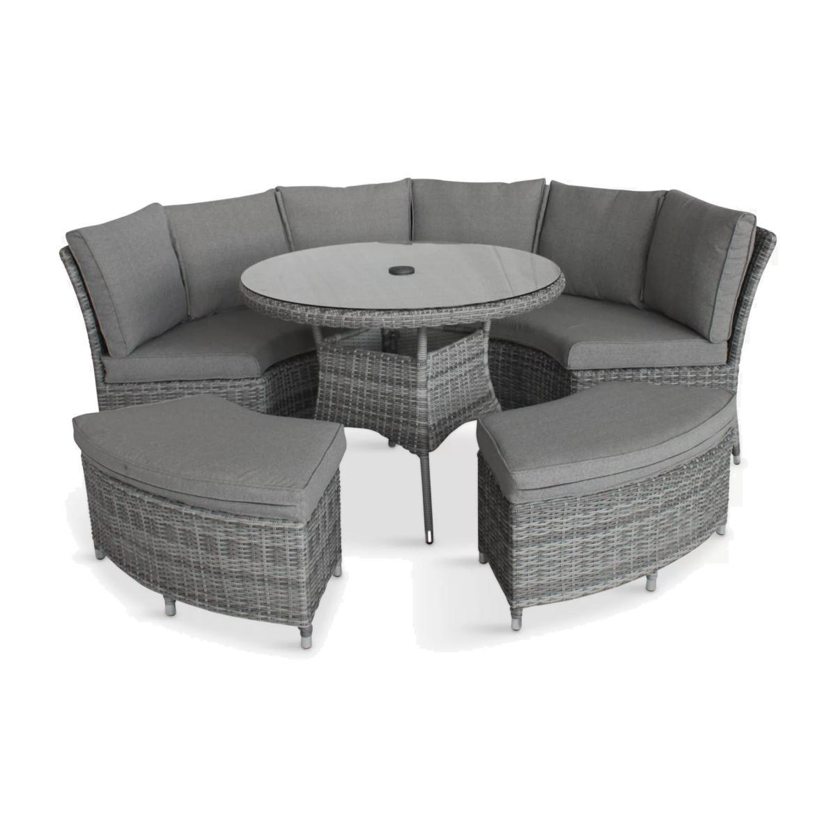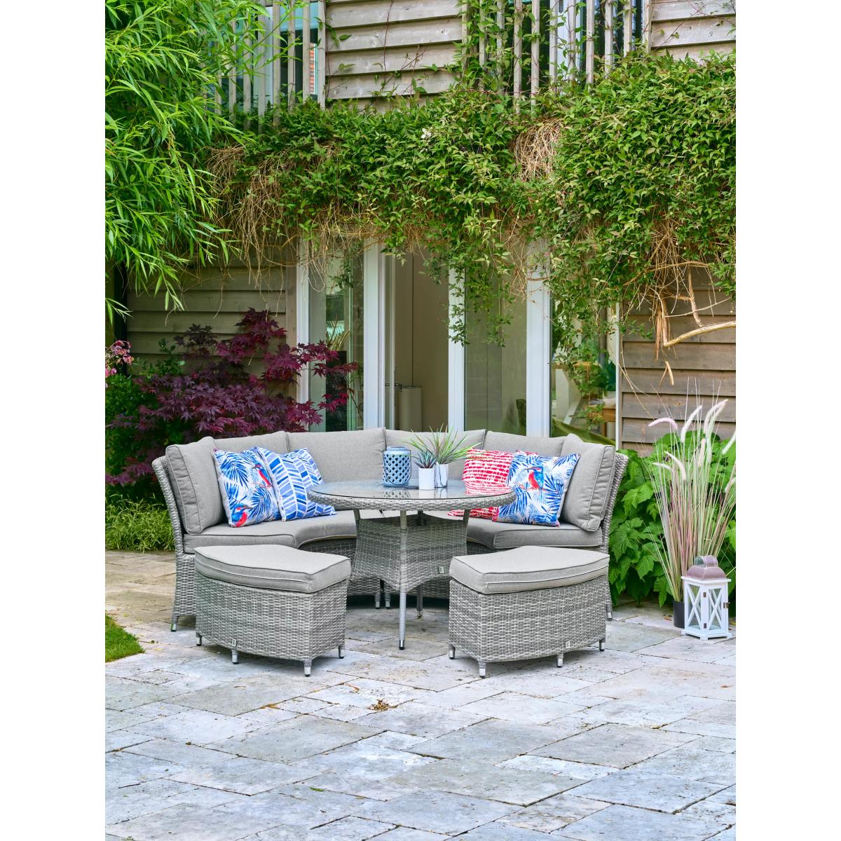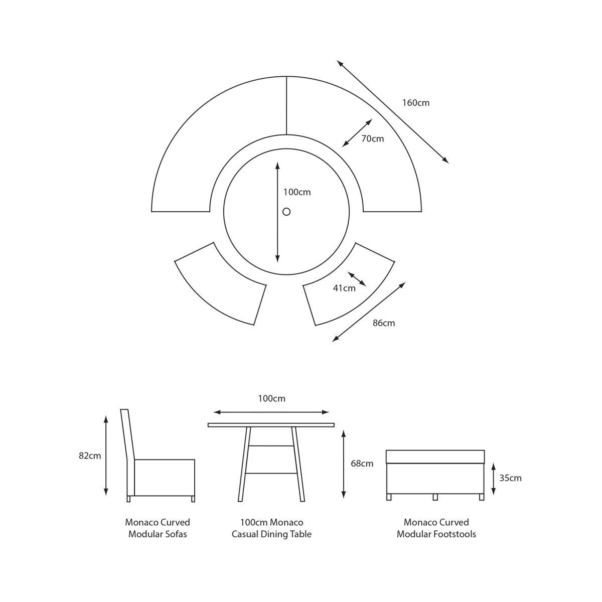 The Monaco range from LG Outdoor pairs robust aluminium frames with natural-looking, all-weather synthetic wicker. The furniture is lightweight, sturdy, weather-resistant and easy to maintain. This curved set is designed for comfort and casual dining outdoors. The round dining table has a 5mm-thick safety glass top. The six-seater curved sofa and two curved footstools are made of attractive Ever. Weave synthetic wicker. Season-proof Eden seat and backrest cushions in the range enhance your comfort and are water-repellent during light rainfall, fast-drying and are UV-resistant to prevent colour fading. The cushions have bull-nosed curved edges for added comfort and removable zip-up covers for easy cleaning. Store the cushions during persistent and heavy rain and over winter months. Key features: Round casual dining table with glass top and parasol hole Six-seater Ever. Weave synthetic wicker curved garden sofa and two matching footstools Sturdy aluminium frames Season-proof Eden seat and backrest cushions for comfort