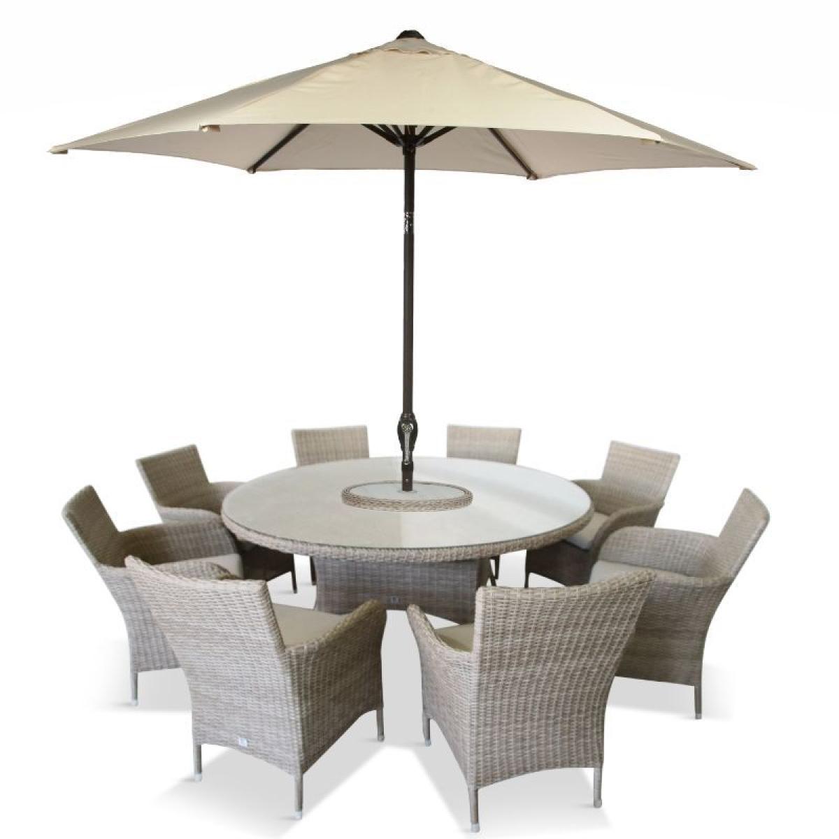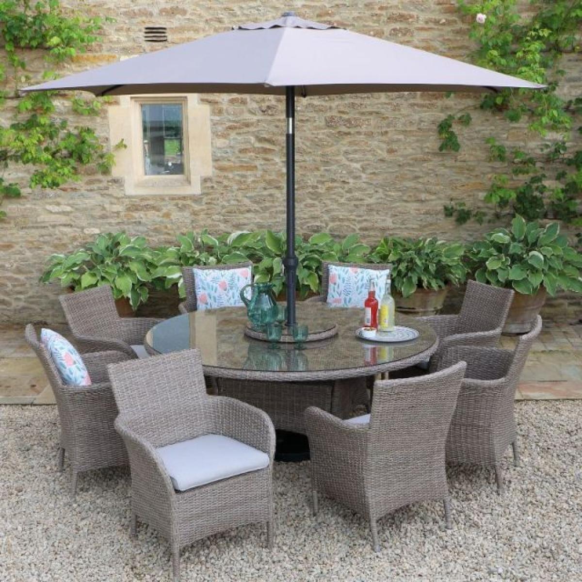 LG Outdoor's Monaco range is in a brand-new sand colour for Summer 2022. For those who want a quality weave product on a long-lasting, light aluminium frame, this is the range for you. With a classic design and details such as the curved arm dining chair and bullnose curved edge on the seat cushions for comfort, this traditional set is sure to keep its classic look for years to come. All LG Outdoor furniture sets have their patented Eden Season-proof cushions with a superior filling and natural feel fabric. Eden cushions bring you all the benefits of a weatherproof cushion, with no compromise on comfort. You can leave them outside all summer as they are water repellent and UV resistant, drying quickly so you can use within hours of getting them wet. The cushions are in a modern anthracite grey with zip cushion covers making them easily removable for cleaning. Eden cushions are StainSAF. E - using LG's unique technology to form an invisible barrier over every inch of the cushion fabric, so sponge clean a spill and the cushion will look brand new again! Even better, the Eden cushion filling is made from ECOCORE, a filling using recycled plastic bottles. LG are always looking at new ways in which they can help our environment. Why not add a flash of colour with a selection of our scatter cushions? Please note, the scatter cushions and accessories pictured are not included but you can view our range here. The LG Outdoor Deluxe Cover - 8 Seat Round Dining Set (DXCOV4) will fit this set Dining Table Dimensions: 74.5cm H x 165cm W x 165cm D Oak Armchairs Dimensions: 85cm H x 65cm W x 65cm D Parasol Dimensions: 240cm H x 300cm W x 300cm D 3 Year Warranty on Table and Chairs, 1 Year on Parasol A parasol base is available to purchase separately Scatter cushions are not included, but are available to purchase separately All screens vary in colour reproduction and whilst every effort has been made to display the colour as accurately as possible it is for guidance only.