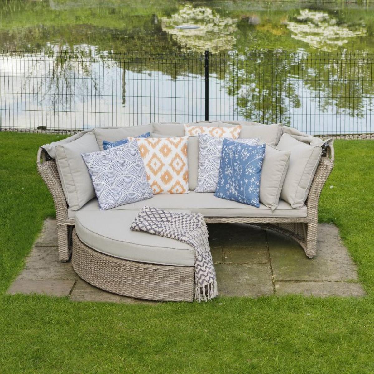 LG Outdoor's Monaco range is in a brand-new sand colour for the Summer season. For those who want a quality weave product on a long-lasting, light aluminium frame, this is the range for you. With a classic design and details such as the bullnose curved edge on the seat cushions for comfort, this traditional set is sure to keep its classic look for years to come. Our Monaco Daybed is the ultimate in stylish snoozing, with its comfortable cushions and shaded canopy. And relax... How will you configure our Daybed? There are 3 options! You can have the entire lower half extended for ample space to lie back, or have half tucked under the main canopy and half extended or the entire lower half tucks away to give a half moon section to sit on and enjoy your afternoon in the sun. Our daybed even includes a handy hidden storage compartment for cushions so you can put them away in the winter. All LG Outdoor furniture sets have their patented Eden Season-proof cushions with a superior filling and natural feel fabric. Eden cushions bring you all the benefits of a weatherproof cushion, with no compromise on comfort. You can leave them outside all summer as they are water repellent and UV resistant, drying quickly so you can use within hours of getting them wet. The cushions are in a modern anthracite grey with zip cushion covers making them easily removable for cleaning. Eden cushions are StainSAF. E - using LG's unique technology to form an invisible barrier over every inch of the cushion fabric, so sponge clean a spill and the cushion will look brand new again! Even better, the Eden cushion filling is made from ECOCORE, a filling using recycled plastic bottles. LG are always looking at new ways in which they can help our environment. Why not add a flash of colour with a selection of our scatter cushions? Please note, the scatter cushions and accessories pictured are not included but you can view our range here. This daybed has a footprint of 236cm x 236cm The LG Outdoor Deluxe Cover - 4 Seat Dining Set (DXCOV1) will fit this set This product has a 3-year warranty All screens vary in colour reproduction and whilst every effort has been made to display the colour as accurately as possible it is for guidance only.