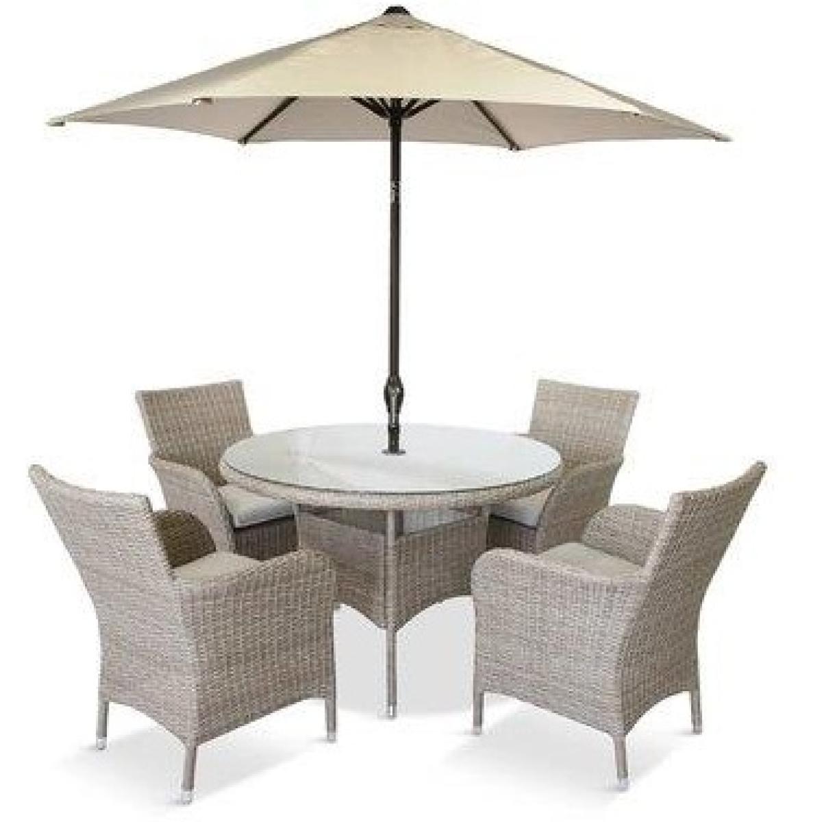 The timeless design of the Monaco 4 Seater Dining Set in Sand is stunning with its natural colour tones. Our Monaco range is our perennial best seller. The Monaco has multi-toned polymer Ever. Weave for more realistic rattan effect colour. The chairs come with elegantly curved arms and a bull-nosed curved edge on seat cushions for comfort. Each seat has Season-proof Eden Cushions which are water repellent, UV resistant, quick drying with removeable zip covers for easy cleaning. The set includes a 2.5m Parasol. The Table & Chair Frames are manufactured aluminium. The table to tapped with 5mm Safety Glass. 3 Year Manufacturers Warranty Chair Dimensions H85cm x W 65cm x D 65cm Table Dimensions H74cm x 110cm Diameter Parasol base sold separately The LG Outdoor Deluxe Cover 4 Seat Dining Set (DXCOV01) will fit this set. All screens vary in colour reproduction and whilst every effort has been made to display the colour as accurately as possible it is for guidance only.