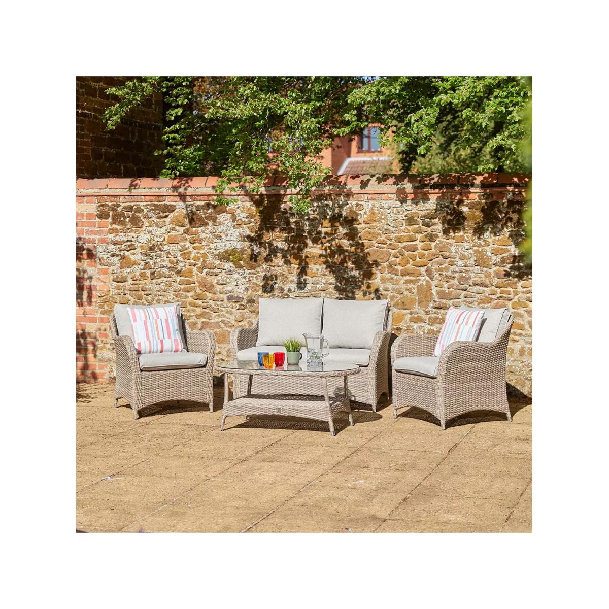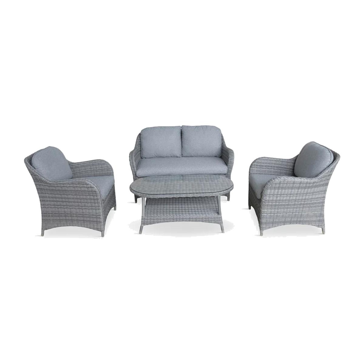 Sophisticated garden furniture, the Monte Carlo collection from LG Outdoor offers lasting comfort. Crafted in classic 2-ply Ever. Weave on aluminium frames, the range is completed with upholstered seat and backrest cushions finished with piped edges. This four-seater lounge set includes an oval garden coffee table with a toughened glass top. Key features: Two garden lounge chairs and a two-seater sofa in 2-ply Ever. Weave polyrattan Oval garden coffee table with toughened glass top Lightweight yet robust aluminium frames Upholstered seat and backrest cushions with piped edges Easy to maintain