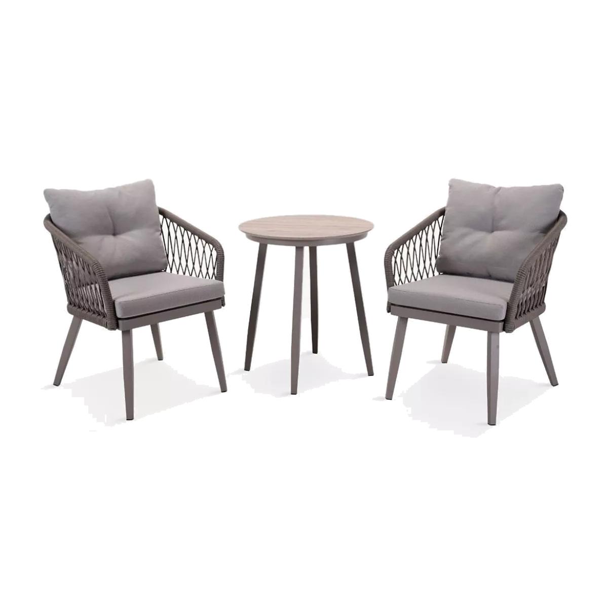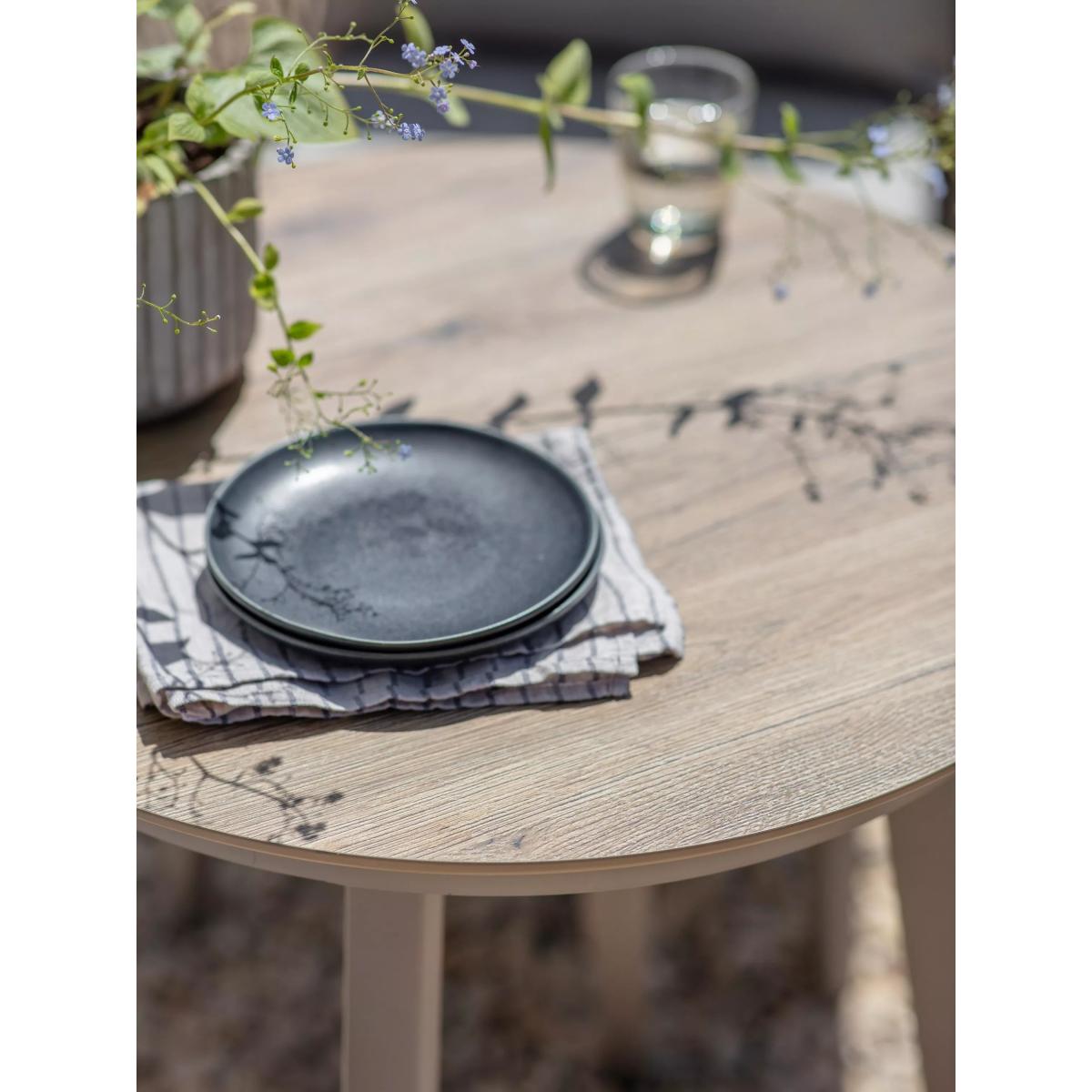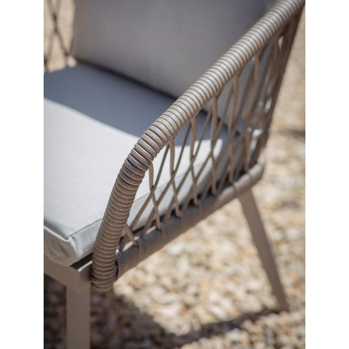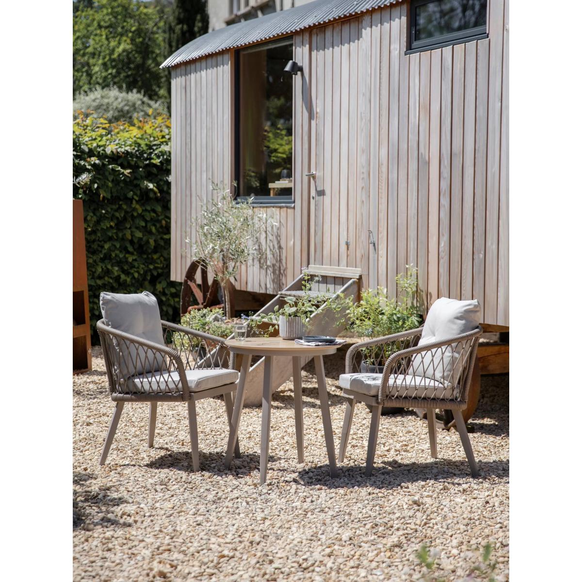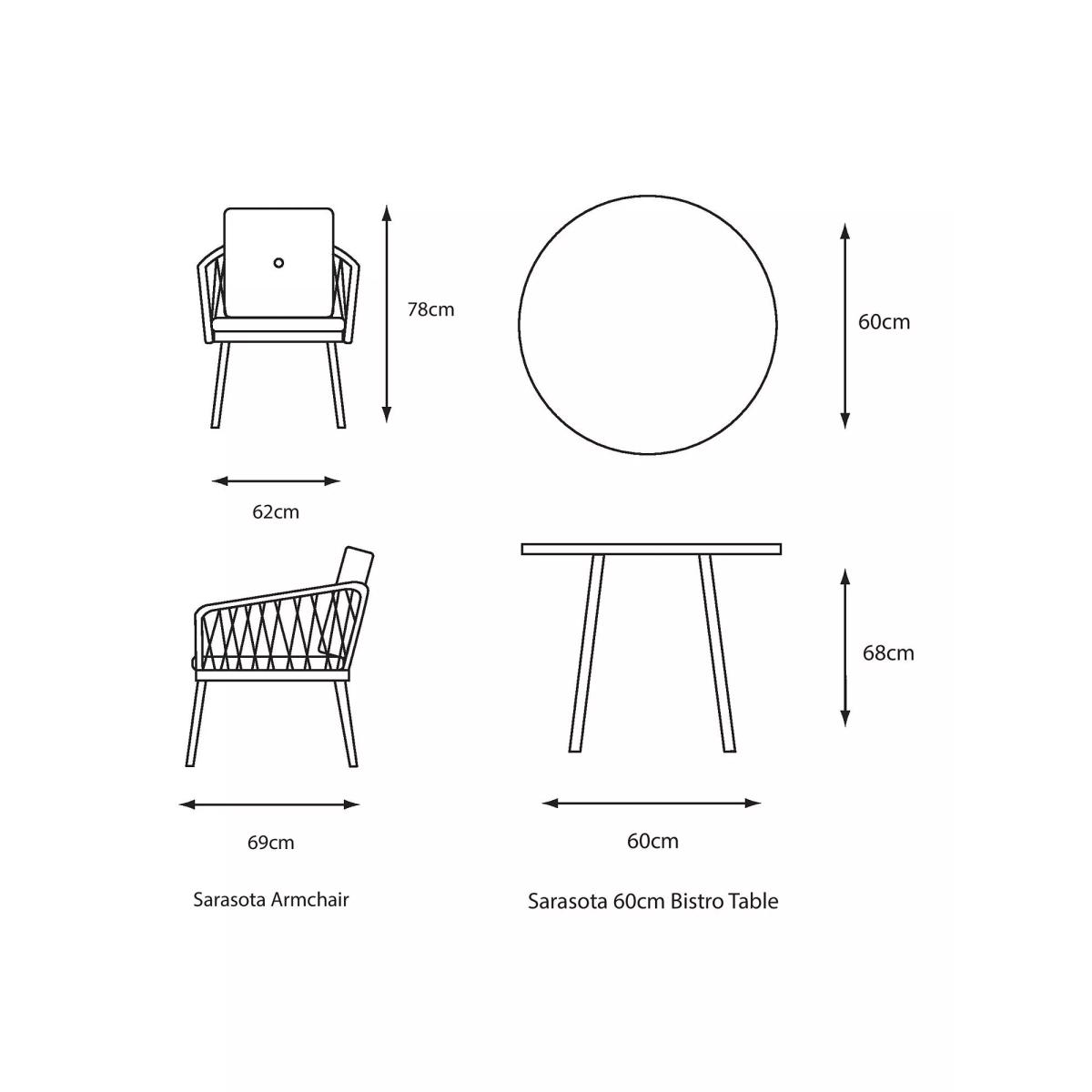 The Sarasota range from LG Outdoor pairs robust aluminium frames with an Ever. Rope synthetic rope weave in a lattice design that looks like real rope. The furniture is lightweight, sturdy, weather-resistant and easy to maintain. This two-seater bistro dining set from the range comes with shower-proof cushioning to enhance your comfort. The cushioning is water-repellent during light rainfall, fast-drying and UV-resistant to prevent colour fading. Store the cushions during persistent and heavy rain and over winter months. Key features: Two garden armchairs made of Ever. Rope synthetic rope weave in mottled sand colour Round bistro table with wood-effect High Pressure Laminate top Sturdy aluminium frames in taupe Shower-proof fabric seat and backrest cushions