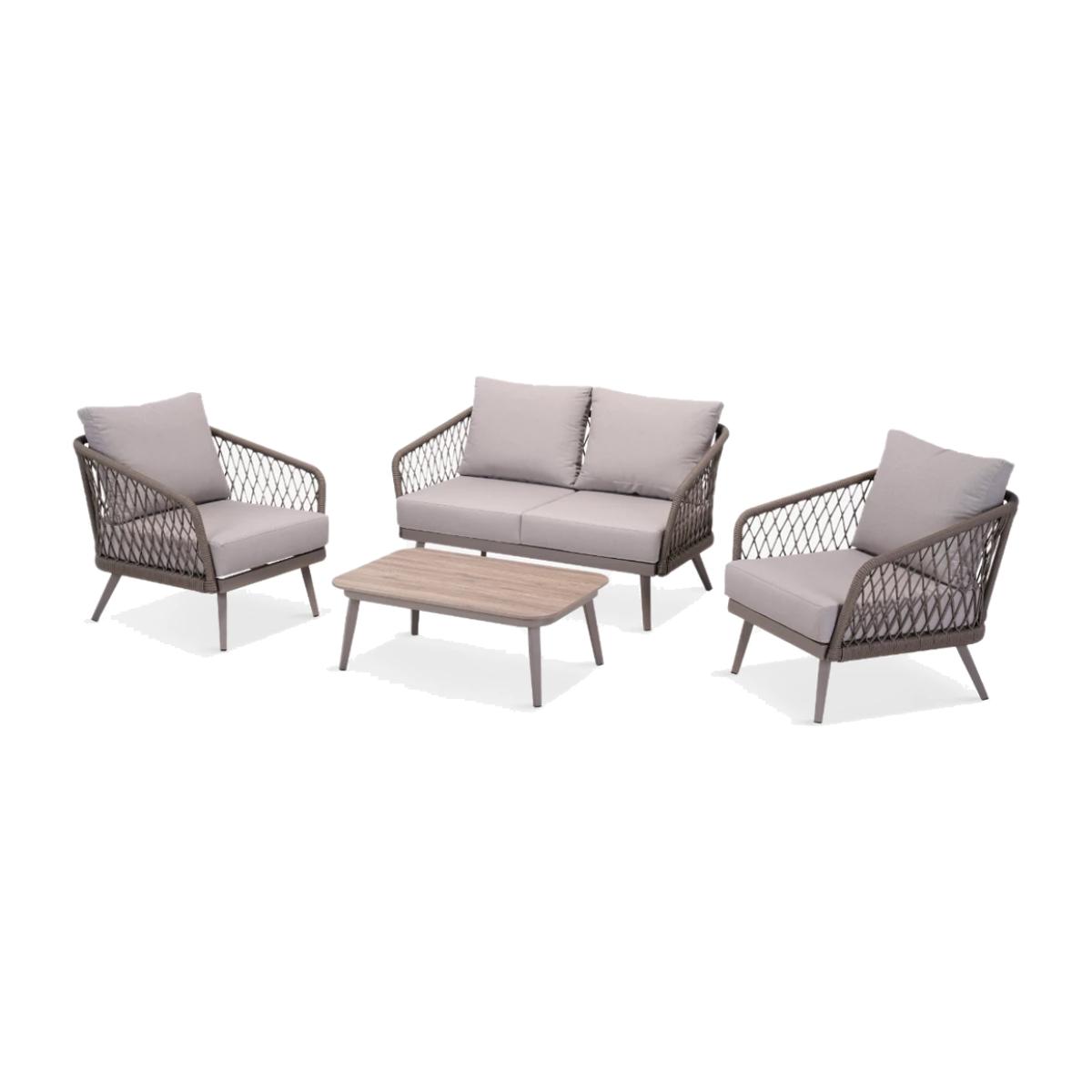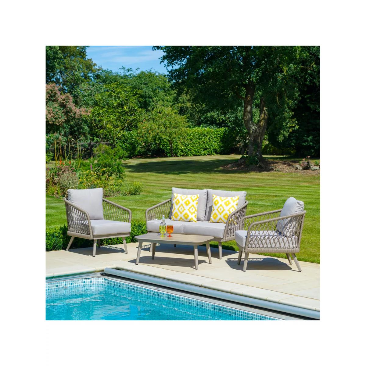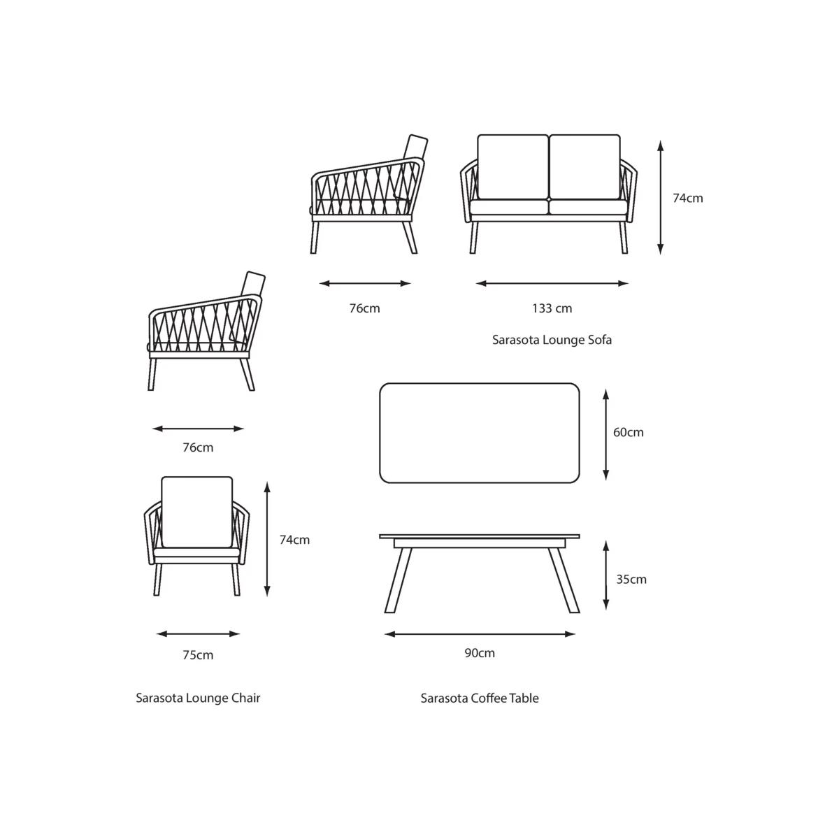 The Sarasota range from LG Outdoor pairs robust aluminium frames with an Ever. Rope synthetic rope weave in a lattice design that looks like real rope. The furniture is lightweight, sturdy, weather-resistant and easy to maintain. This four-seater garden lounge set from the range comes with a rectangular coffee table with a wood-effect top. Seating comes with shower-proof cushioning to enhance your comfort. The cushioning is water-repellent during light rainfall, fast-drying and UV-resistant to prevent colour fading. Store the cushions during persistent and heavy rain and over winter months. Key features: Two-seater sofa and two armchairs made of Ever. Rope synthetic rope weave in mottled sand colour Rectangular coffee table with wood-effect High Pressure Laminate top Sturdy aluminium frames in taupe Shower-proof fabric seat and backrest cushions