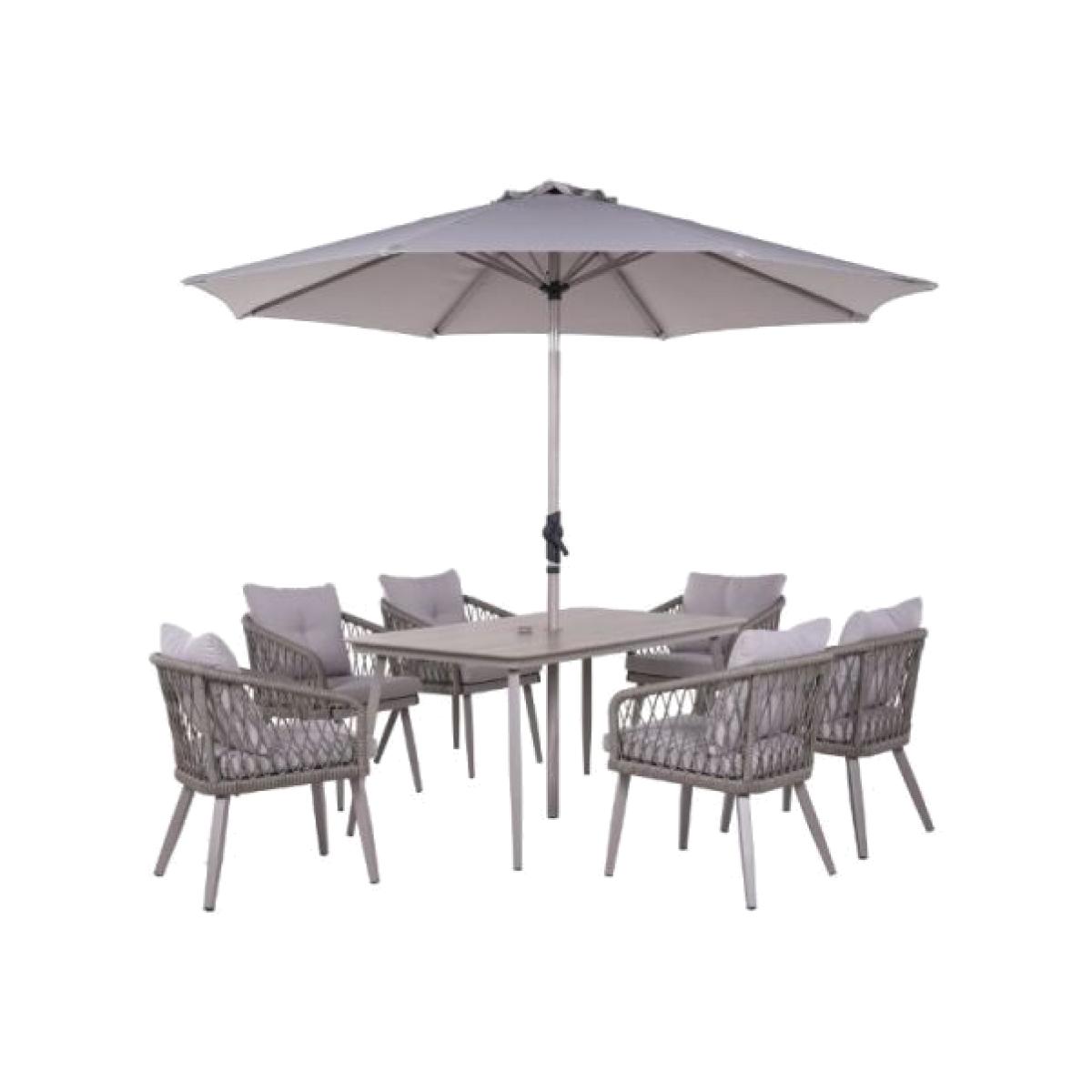 The Sarasota range is tactile and gorgeous, perfectly on trend for 2022, with a focus on textures and a return to nature. Natural tones of sand rope set in retro shapes with a lattice weave design will bring any outdoor space up to date in the style shakes. The legs are manufactured from aluminium, with a taupe powercoating finish making them maintenance free. These sets come with a HPL table top. HPL is High Pressure Laminate this is constructed by layers of cellulose fibres being heated up and pressure treated to form a tough, non porous finish which is weatherproof and maintenance free. Our Everrope PE rope looks just like natural rope, with a blended colour palette and imprinted rope texture, but with the benefits of high quality polyethylene so it's strong, UV resistant and 100% waterproof. All LG Outdoor furniture sets have their patented Eden Season-proof cushions with a superior filling and natural feel fabric. Eden cushions bring you all the benefits of a weatherproof cushion, with no compromise on comfort. You can leave them outside all summer as they are water repellent and UV resistant, drying quickly so you can use within hours of getting them wet. The cushions are in a modern anthracite grey with zip cushion covers making them easily removable for cleaning. Eden cushions are StainSAF. E - using LG's unique technology to form an invisible barrier over every inch of the cushion fabric, so sponge clean a spill and the cushion will look brand new again! Even better, the Eden cushion filling is made from ECOCORE, a filling using recycled plastic bottles. LG are always looking at new ways in which they can help our environment. Don't forget to add some additional scatter cushions for a pop of colour on a summer's day. You can view our range here. 3 Year Warranty on Table and Chairs, 1 Year Warranty on Parasol Chair Dimensions - 78cm x 62cm x 69cm - Table Dimensions - 74cm x 90cm x 150cm The LG Outdoor Deluxe Cover - 6 Seat Round Dining Set (DXCOV2) will fit this set All screens vary in colour reproduction and whilst every effort has been made to display the colour as accurately as possible it is for guidance only.