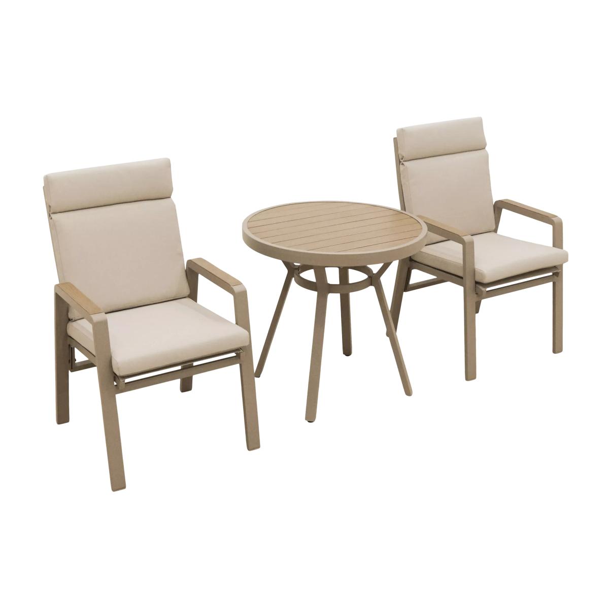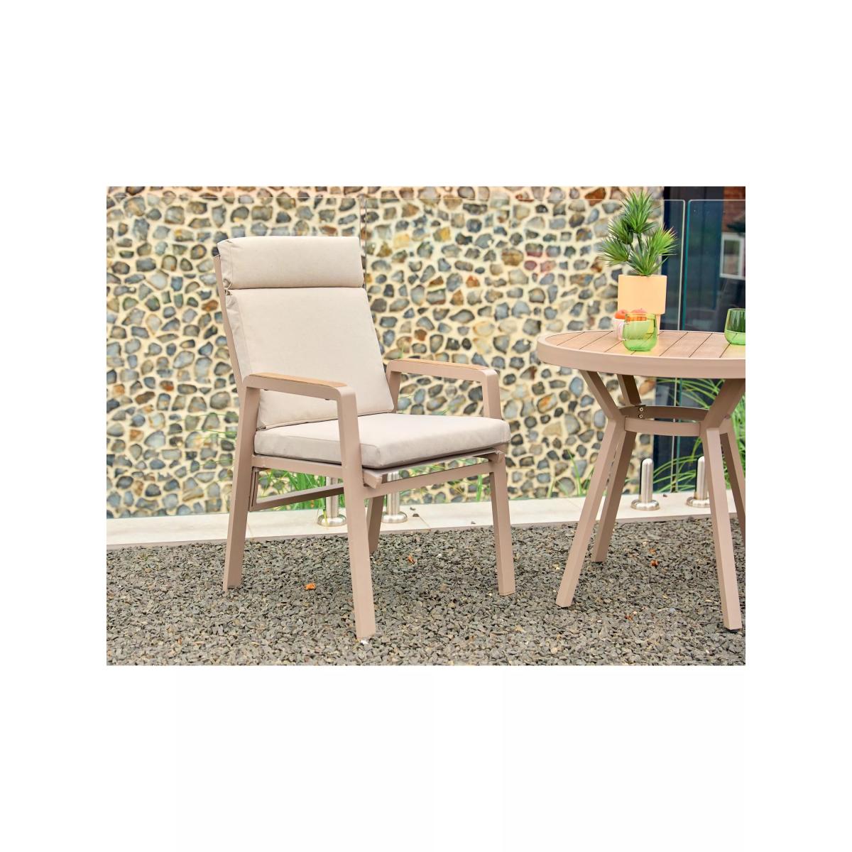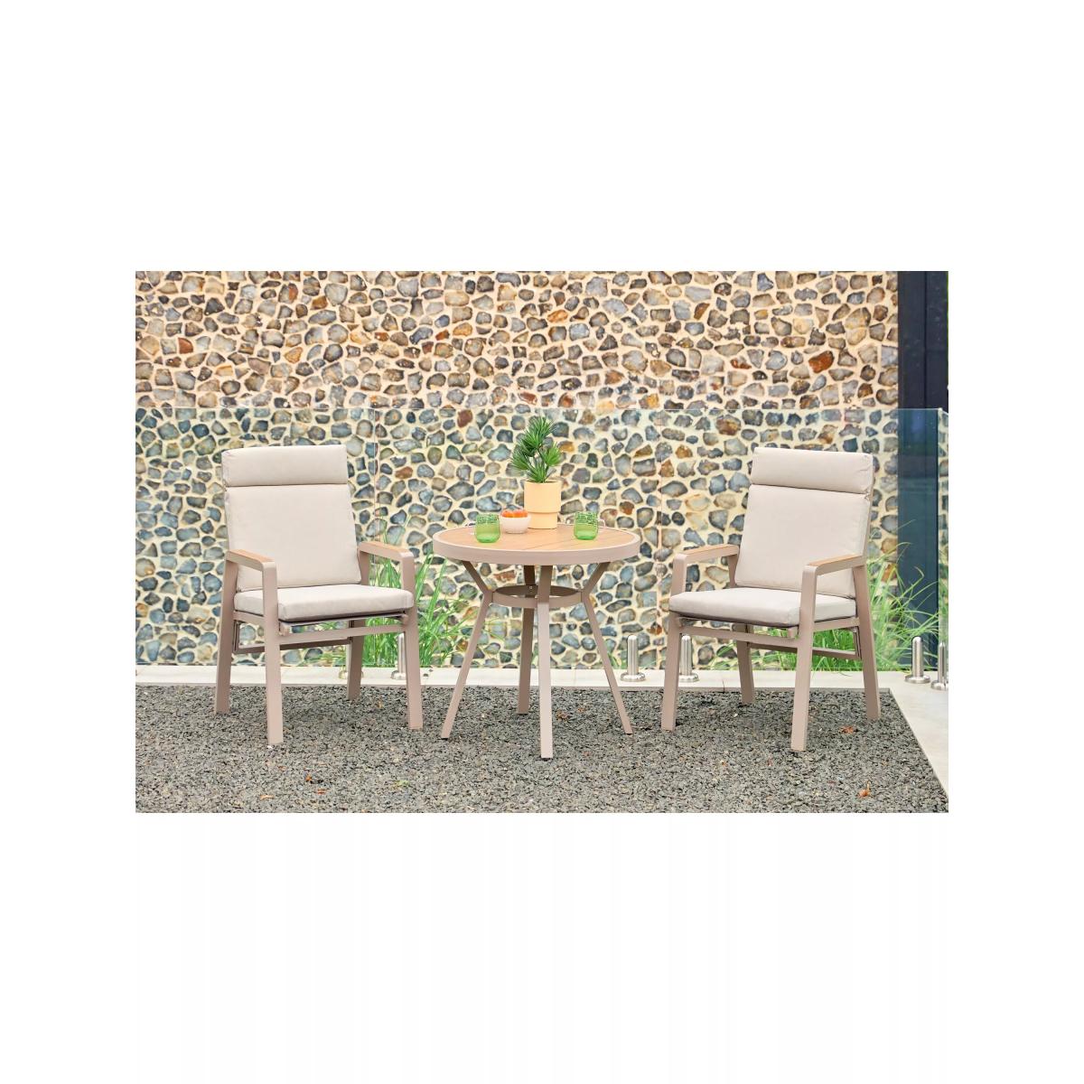 Relax outdoors at home with the Sorrento garden furniture range from LG Outdoor. The frames and tabletops are made of lightweight yet robust hand-brushed wood-effect powder-coated aluminium. Seating comes with season-proof cushions that are water-repellent, stain-resistant, UV-resistant and quick-drying. Key features: Two garden dining chairs Round garden bistro table Robust yet lightweight powder-coated aluminium frames and tabletop with brushed wood-effect finish Season-proof seat and backrest cushions for comfort Easy to maintain