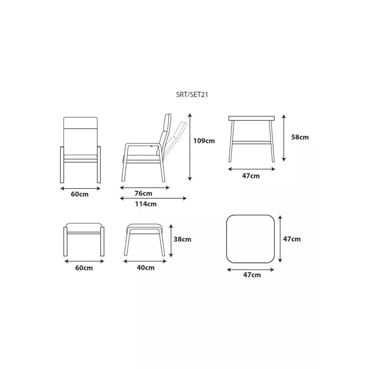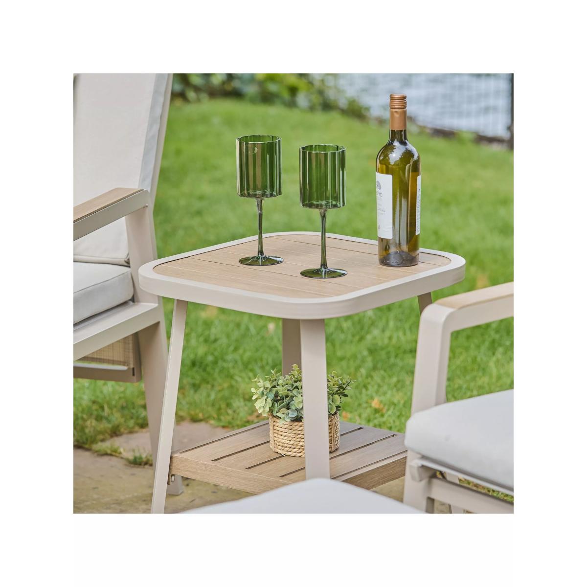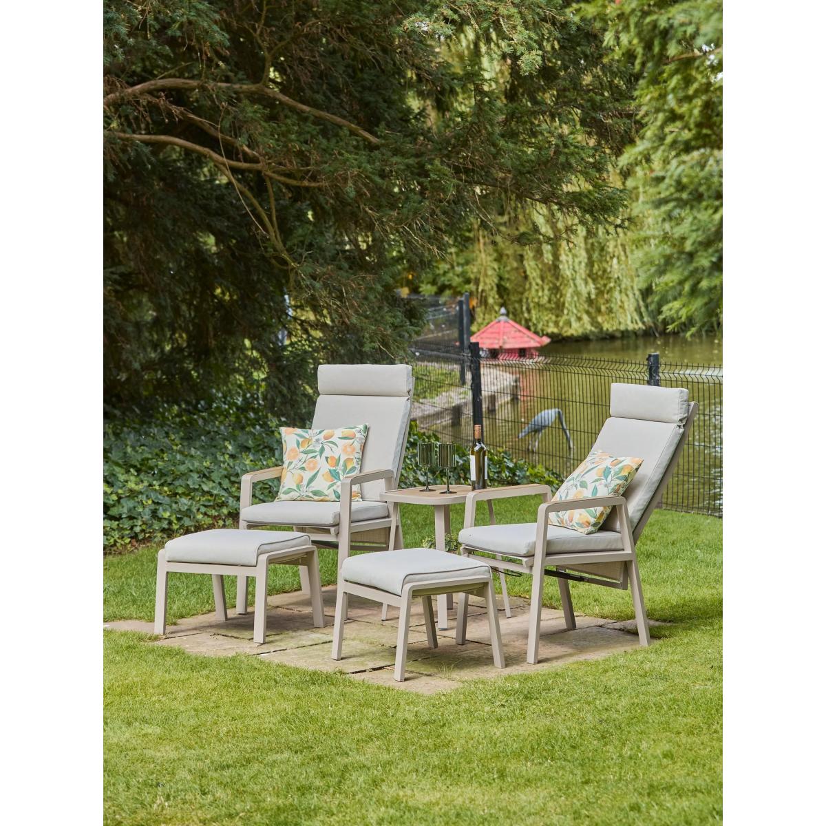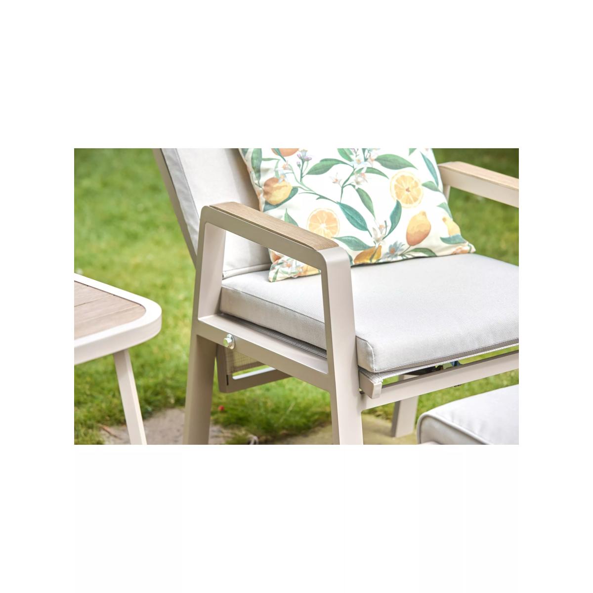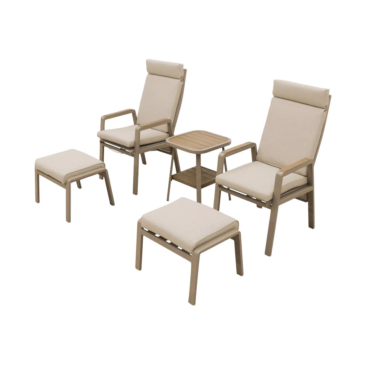 Relax outdoors at home with the Sorrento garden furniture range from LG Outdoor. The frames and tabletops are made of lightweight yet robust hand-brushed wood-effect powder-coated aluminium. Seating comes with season-proof cushions that are water-repellent, stain-resistant, UV-resistant and quick-drying. Key features: Two reclining garden armchairs with footstools Square garden side table with lower shelf Robust yet lightweight powder-coated aluminium frames and tabletop with brushed wood-effect finish Season-proof seat and backrest cushions for comfort Easy to maintain