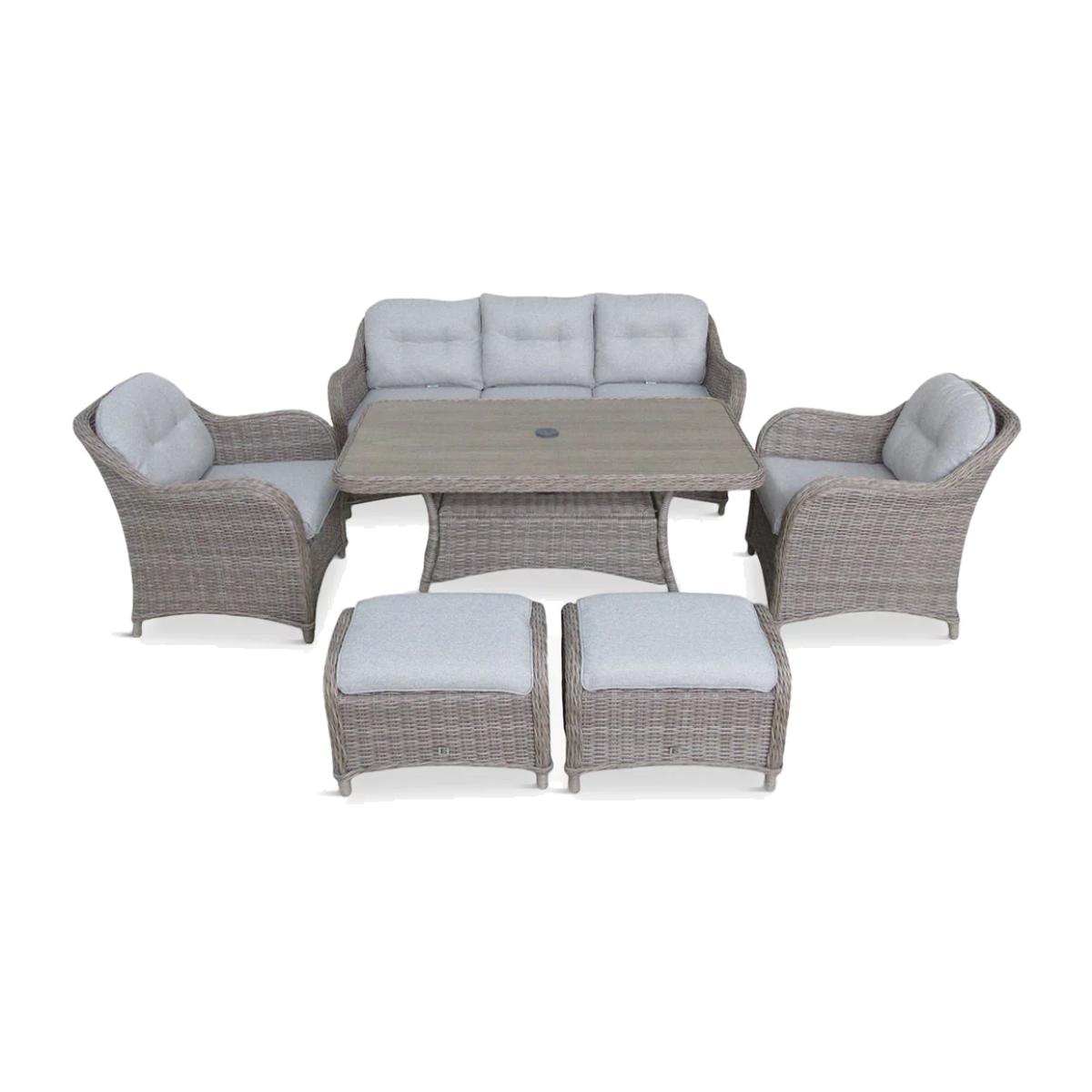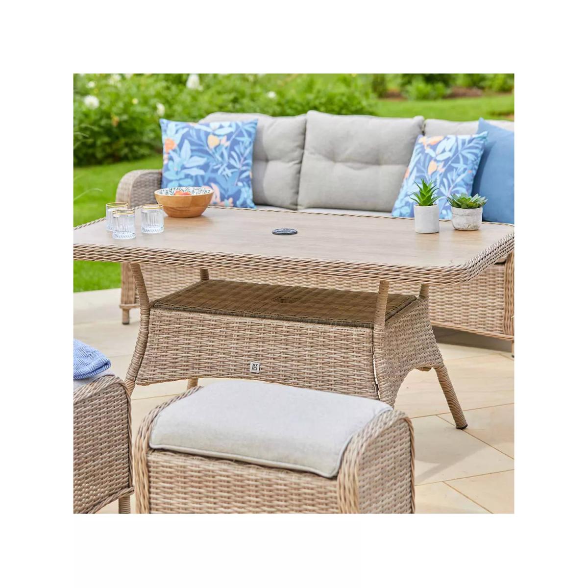 Classic design with premium craftsmanship, St Tropez garden furniture from LG Outdoor is distinguished by its twisted weave trim that adds a touch of luxury. Crafted in Ever. Weave on aluminium frames, the range is completed with plush cushions for comfort. This seven-seater garden lounge set includes a rectangular coffee table. Elegant and durable, the table has a ceramic-coated, wood-effect glass top and a parasol hole in the middle. Key features: Three-seater garden sofa, two garden lounge chairs and two garden footstools Rectangular garden coffee table with a ceramic-coated, wood-effect glass top and parasol hole Seating in Ever. Weave polyrattan with twisted weave trim Lightweight yet robust aluminium frames Plush seat and backrest cushions Easy to maintain