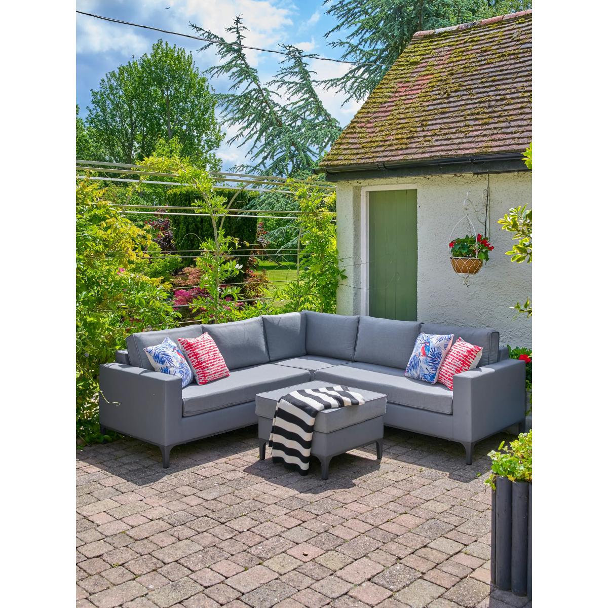 The Stockholm range from LG Outdoor is a contemporary design for the garden or conservatory with robust aluminium frames and season-proof Eden cushions. This five-seater modular lounging set is lightweight, sturdy, weather-resistant and easy to maintain. This modular set includes a pair of two-seater sofas plus a corner seat. Position the set to suit your space. The square ottoman doubles as a coffee table. Season-proof Eden cushioned seating and backrests in the range enhance your comfort and are water-repellent during light rainfall and are UV-resistant to prevent colour fading. The cushions are stain-resistant and need only simple sponge-cleaning to tackle spills. They're made with a superior 'comfort filling' and a natural-feel fabric. Store the cushions during persistent and heavy rain and over winter months. Key features: Five-seater modular corner lounging set Ottoman doubles as a coffee table Sturdy, lightweight aluminium frames Seat height: 58cm Season-proof Eden cushions Want to see it first? You may want to see and get a feel for the product in one of our shops before ordering. We'll be able to tell you where the range you'd like to view is on display.