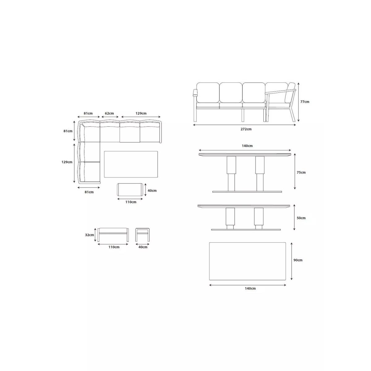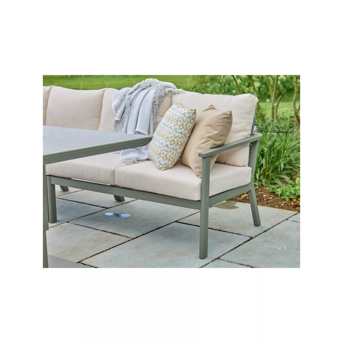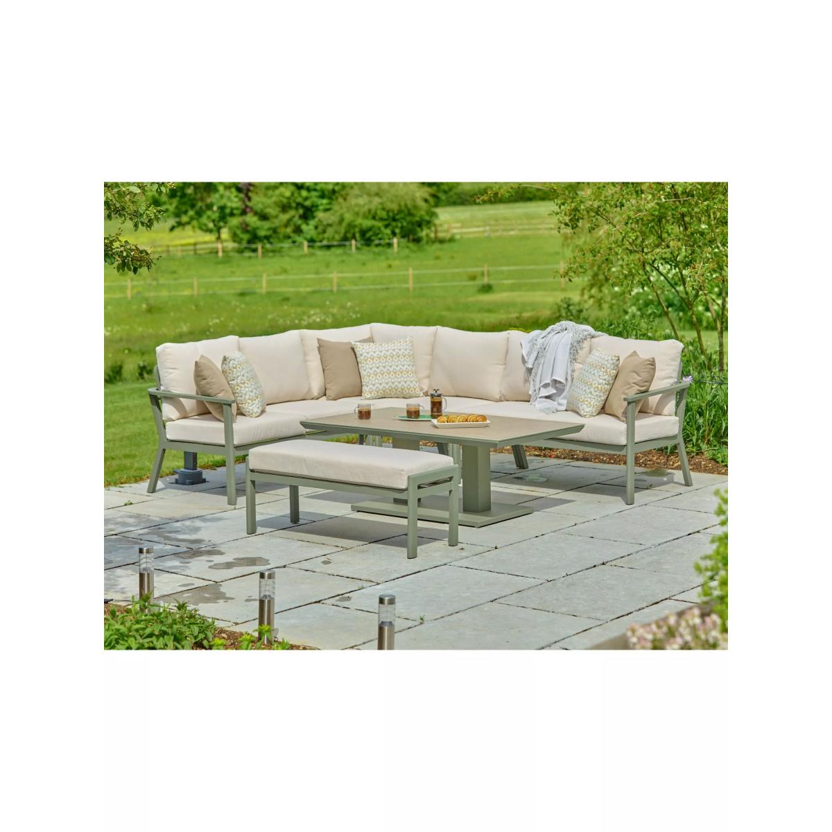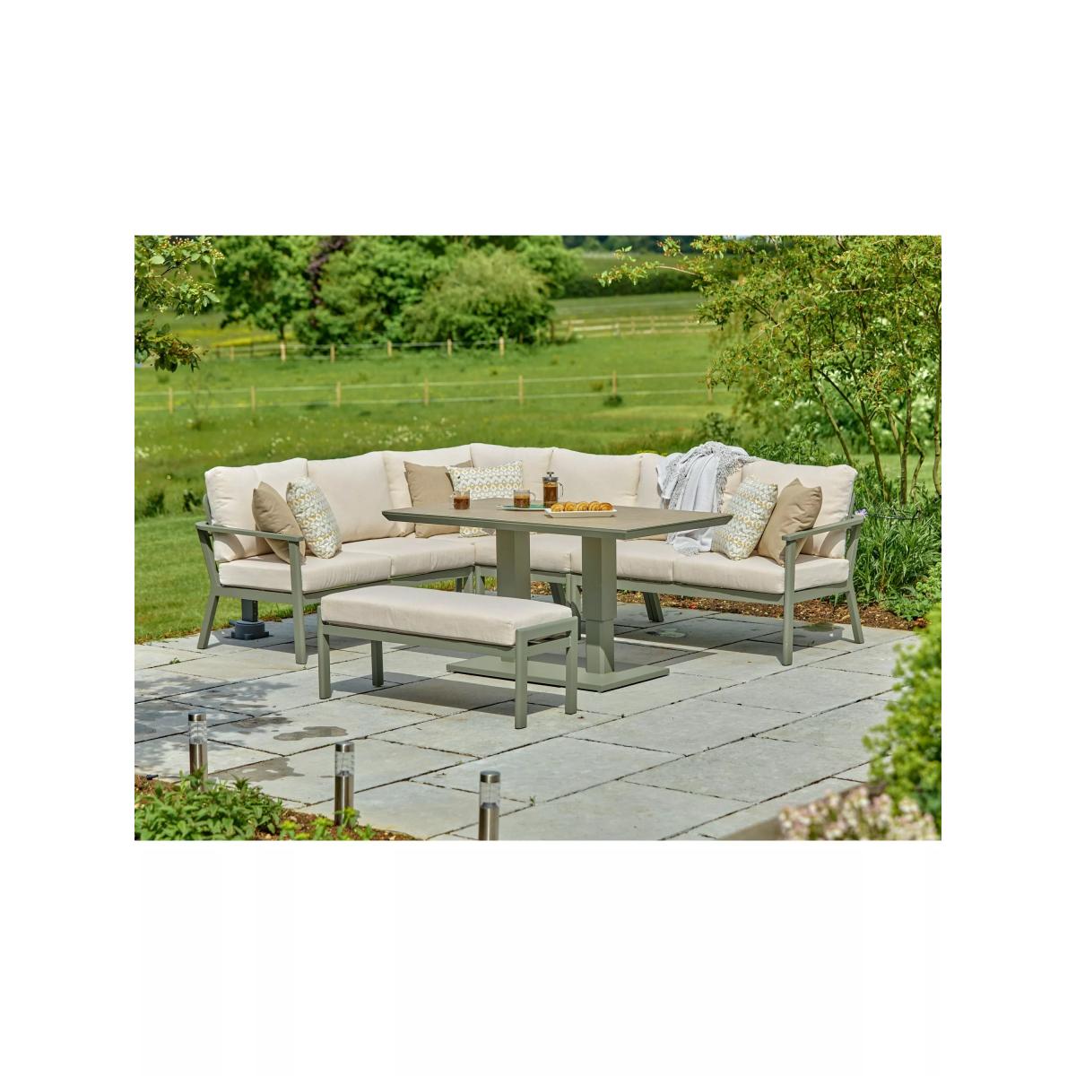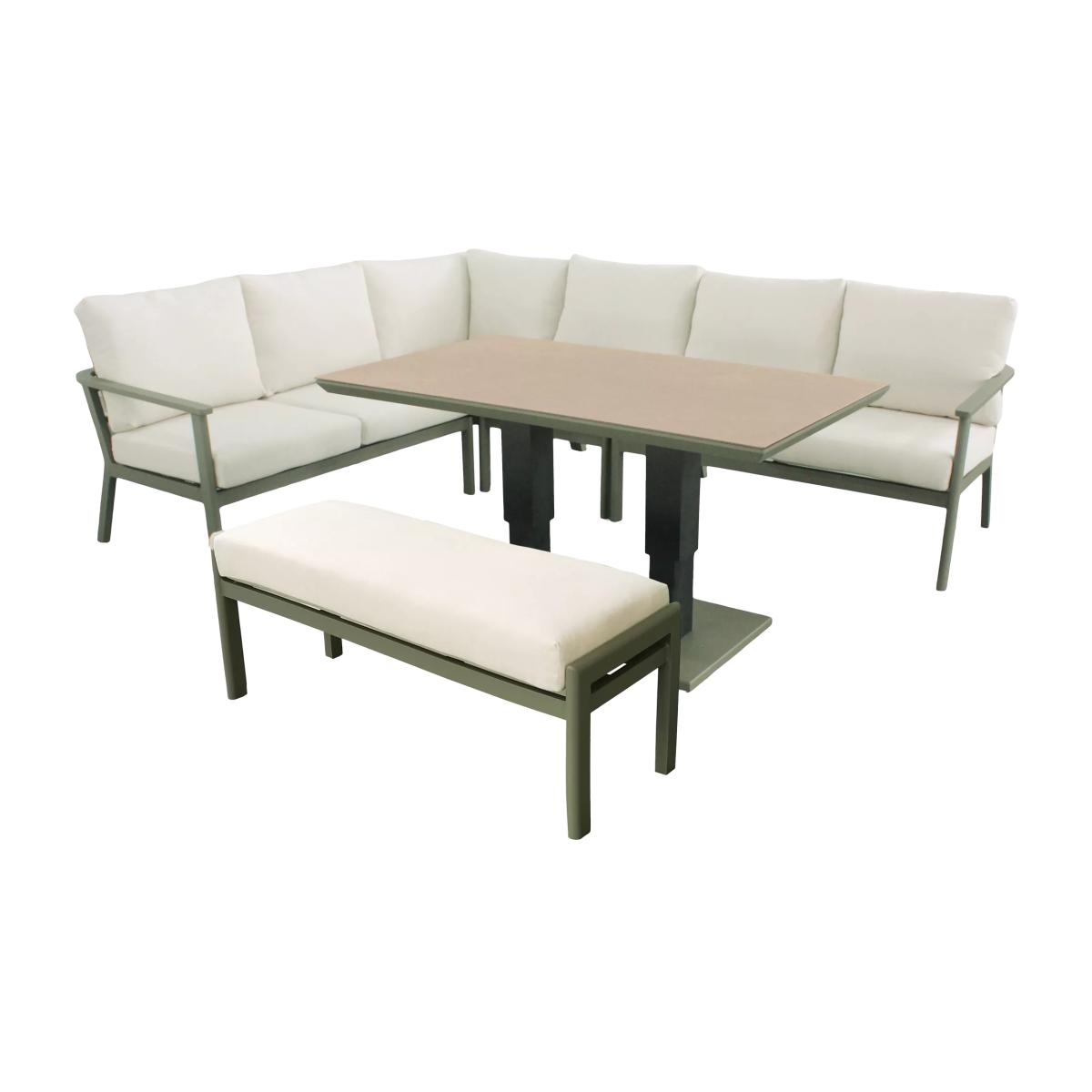 Enjoy luxury outdoors with the Tuscany garden furniture range, featuring lightweight yet sturdy powder-coated aluminium frames. The durable furniture is weather and UV-resistant, using premium materials such as ceramic printed safety glass table tops, along with stain-resistant all-weather fabric and season-proof cushions for comfort. This modular design includes a six-seater corner sofa, a double stool and a rectangular table that's height adjustable to take it from a coffee table to a casual dining table. Key features: 6-seater corner modular sofa set and double stool Height-adjustable rectangular garden table with ceramic printed safety glass top Lightweight yet robust aluminium frames Stain-resistant all-weather fabric and season-proof seat and backrest cushions Easy to maintain