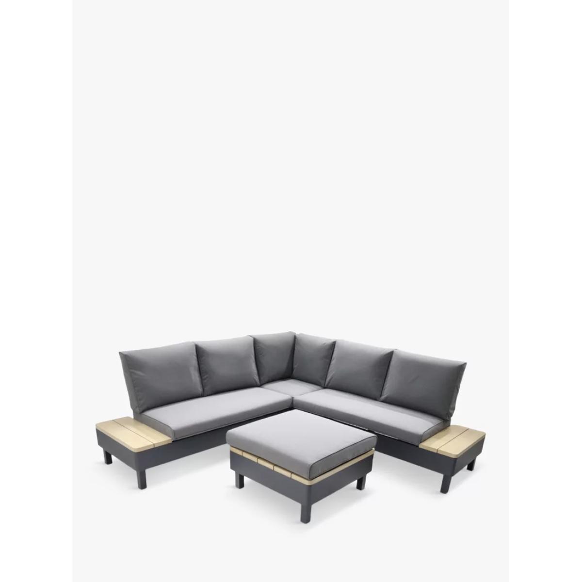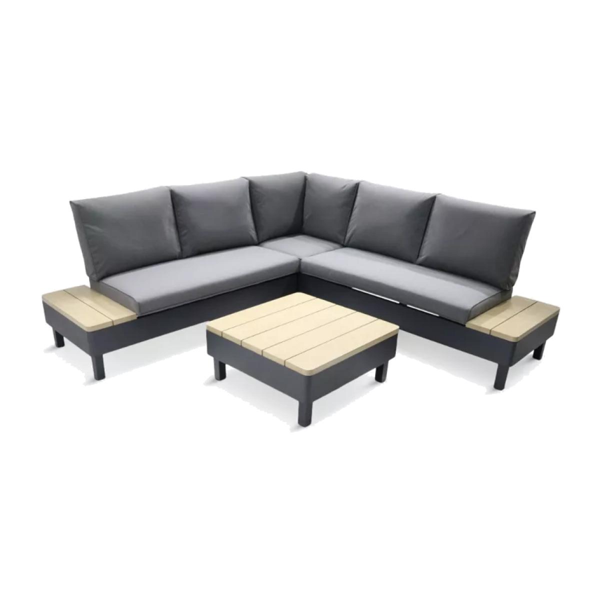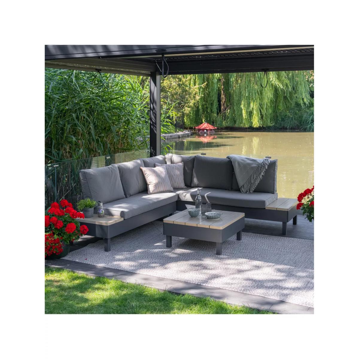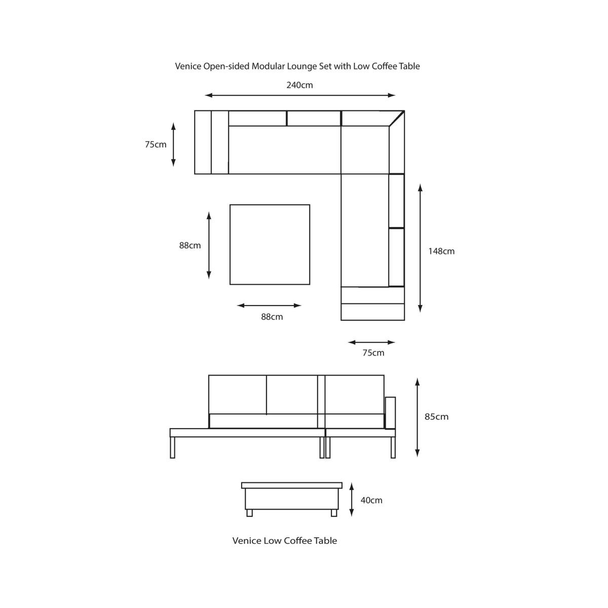 Sleek, contemporary design meets cutting-edge technology in the Venice collection from LG Outdoor. The range has the look and feel of indoor furniture, with the technology designed for outdoors. This open-sided five-seater modular corner lounge set has robust, durable aluminium frames with all-weather fabric cushioned seating. The sofa set's wood-effect side tables match the square wood-effect low coffee table that converts into extra seating with its included cushion. Key features: Modular five-seater open-sided corner sofa with wood-effect side tables Square low coffee table with wood-effect top and optional square cushion Robust aluminium frames All-weather fabric cushioning Easy to maintain