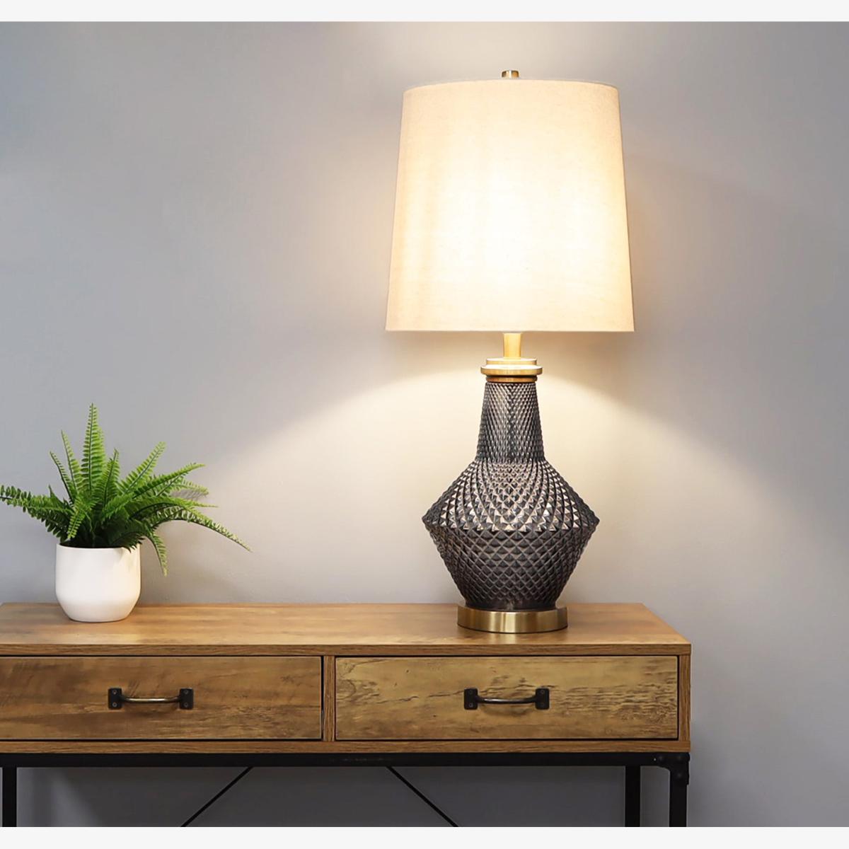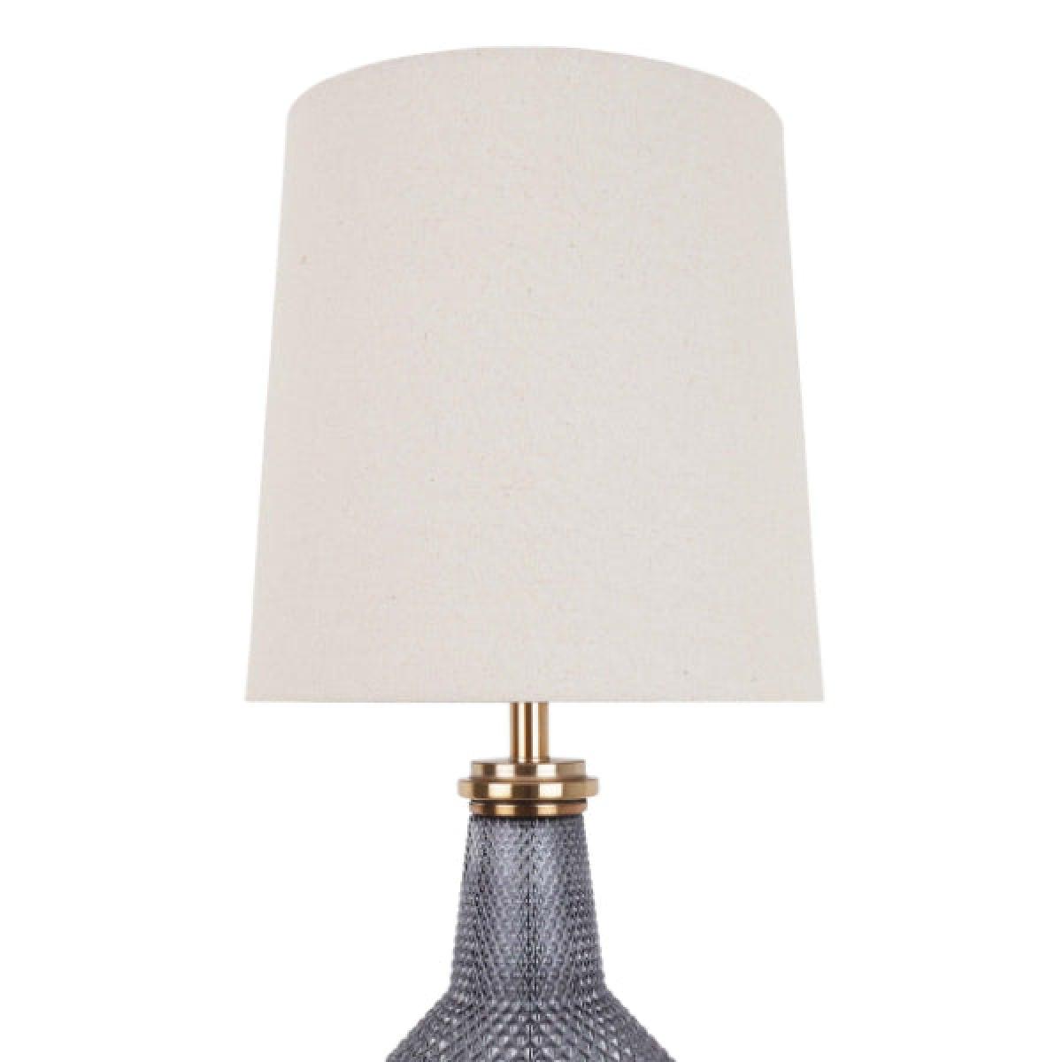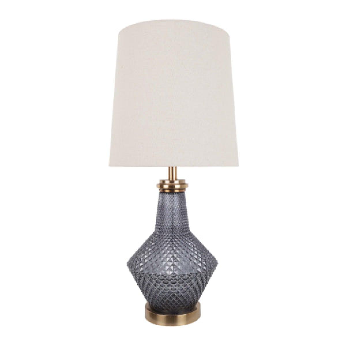 Gorgeous textured glass table lamp with natural shade This spectacular table lamp is a stunning feature piece suitable for any home. Its textured smoked glass is complimented with antique brass detailing and tastefully finished with a natural cotton shade. This striking table lamp will  pair with modern and traditional homes alike.   Gorgeous textured glass table lamp with natural shade This spectacular table lamp is a stunning feature piece suitable for any home. Its textured smoked glass is complimented with antique brass detailing and tastefully finished with a natural cotton shade. This striking table lamp will  pair with modern and traditional homes alike.