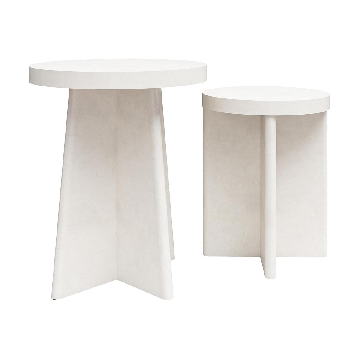 Introducing the Liam collection by Ameriwood Home, blending sleek minimalism with inviting textures in a stunning faux plaster living room set. This set of two round end tables adds a touch of elegance to any space. Perfect beside a chair, in a corner to showcase decor, or next to your sofa for convenient access to your drinks. The two side tables complement each other with tapered X-shaped pedestal bases of varying heights, offering maximum versatility. Crafted from durable engineered wood and MDF, these tables boast both style and affordability. With simple slide assembly, these tables are easy to put together, consisting of just three pieces each. Upgrade your living room with this chic and practical furniture set.