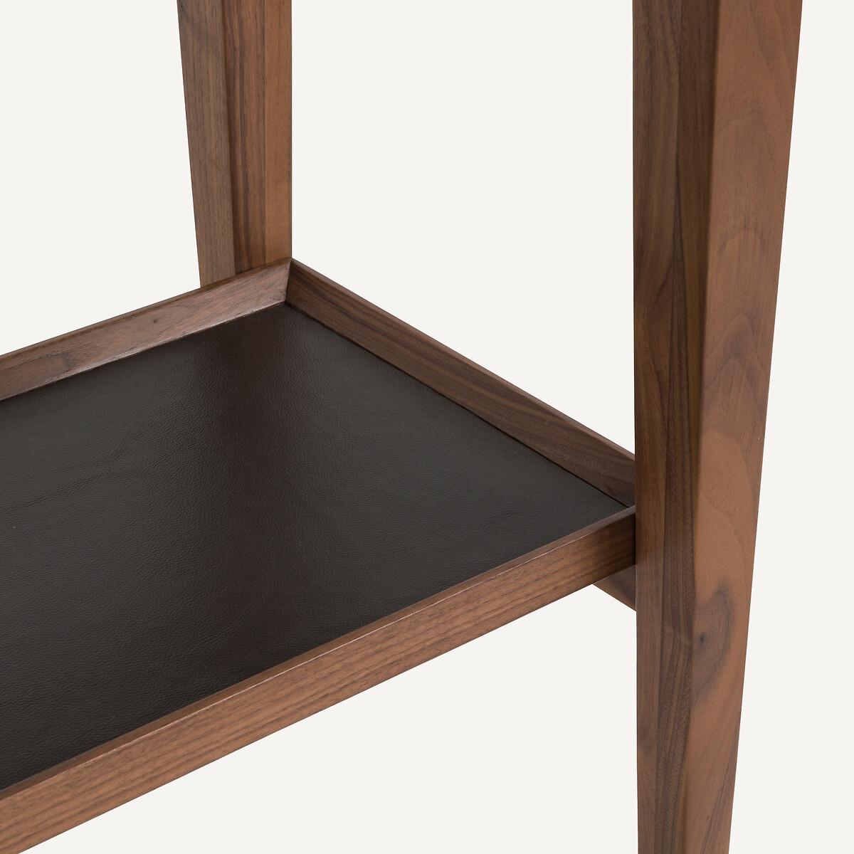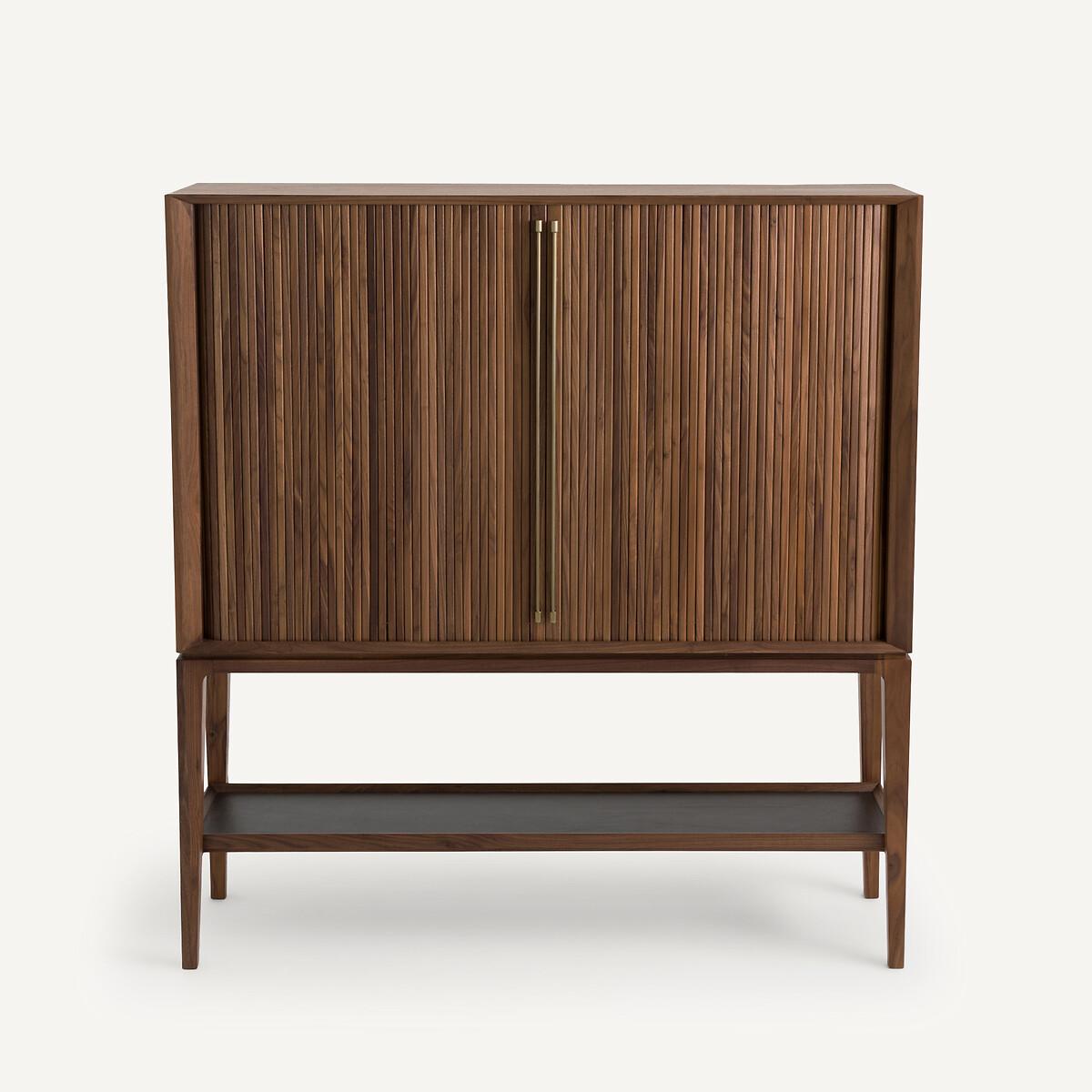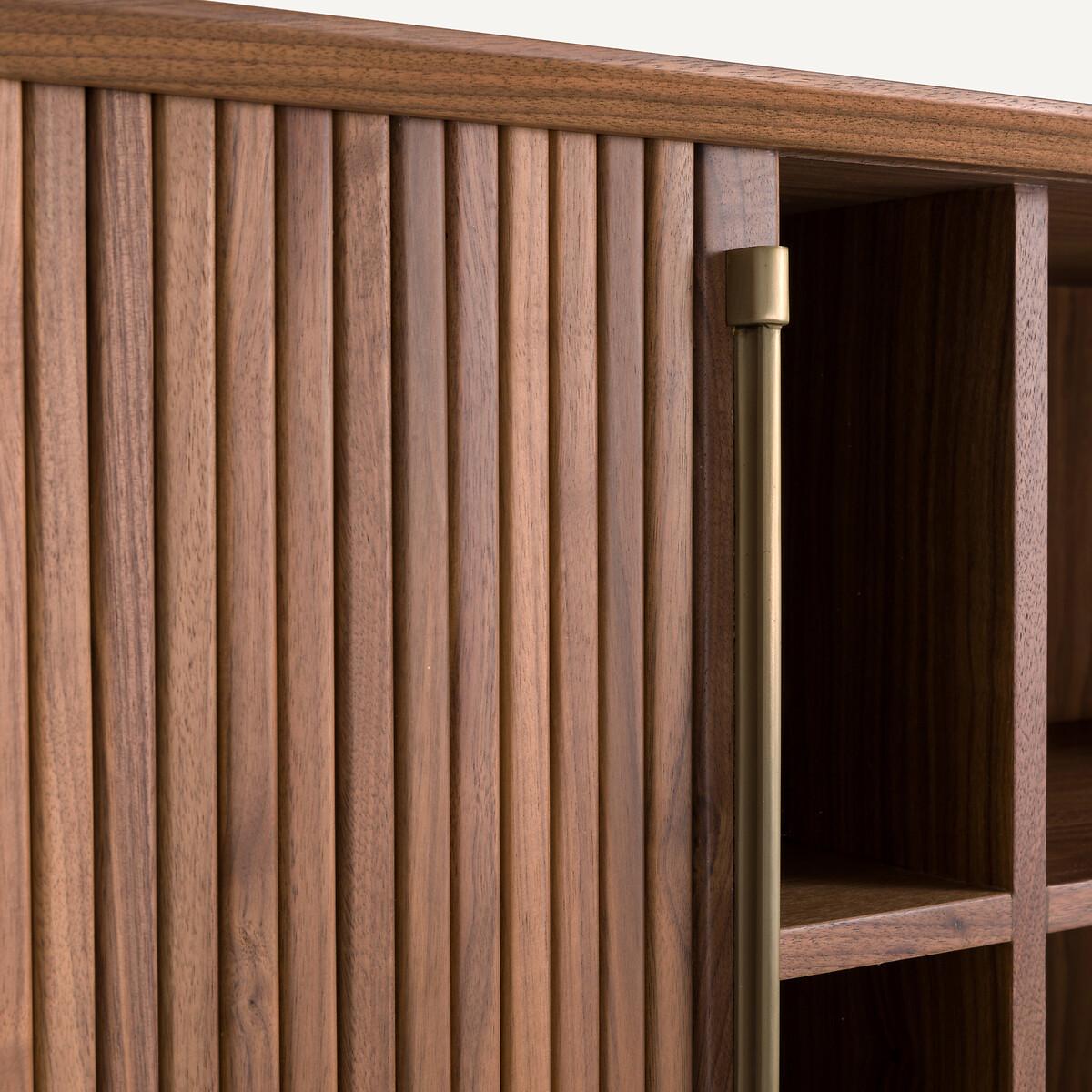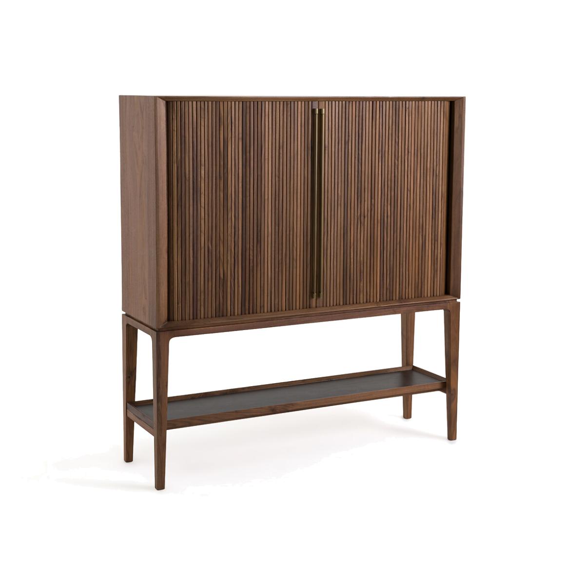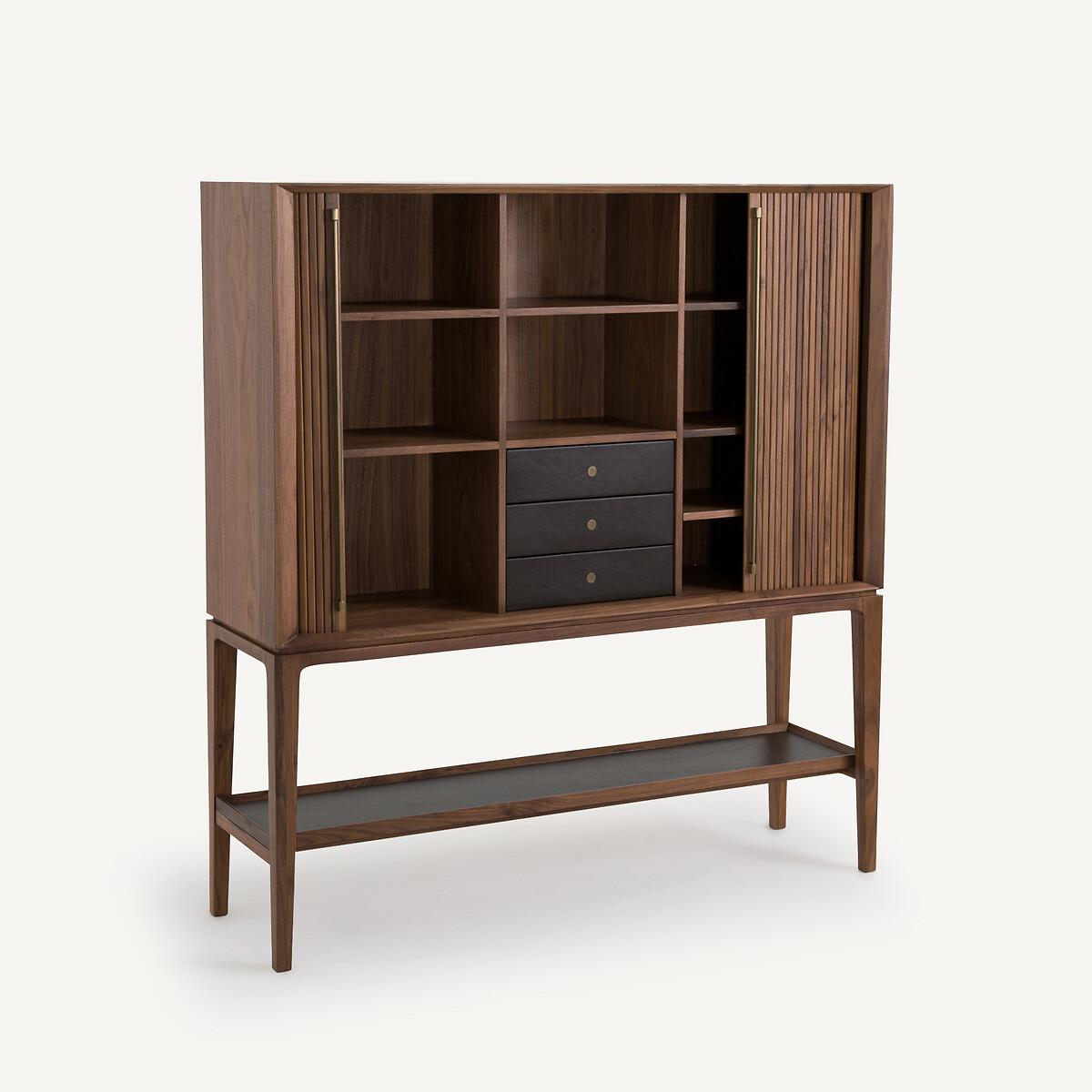 The Liamca high sideboard combines aesthetics and functionality with its many storage spaces. Its thin base gives it structured, lightweight feel. The thin slatted doors in solid walnut, the leather finish of the front of the drawers and the shelf and the champagne-coloured metal handles bring a touch of luxury and sophistication. Product Details • Case, drawers and shelves in walnut veneered MDF • Base and doors in solid walnut • Nitrocellulose varnish finish • Champagne-coloured matte-finish metal handles • 2 sliding doors made of thin slats open onto 9 storage spaces and 3 small drawers with push/pull opening system • 3 removable and adjustable shelves, the rest is fixed • Front of the 3 drawers covered with genuine leather (calfskin with corrected grain, chrome tanning and pigmented finish) • At the base a shelf in walnut veneered MDF covered with genuine leather (corrected grain cowhide leather, chrome tanning and pigmented finish)Quality Info • Push/pull opening system: light pressure on the drawer allows it to be opened or closed without a handle • German brand hardware: reliable, discreet and functional. These accessories ensure the longevity of your productDimensions. Total: • Length: 140cm • Height: 150cm • Depth: 39.5cm. Usable dimensions: • Storage spaces: L36 x H22/24/32 x D30cm • Drawers : L34 x H7 x D23cmDelivery:. Assembly required.. Note! Please check that all access points are large enough to accommodate your delivery (doors, stairs, lifts). • WOOD FROM SUSTAINABLY MANAGED FORESTS. FSC® certified wood comes from forests that are environmentally, socially and economically well managed. Parcel dimensions and weight2 parcels L145 x H94 x D45cm, 75kg L145 x H70 x D45cm, 32kg