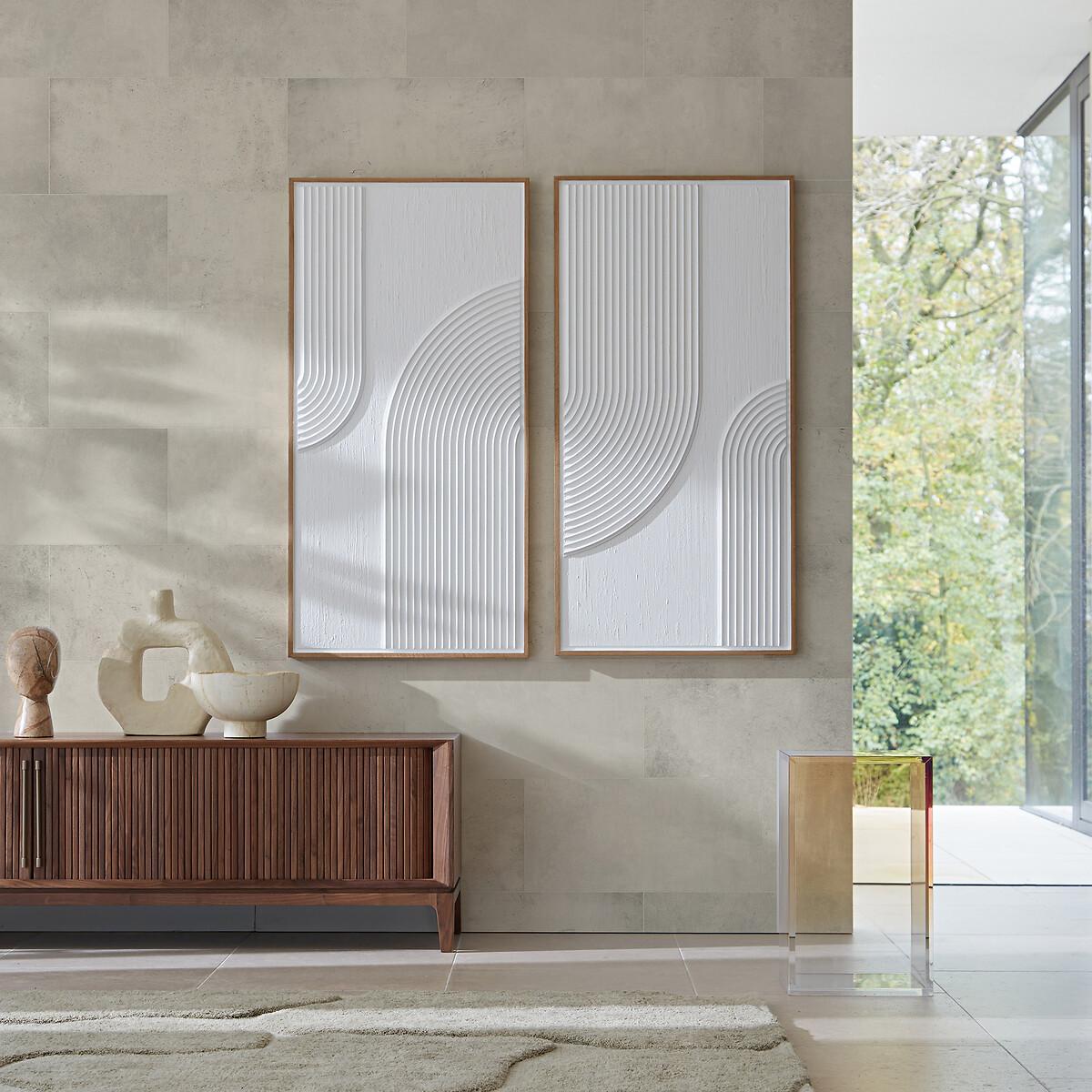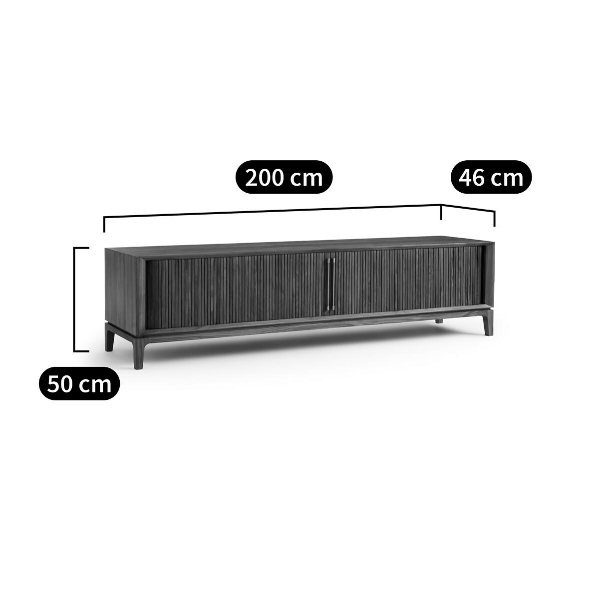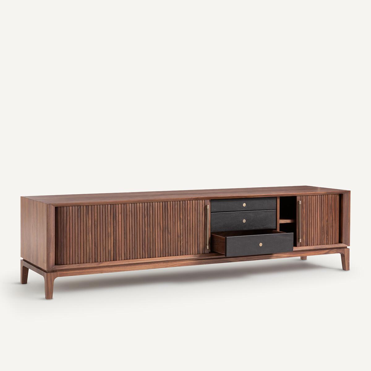 The Liamca TV unit has sliding doors and the design combines aesthetics and functionality. Its thin base gives it structured, lightweight feel. The organisation of the walnut slats, the metal details, its 2m-long format and the leather finish of the front of the drawers, give it a touch of luxury and sophistication.. Product Details • Walnut-veneered MDF case • Base, legs and doors in solid walnut • 2 slatted sliding doors opening onto 3 adjustable removable shelves and 3 push/pull drawers in walnut veneered MDF and front panel covered in genuine leather (corrected grain cowhide leather, chrome tanning and pigmented finish) • 3 cable holes • Champagne-coloured matte-finish metal handles • Finishing of 45° corners Quality Info • German brand hardware: reliable, discreet and functional. These accessories ensure the longevity of your product. Dimensions • Length: 200cm • Height: 50cm • Depth: 46cm • Unit L200 x H35 x D46cm • Base height: 15cm. Usable space • Side compartments: L39 x D35 x H14cm • Middle compartments: L45 x D35 x H14cm • 1st drawer: L42 x D30 x H3cm • Other drawers:L42 x D30 x H7cmDelivery:. Sold pre-assembled.. Note! Please check that all access points are large enough to accommodate your delivery (doors, stairs, lifts). • WOOD FROM SUSTAINABLY MANAGED FORESTS. FSC® certified wood comes from forests that are environmentally, socially and economically well managed. Dimensions and weight of parcel • 1 parcel • L207 x H57 x D53cm. 70kg.