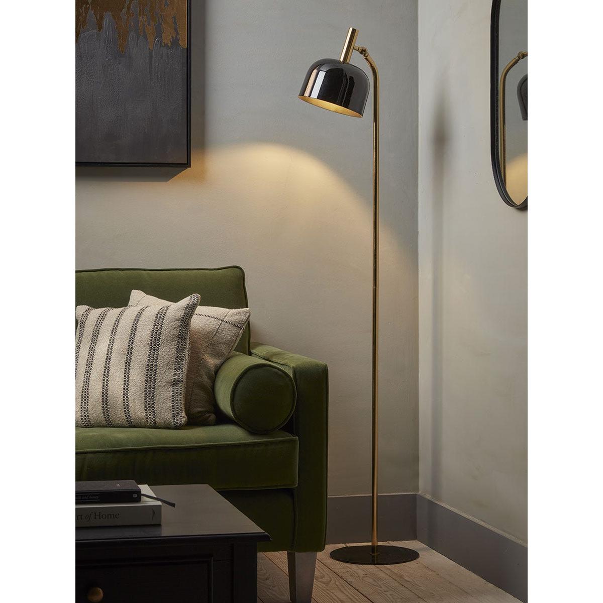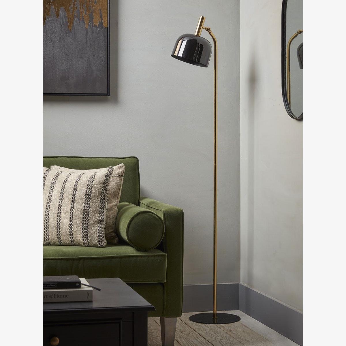 Fill your home with the gentle glow of our Liane Floor Lamp for a space that is warming and welcoming. In a striking black tone, this floor lamp has a simple frame that is well suited to modern interiors. The dome-shaped shade is suspended from a gold-toned metal stand and can be angled, making it perfect for task lighting beside a sofa or armchair. Also available in sand and khaki.