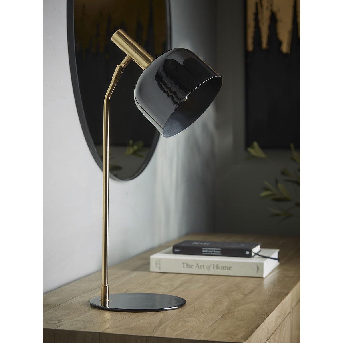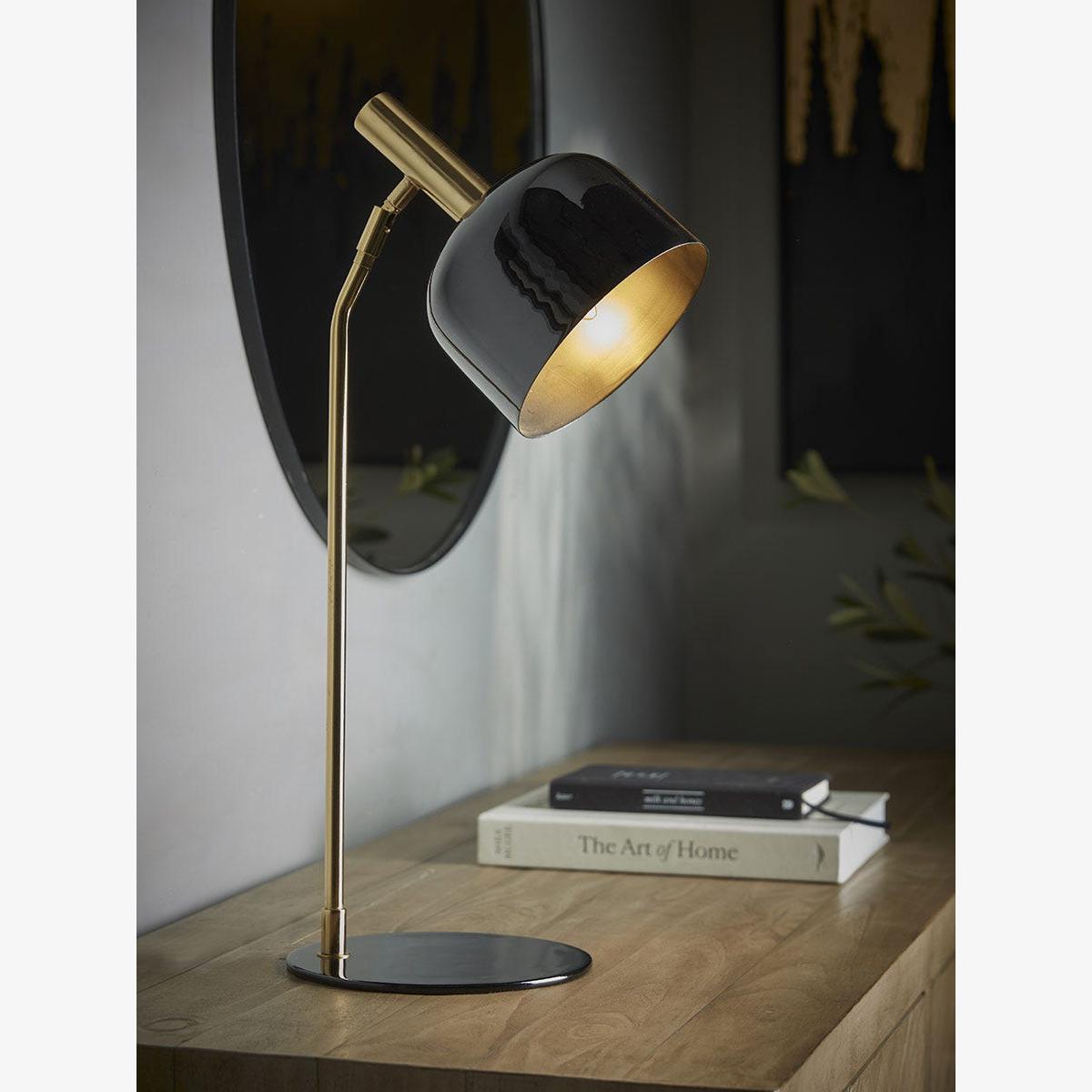 Light your desk space perfectly with our Liane Table Lamp. A flat base holds a tall and slim gold toned stem which creates an elegant and sophisticated look to the lamp. With a striking black base and shade, ideal for an interior that is inspired by simple modernity, the dome shade has a 360 degree swivel feature, perfect for positioning the light just where you need it.  Also available in khaki and sand.