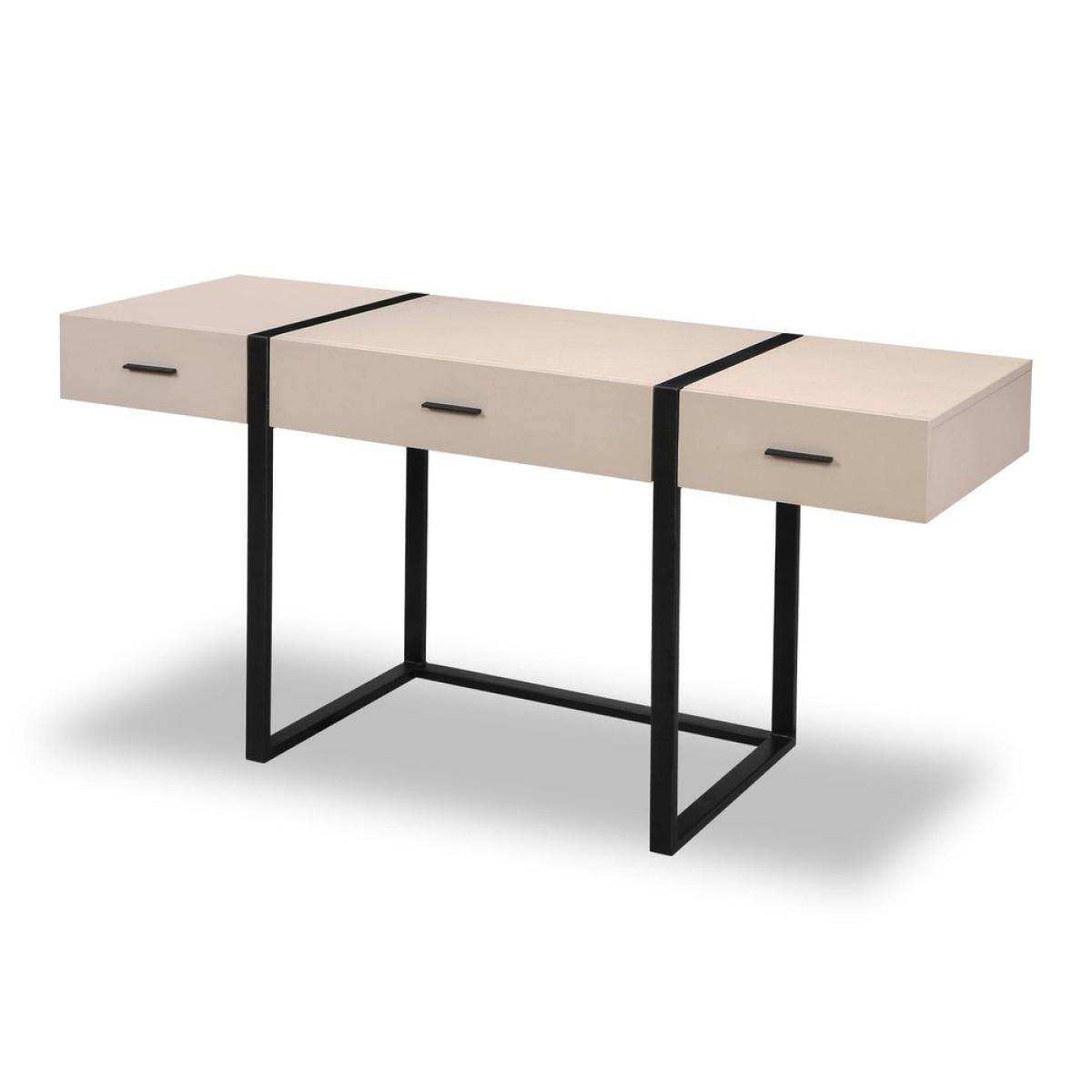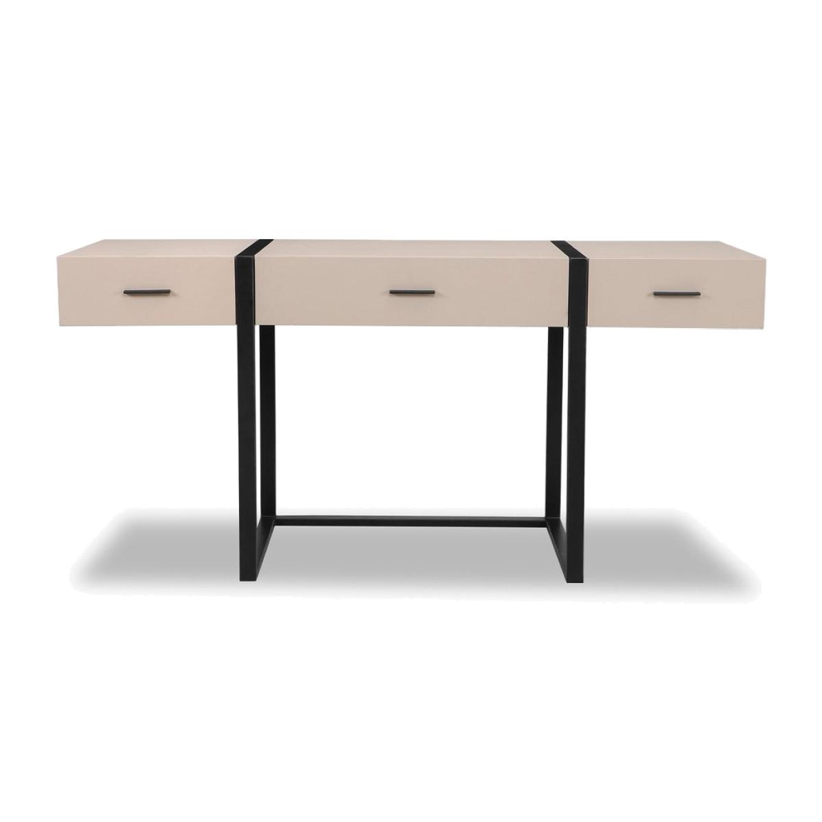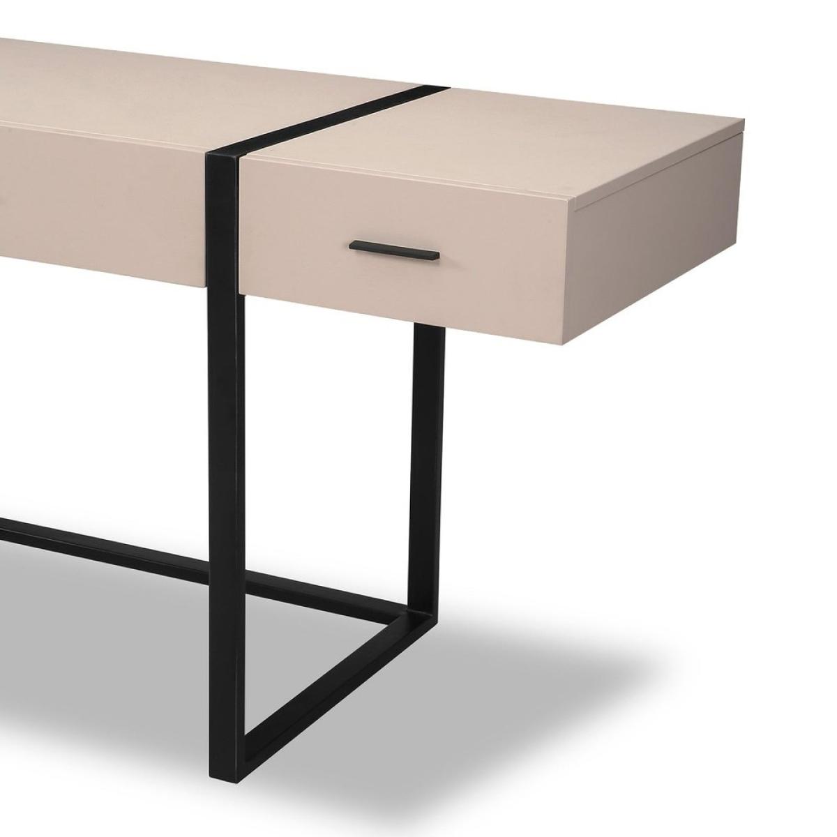 Boasting an exquisite, contemporary style the Almati Dressing Table is sophistication at its best. With a mink Faux Leather top and finished with Matt black metal legs and handles to complement the geometric base, the Almati offers a stylish storage solution for any bedroom interior. Dimensions: H: 76 x W: 160 x D: 55 cm Materials: Mink Faux Leather, Metal Legs Assembly Required: No