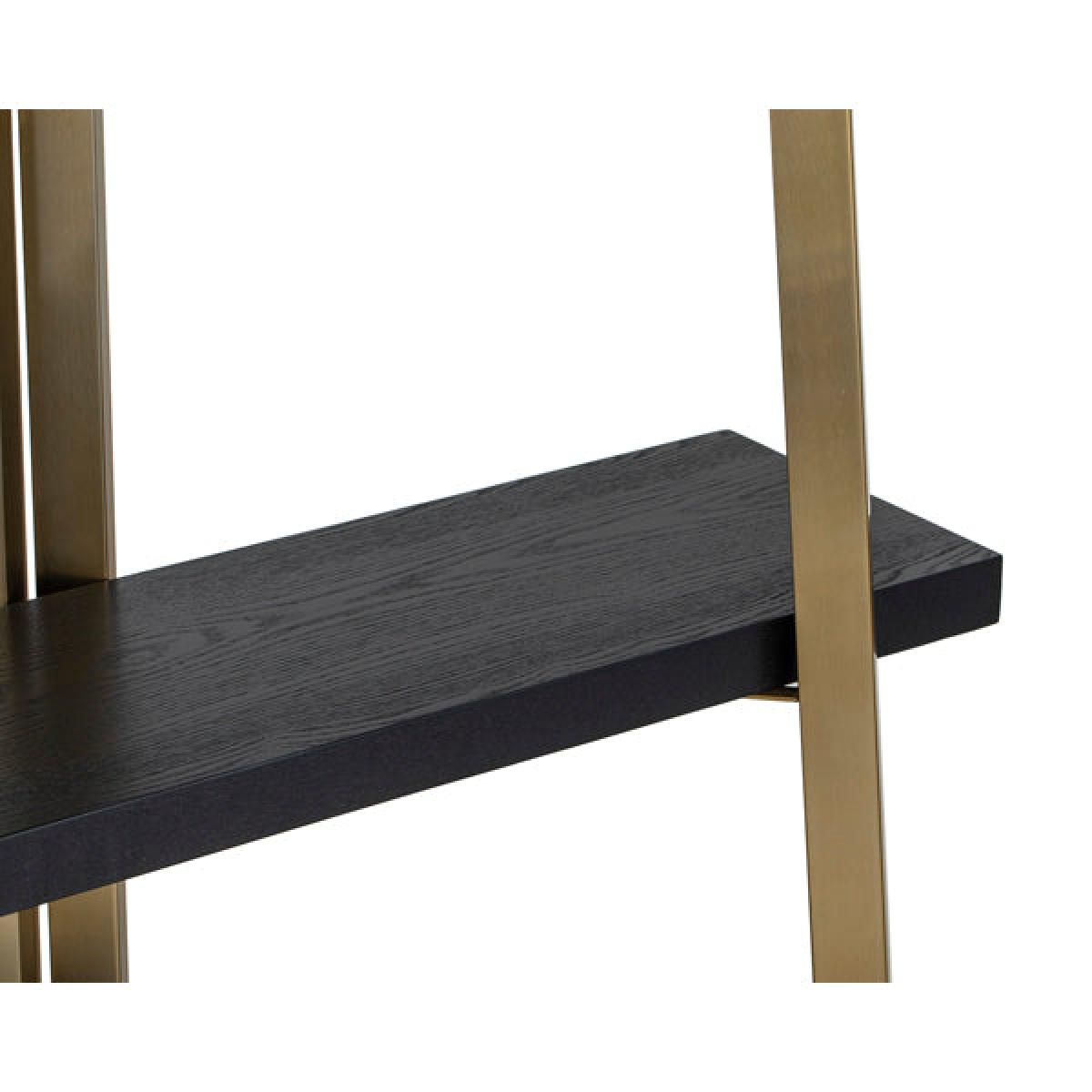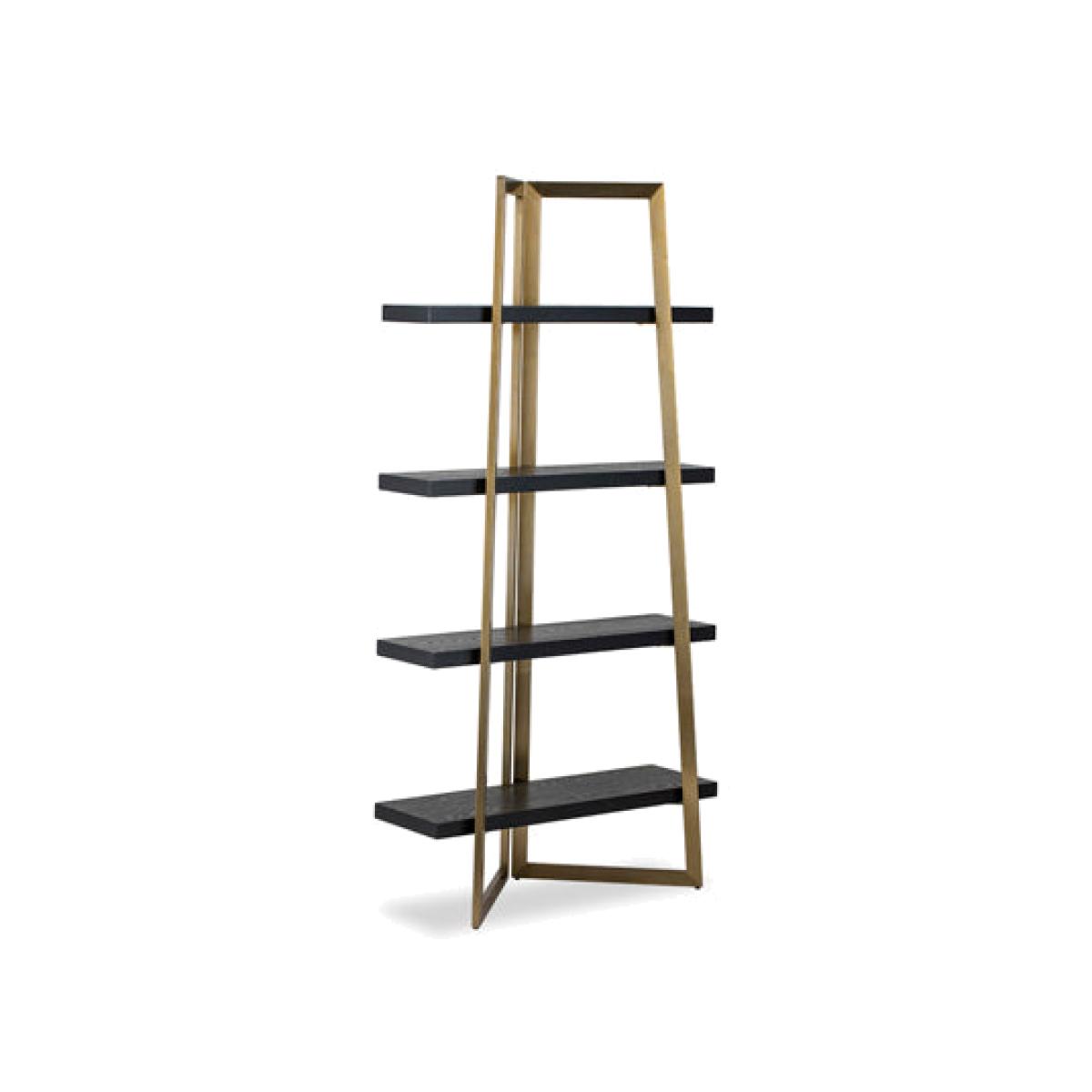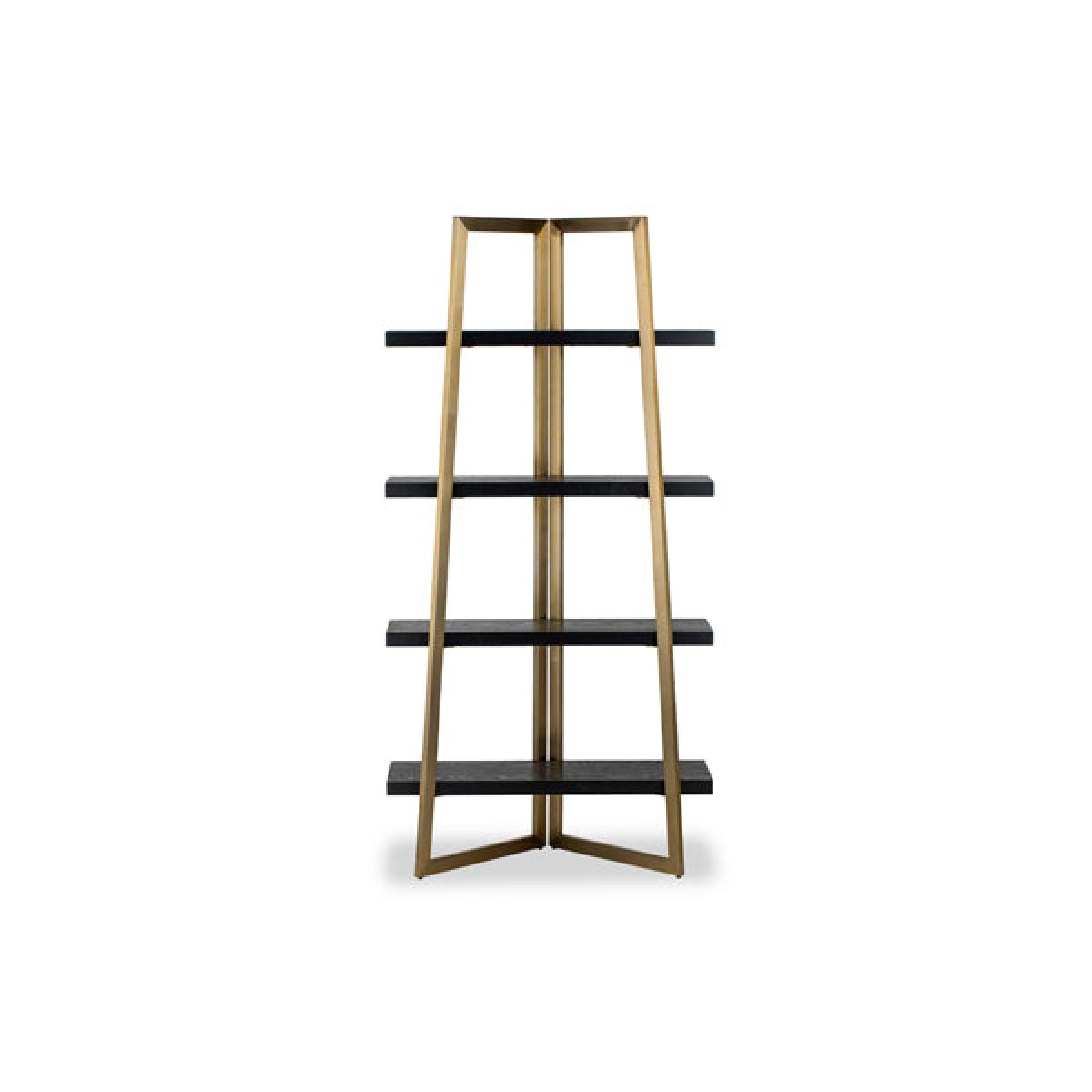 This gorgeous black shelving unit offers a wonderful contrast between the five wooden shelves that have been finished in black and the gold-coloured brushed brass framing. The frame is rectangular and angled to provide an interesting finish to the piece and to make the shelving unit look solid and sturdy. You can use this unit to display your prized possessions in a way that they can't help but be noticed. Add a small lamp to light this unit up and highlight the brushed brass finish. This lovely shelving unit will sit well in any modern or contemporary space in a living room or hallway. Dimensions: W: 90 x D: 36.8 x H: 180.5 cm