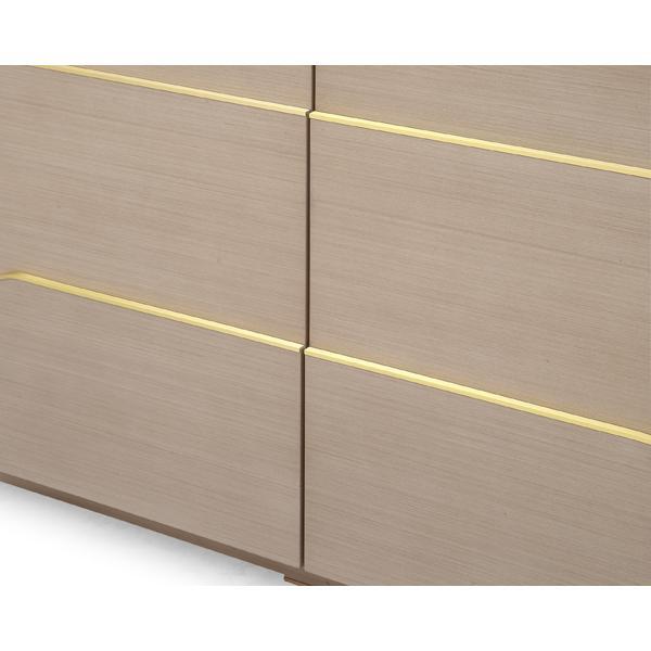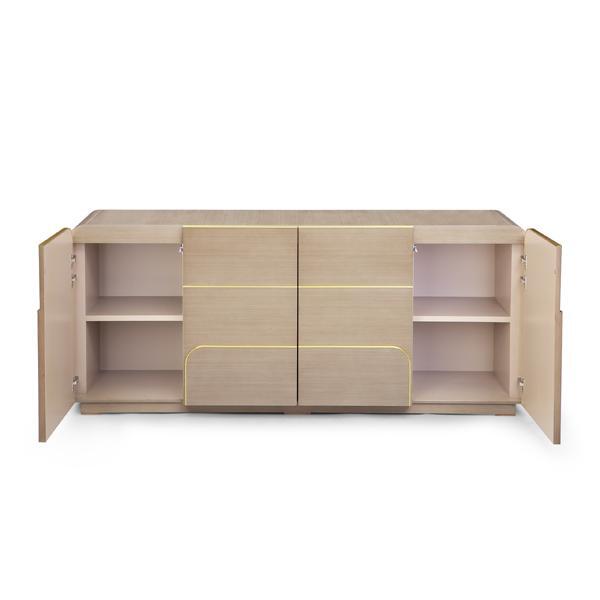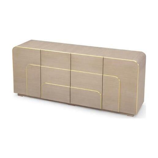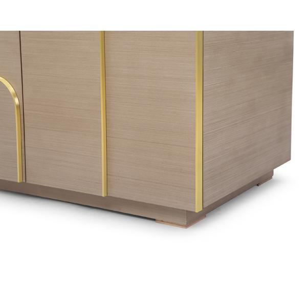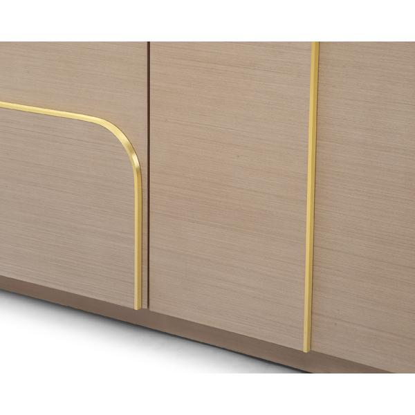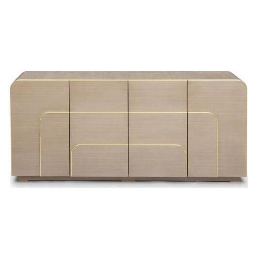 Natural Finished Textured Teak Veneer, Brass Finish Accents. Finished in a deeply delicious coastal hue, the Astoria Sideboard makes a fashionable feature. Its four cabinet doors enclose ample shelved storage, perfect for a decadent dining or living space. Working clean lines and mesmerising metallic accents picking out its low relief concentric features, the Astoria flaunts a mid-century mood enhanced with a meticulously modern twist. With its matching display cabinet this is an impressive interior statement.