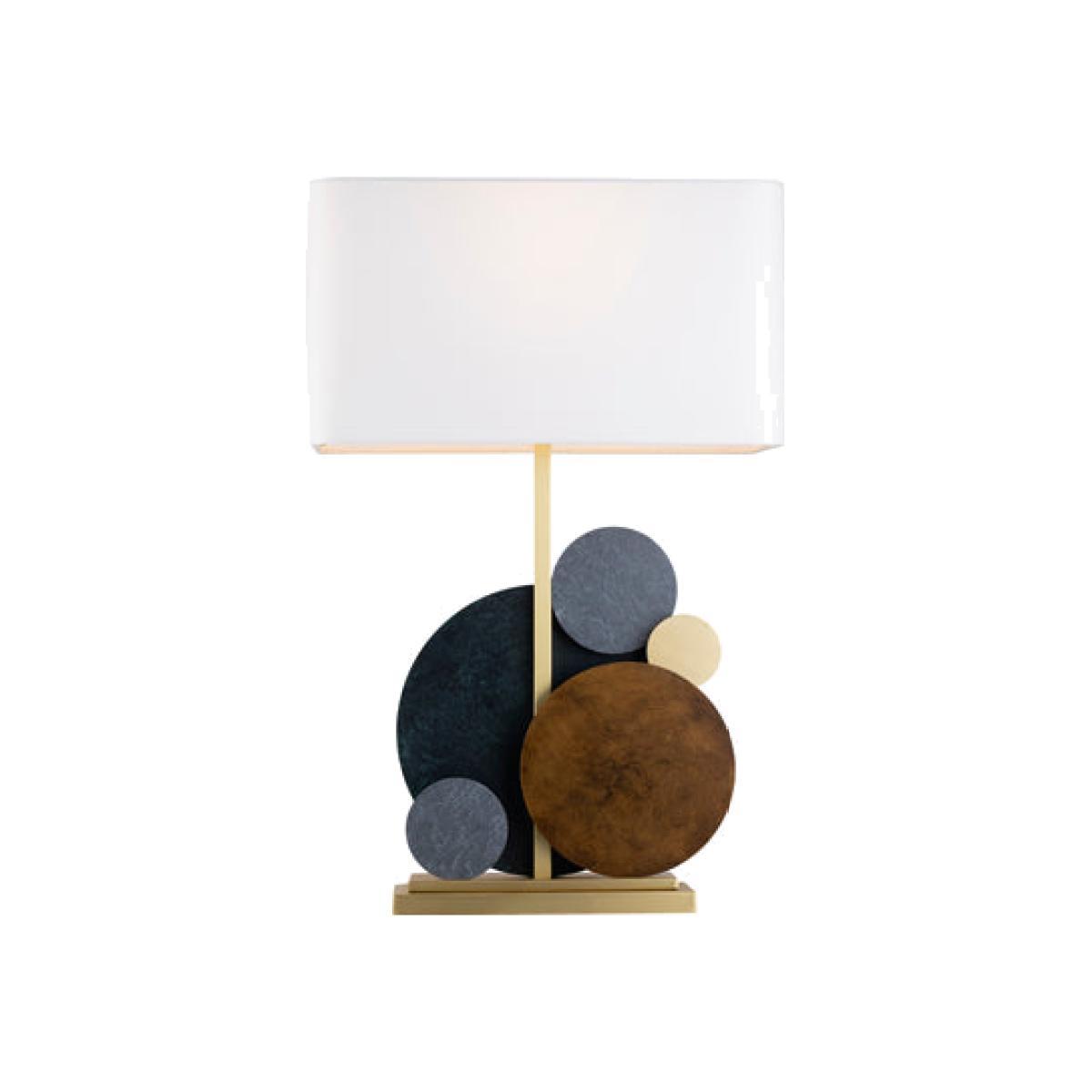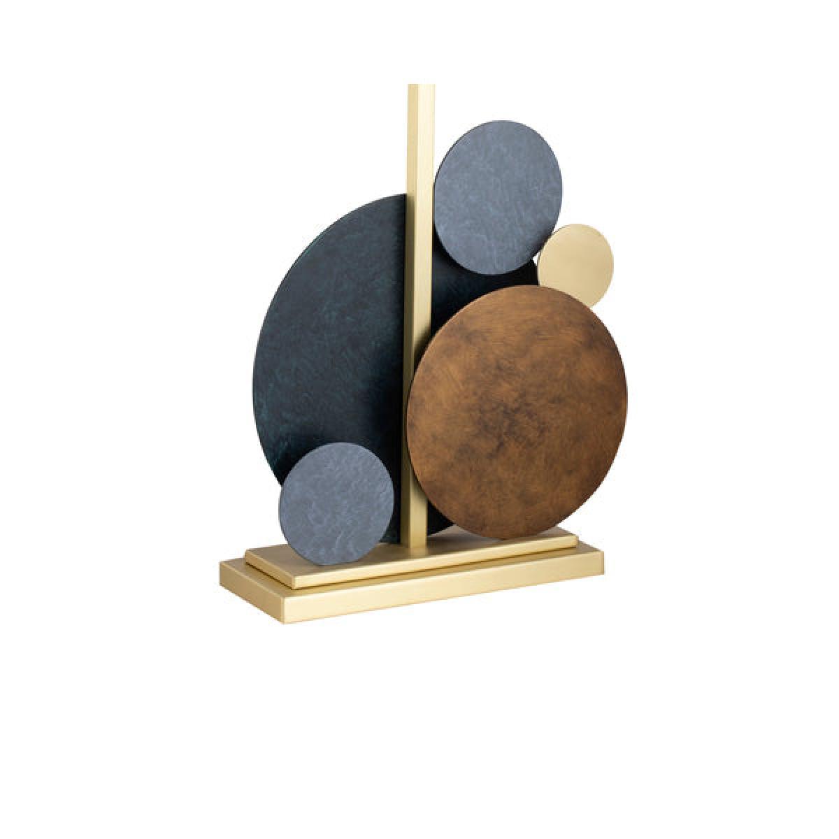 Anodized Metallics Discs in Colours, Brushed Brass Finish Base, White Fabric Shade with White Interior. Over lappering polychrome layered discs create a playful effect atop a strongly geometric base. (Light bulbs not included)Requires 1 x E27 MAX 60. W. *Moot Trading Ltd is not a lender and acts only as an introducer. The credit product is provided by Klarna Bank AB (publ). Credit is only available to permanent UK residents aged 18 and over, subject to status. Terms and conditions apply. Please note that the following products are not regulated by the FCA: Pay in 30 days and Pay in 3 instalments. Read More.