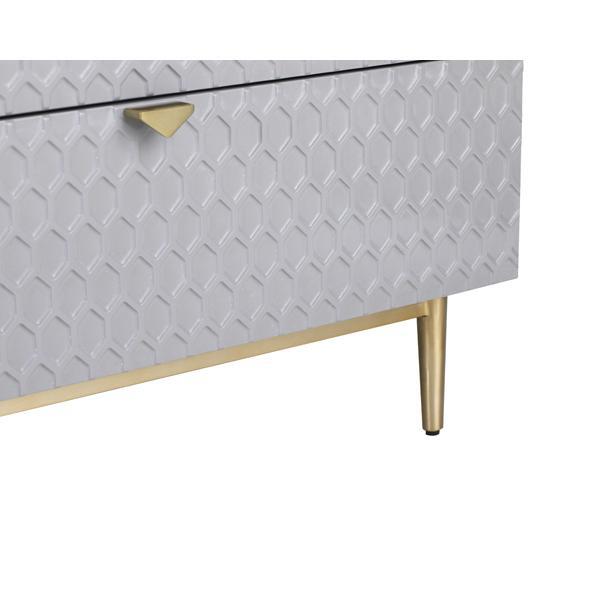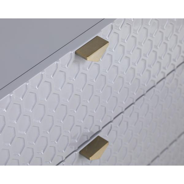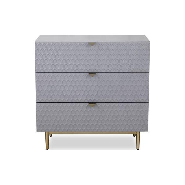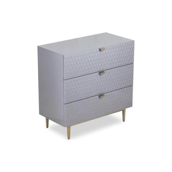 High Gloss Khaki Grey Lacquer with stainless steel brushed golden base and handles. Modern luxury cleverly defines the Bolero Chest of Drawers. This chest of drawers ensures that you are making a long-lasting addition to your interiors. The eye-catching hexagon pattern is further emphasised by a 3D effect. Three drawers offer plenty of storage space for the essentials of your choice.