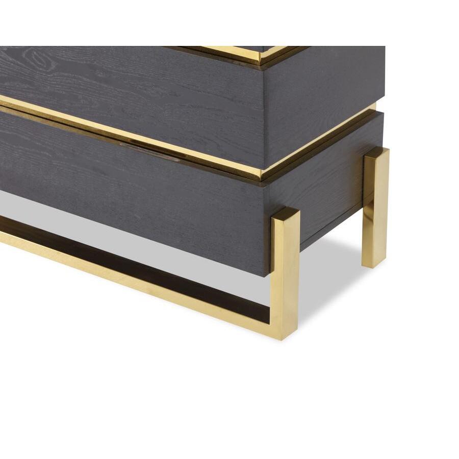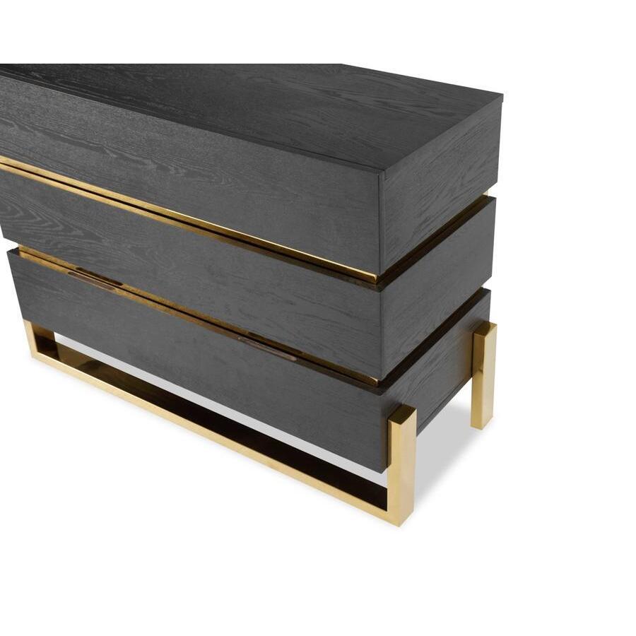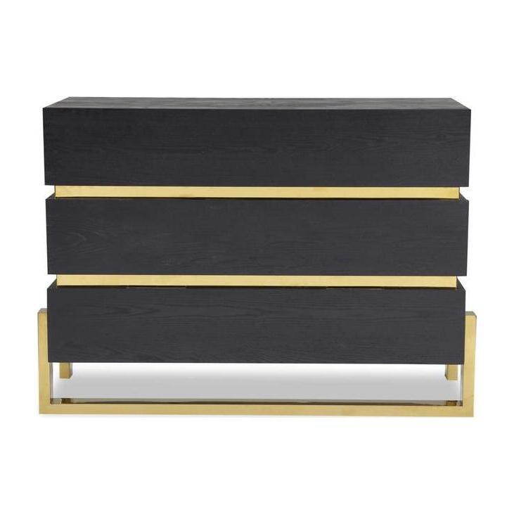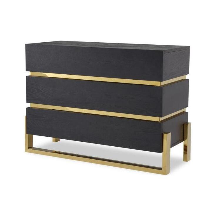 I love this piece for its sleek, modern aesthetic combined with luxe brass accents, which instantly elevate a room. It works particularly well in contemporary or minimalist interiors, where its clean lines and contrasting finishes can be showcased. Practical styling tips include keeping the top surface uncluttered-perhaps with a statement lamp or a few decorative accessories-and pairing it with monochrome or neutral decor to highlight the brass detailing. It’s versatile enough to serve as a bedroom storage solution or as an eye-catching accent in a living space or hallway, adding both functionality and a touch of sophistication.