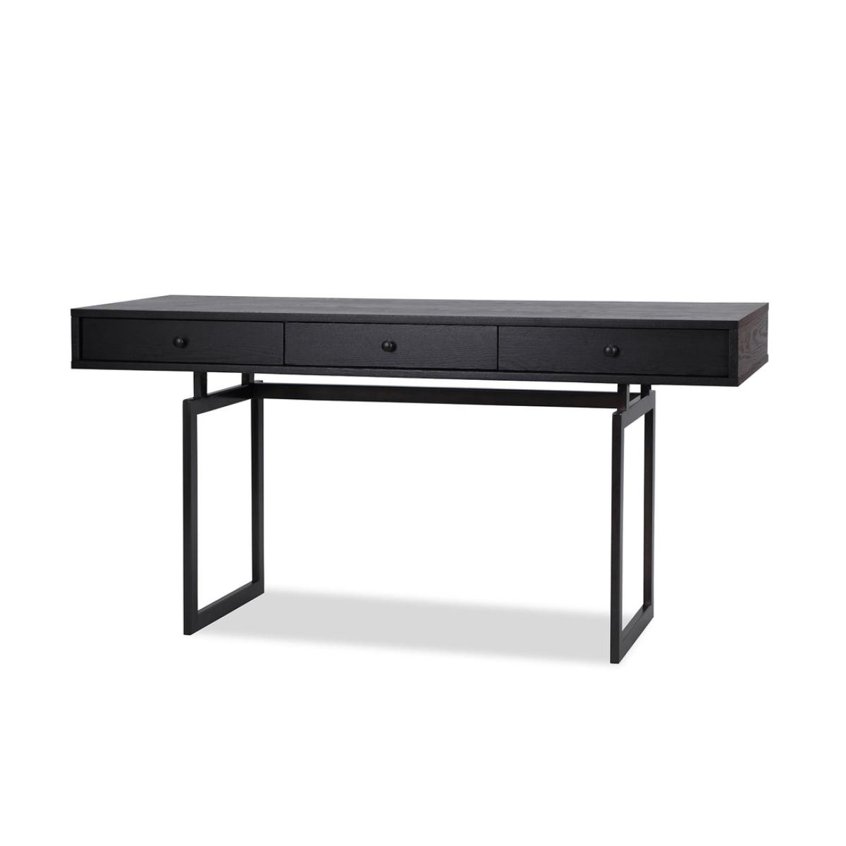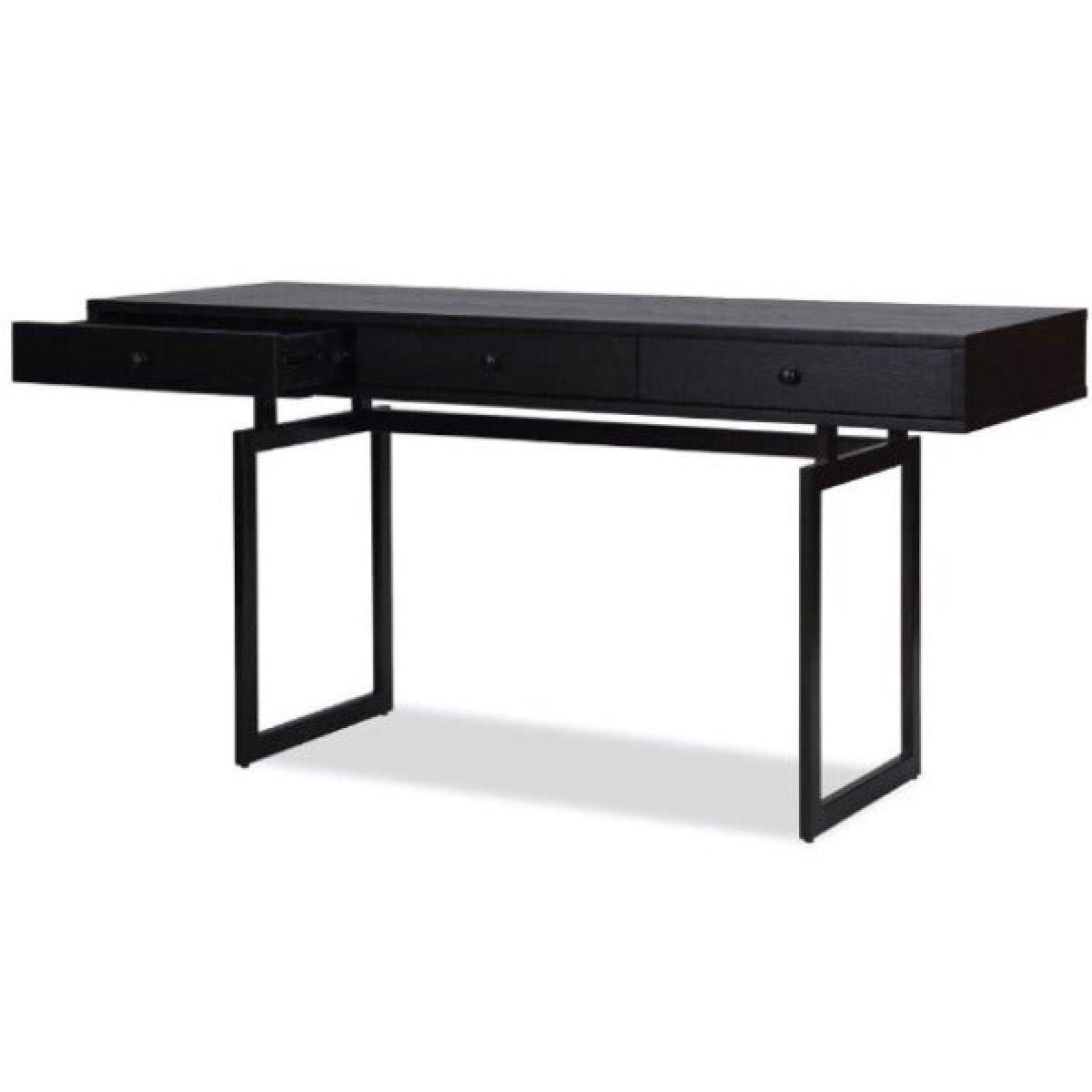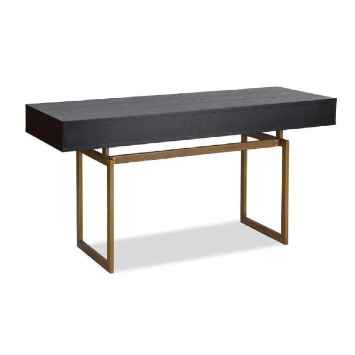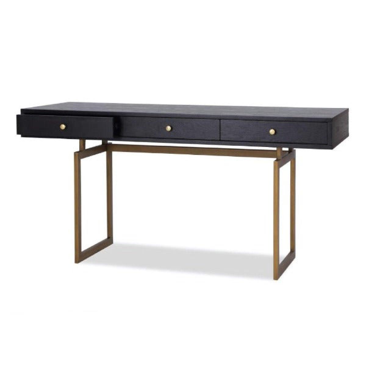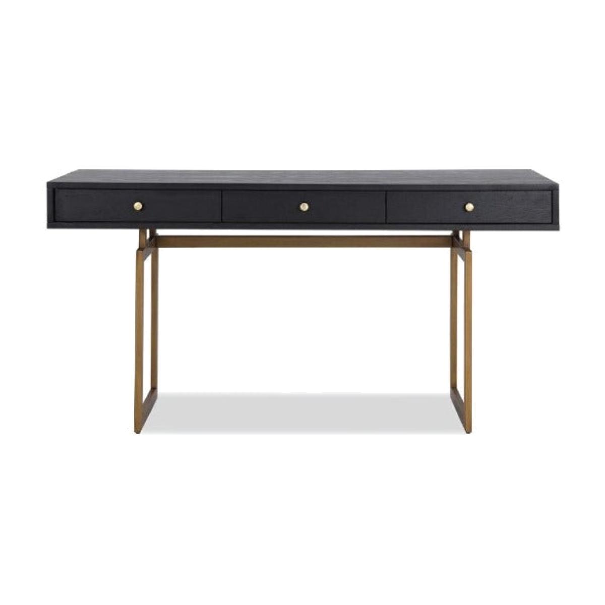Liang & Eimil create innovative modern furniture to enhance your home décor and this Hamilton Desk is another stunning piece. It has the flare of modern art, but created for use as a desk for working, or as a contemporary display table showcasing a vase or modern lamp. The black ash veneer woodwork is supported by an ultra-modern dark brass stand that creates an amazing contrast of colours and textures. With ample table top space, three roomy drawers for storage and circular metallic handles, the Hamilton can make a striking statement in any room or office. Dimensions:W 150 x D 55 x H 76cm. Dimensions: W: 150 x D: 55 x H: 76 cm