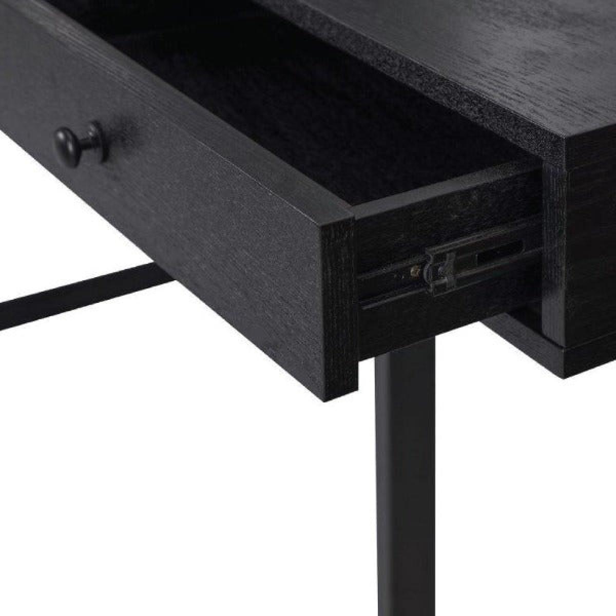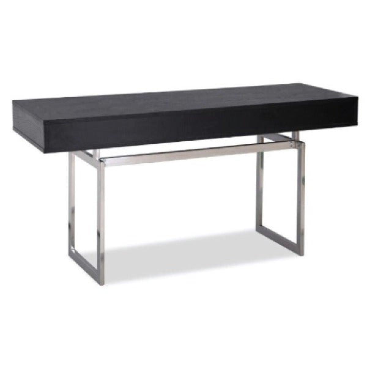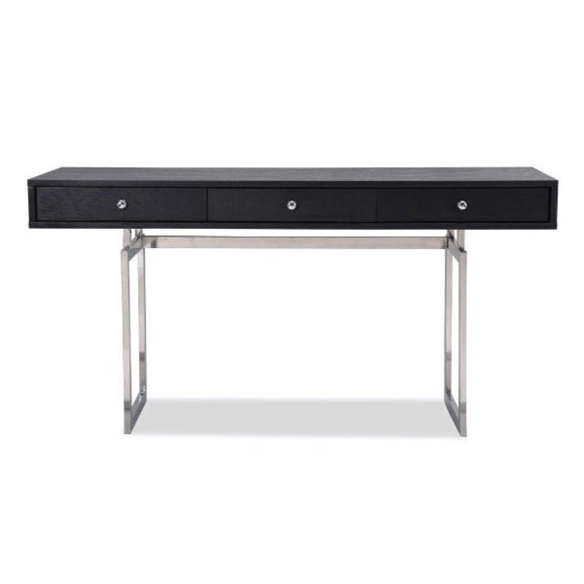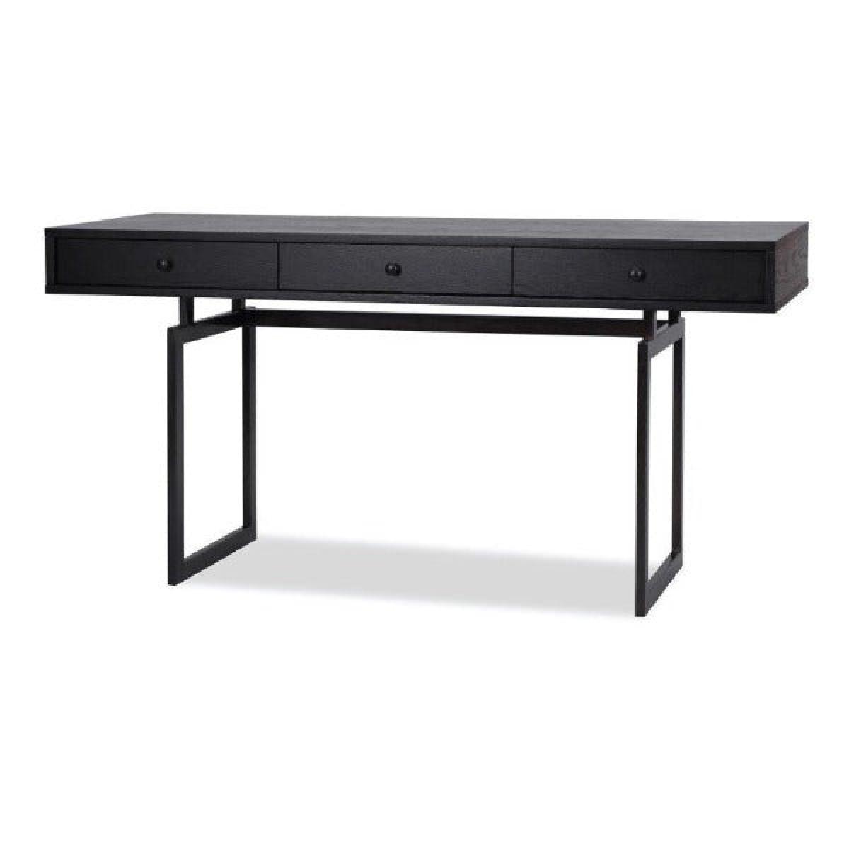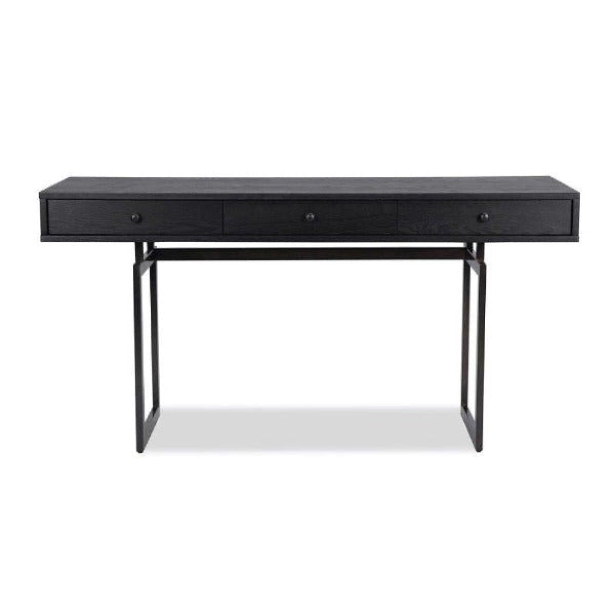 Liang & Eimil create innovative modern furniture to enhance your home décor and this Hamilton Desk is another stunning piece. It has the flare of modern art, but created for use as a desk for working, or as a contemporary display table showcasing a vase or modern lamp. The black ash veneer woodwork is supported by an ultra-modern dark brass stand that creates an amazing contrast of colours and textures. With ample table top space, three roomy drawers for storage and circular metallic handles, the Hamilton can make a striking statement in any room or office. Dimensions:W 150 x D 55 x H 76cm. Dimensions: W: 150 x D: 55 x H: 76 cm