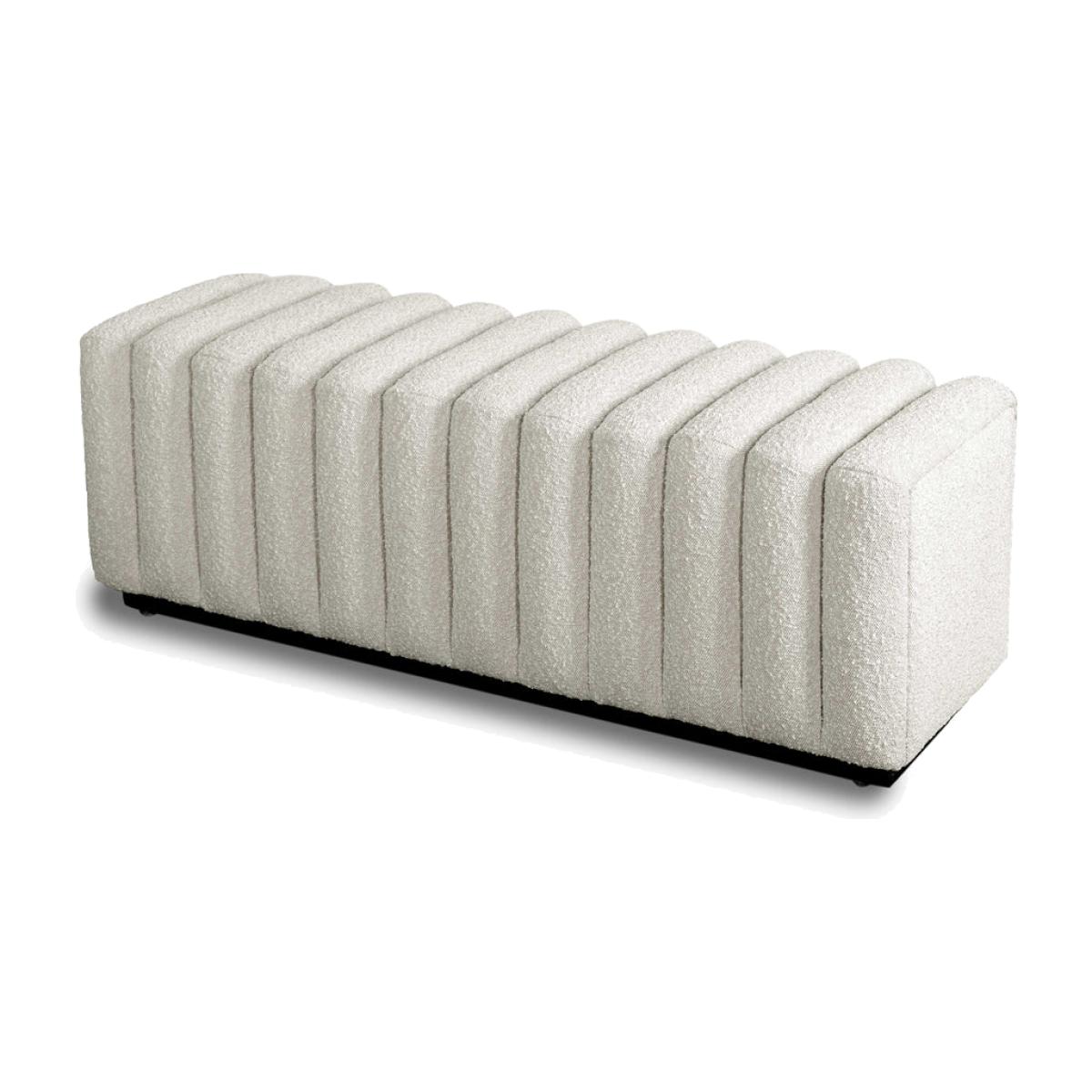 Channel your interior with the Kalum bench. Expertly tailored in our signature textured Boucle Sand fabric the linear channelled seat and sides flow over the top of the stool. The recessed base giv. View More. Channel your interior with the Kalum bench. Expertly tailored in our signature textured Boucle Sand fabric the linear channelled seat and sides flow over the top of the stool. The recessed base gives an almost floating effect giving lightness to this versatile stool. Also available as an accent stool.