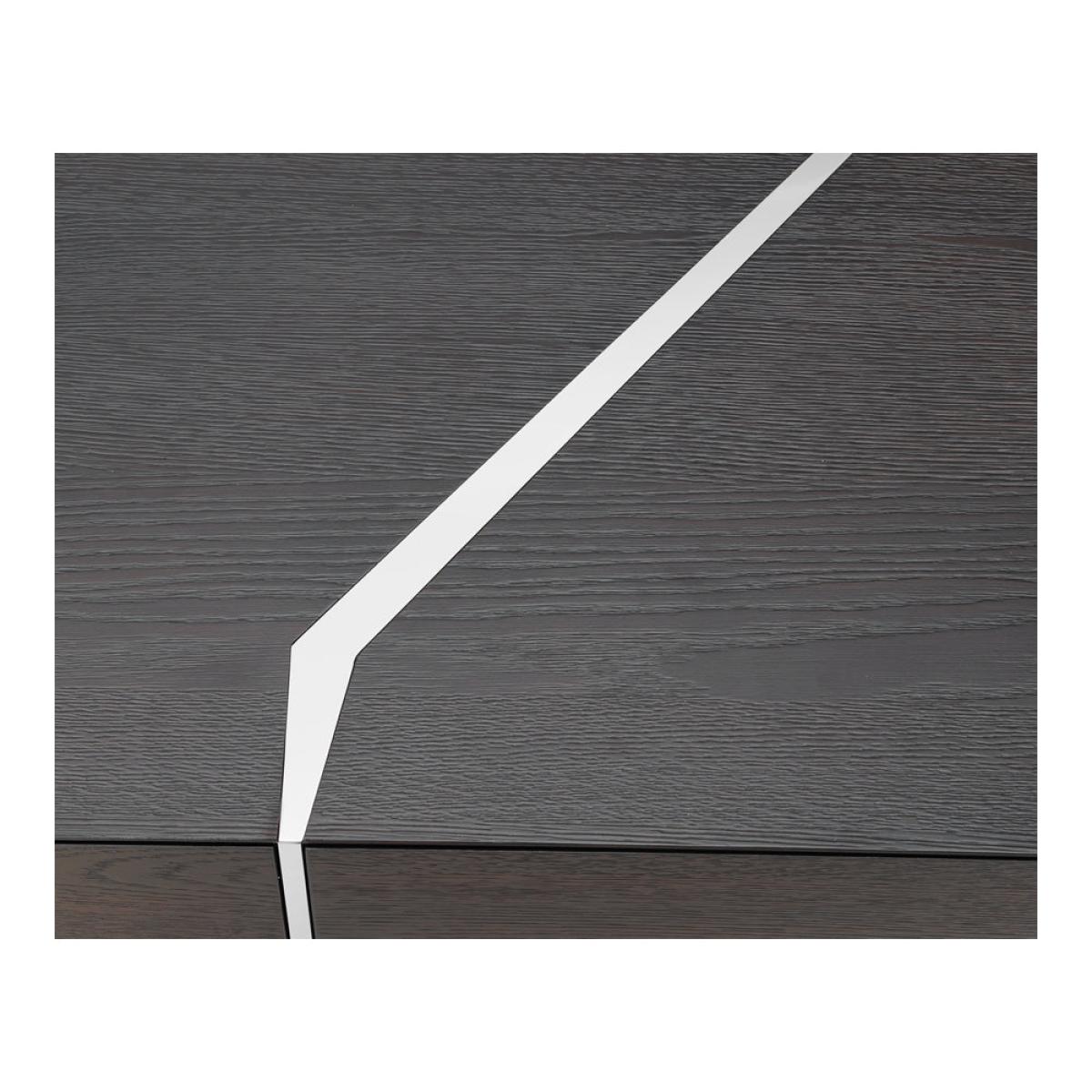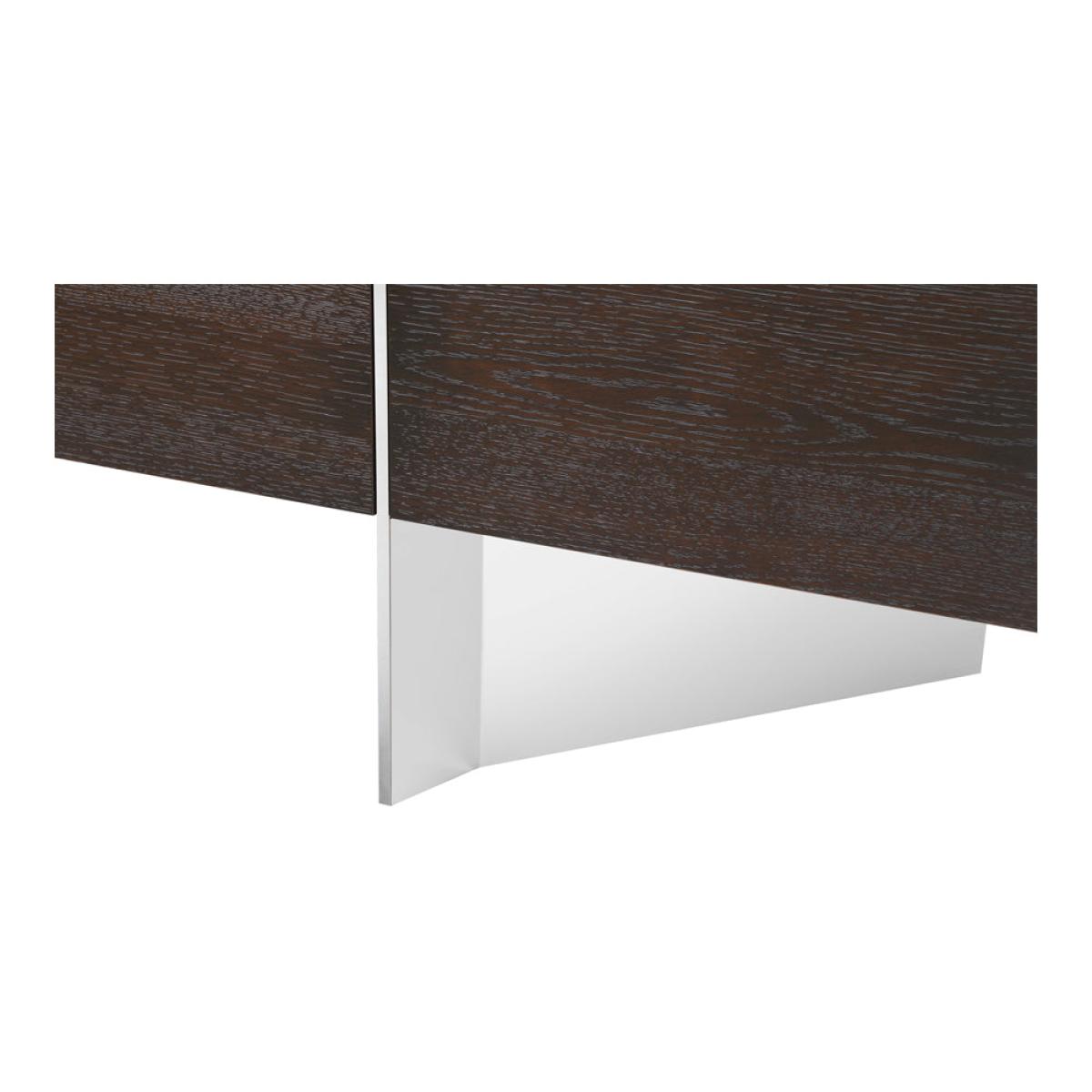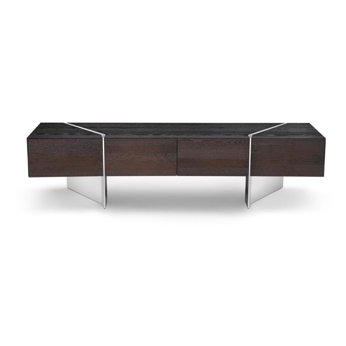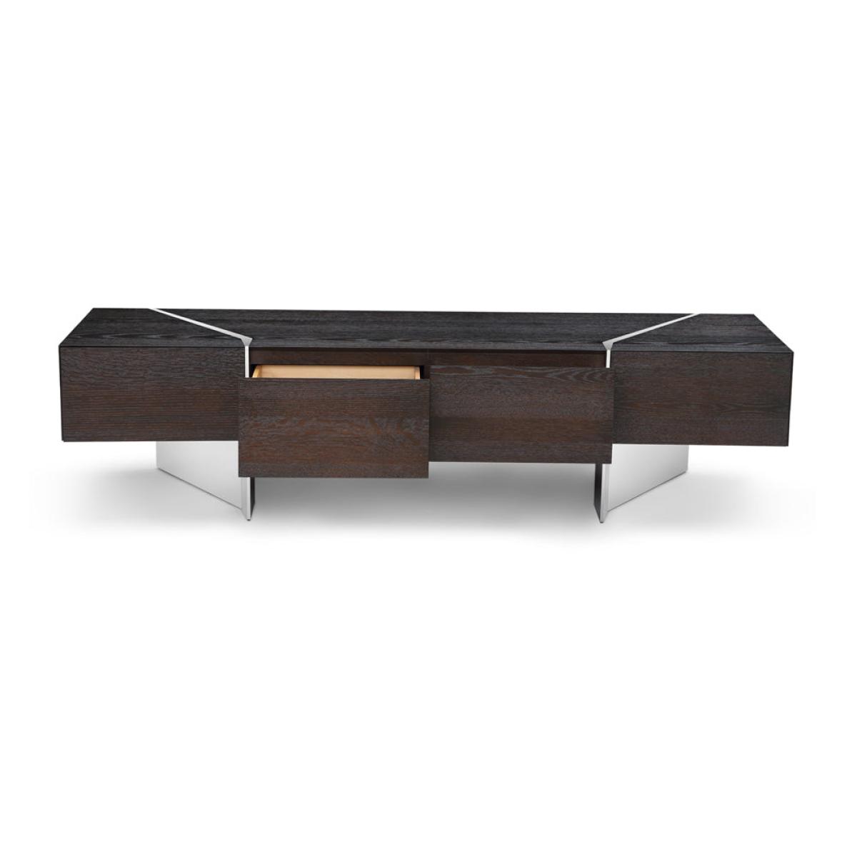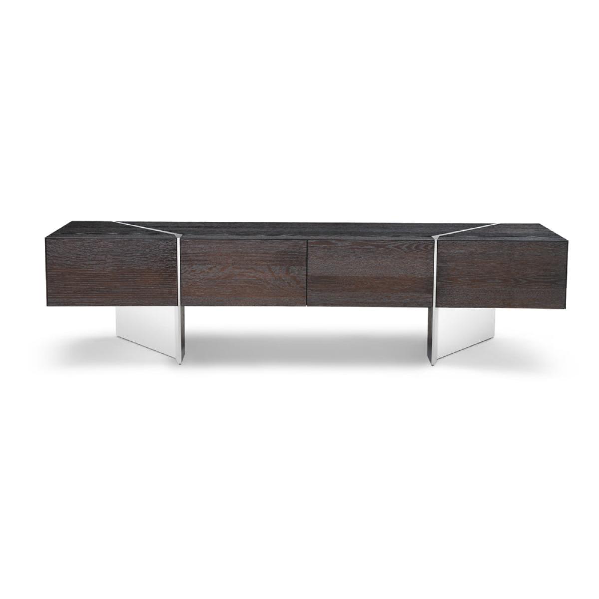 Designed with enduring contemporary style in mind, the Liang And Eimil Nautilus TV Stand Dark Fumed Finish is sleek and effortlessly modern. Offering a pared-back silhouette and minimalist lines,. View More. Designed with enduring contemporary style in mind, the Liang And Eimil Nautilus TV Stand Dark Fumed Finish is sleek and effortlessly modern. Offeri. Ng a pared-back silhouette and minimalist lines, this sleek rectangular stand has a deep fumed oak finish with distinctive and elegant steel accents that are highly polished to add visual flair while supporting the stand. As the stand was created to support a television and associated equipment, there are two central and beautifully crafted drawers to contain cords, remotes or other items that might detract from the overall effect. This stand is the perfect accompaniment to a look channelling a streamlined aesthetic.
