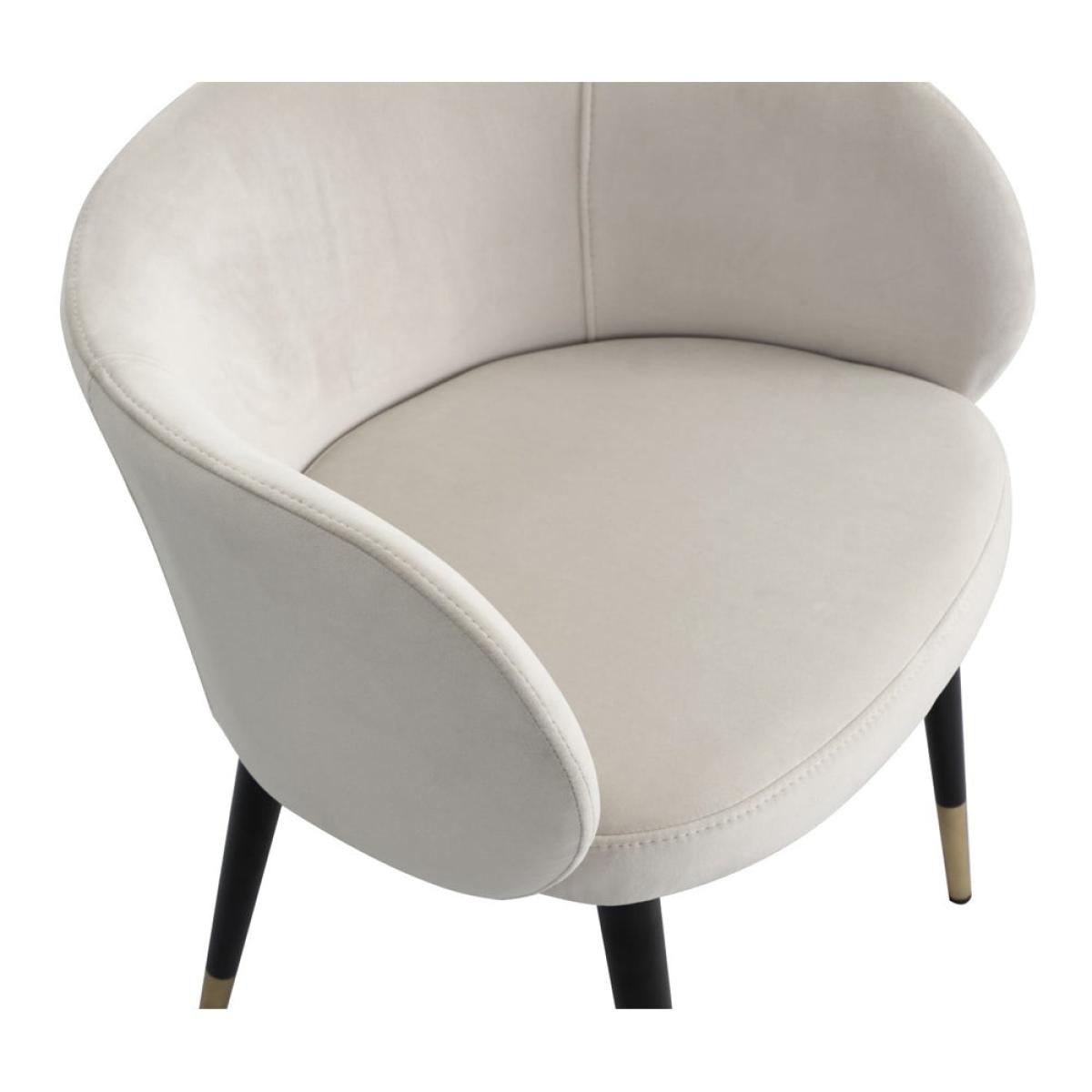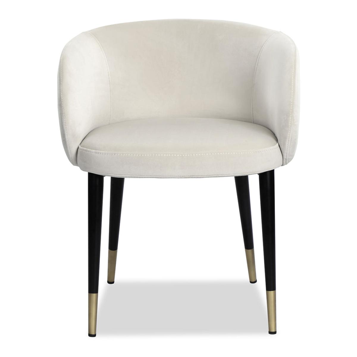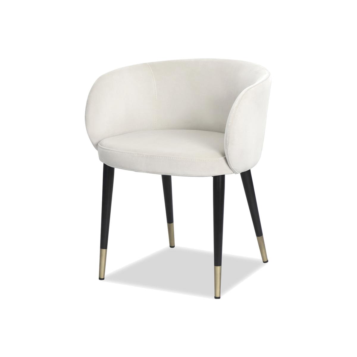 With an almost Art Deco sophistication, this delightful Ola dining chair from Liang & Eimil is gorgeously upholstered in an off-white Pebble velvet and will add allure in any setting. The seat. View More. With an almost Art Deco sophistication, this delightful Ola dining chair from Liang & Eimil is gorgeously upholstered in an off-white Pebble velvet and will add allure in any setting. The seat is generously padded and comfortable and supported by elegantly tapered black legs capped with brass-finished metal. Its wrap-around one-piece back and arm rests are sumptuously curved and inviting. The low-rise design creates a relaxed and informal mood that is great for casual meals with friends or for family breakfasts. It also recommends these chairs for dressing tables or for the home office. The Ola design is also available in a patterned fabric.