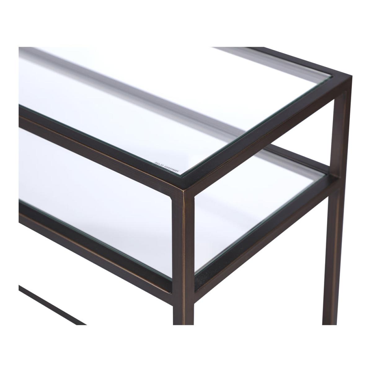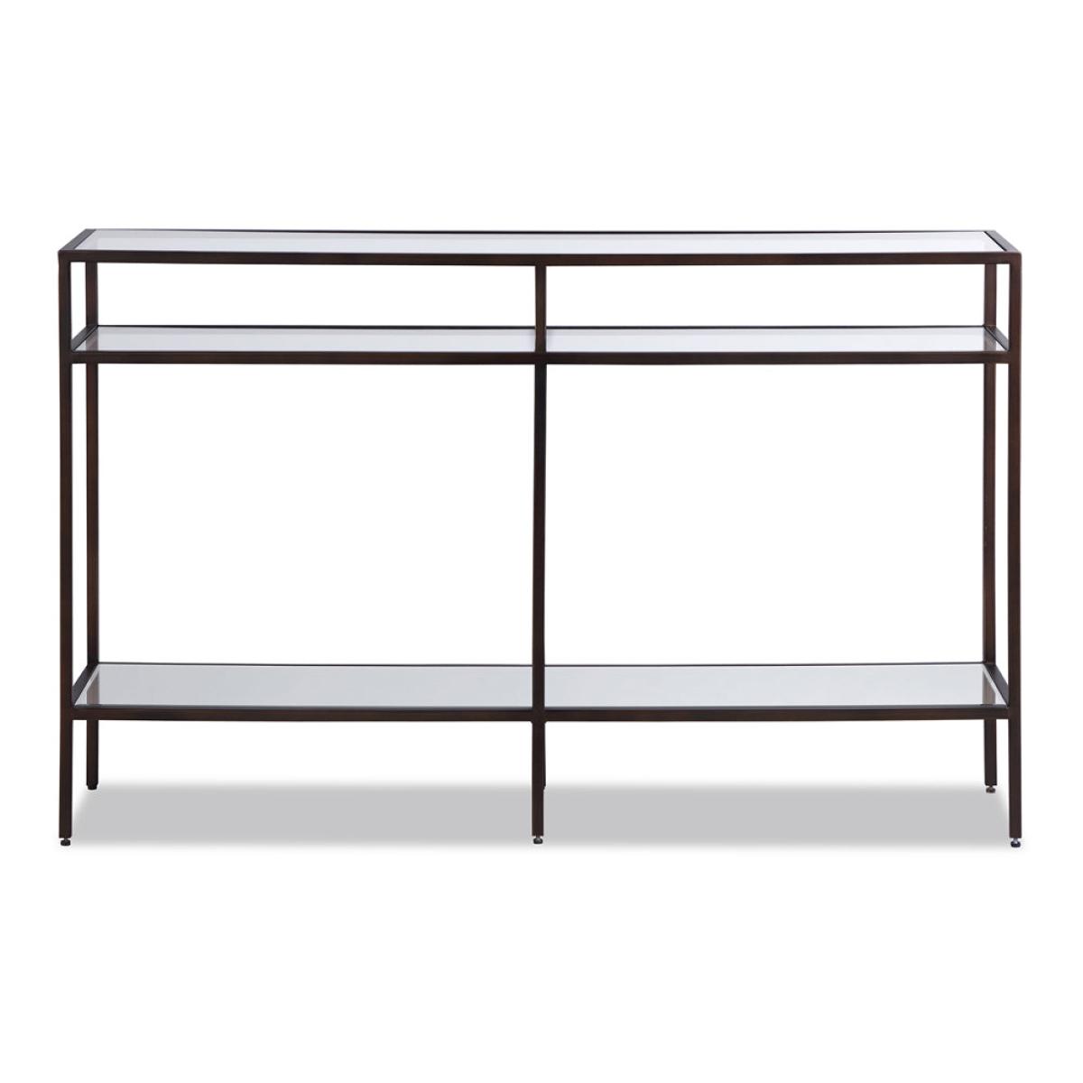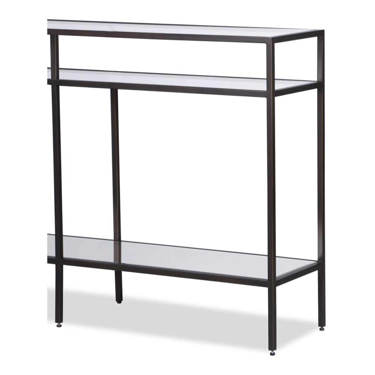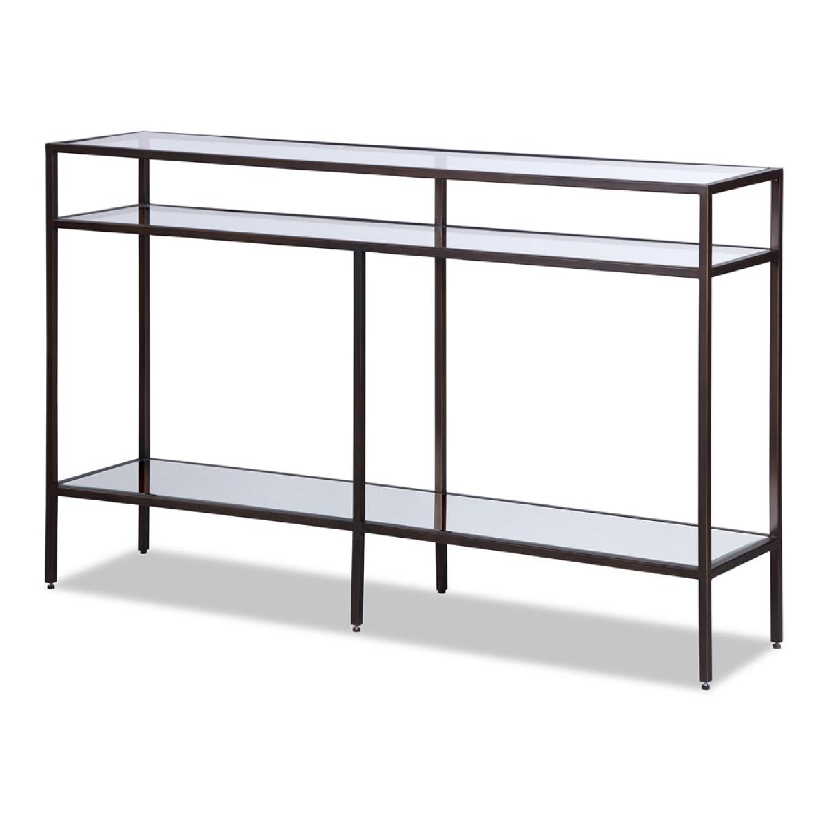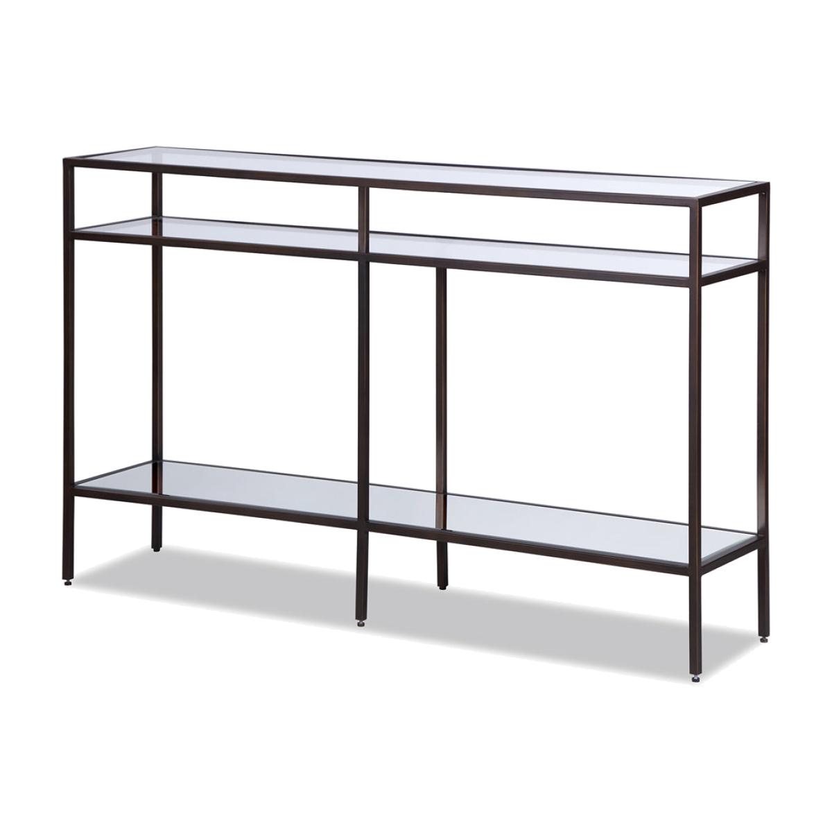 Make your room look neat, tidy and stylish with this stunning Oliver console table from Liang and Eimil. This console table is perfect for displaying your favourite accessories, ornaments and trinkets, and also has plenty of room for storage with its elegant glass shelves. The console table is made of metal, which adds some rustic charm with a distressed look. The table measures 80cms high, 130cms wide and 30cms deep, so there’s plenty of room to display your plants, flowers, photographs and ornaments. The table is perfect for the lounge, dining area or hallway. It has a modern look with its glass and metal style. Dimensions: H: 80 x W: 130 x D: 30 cm Materials: Metal, Glass, Mirror Assembly Required:Yes