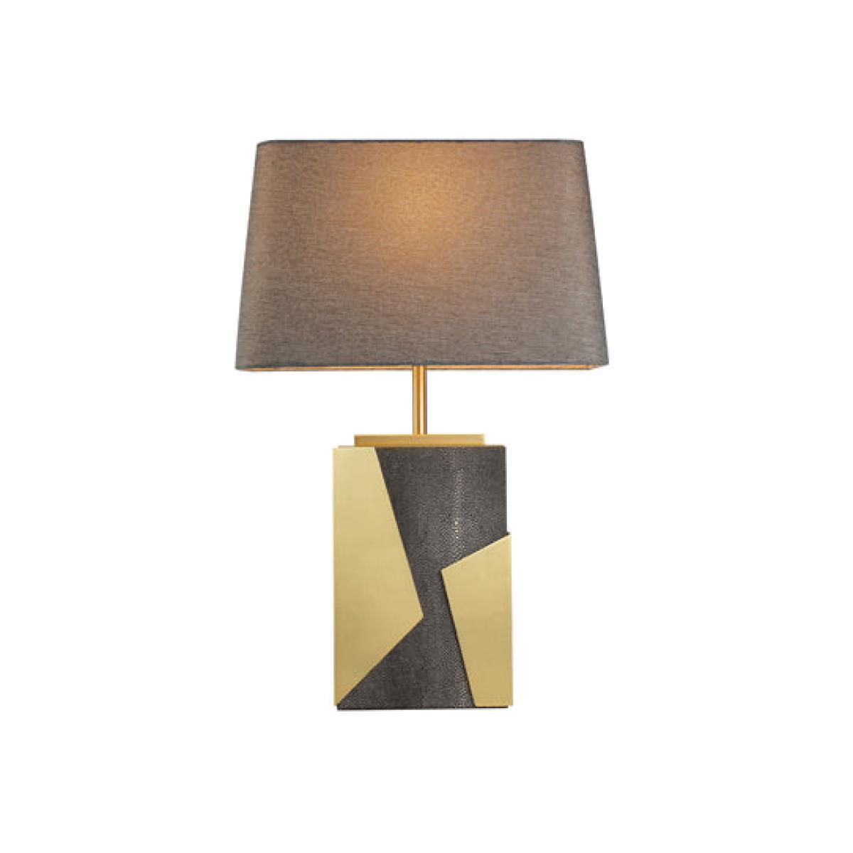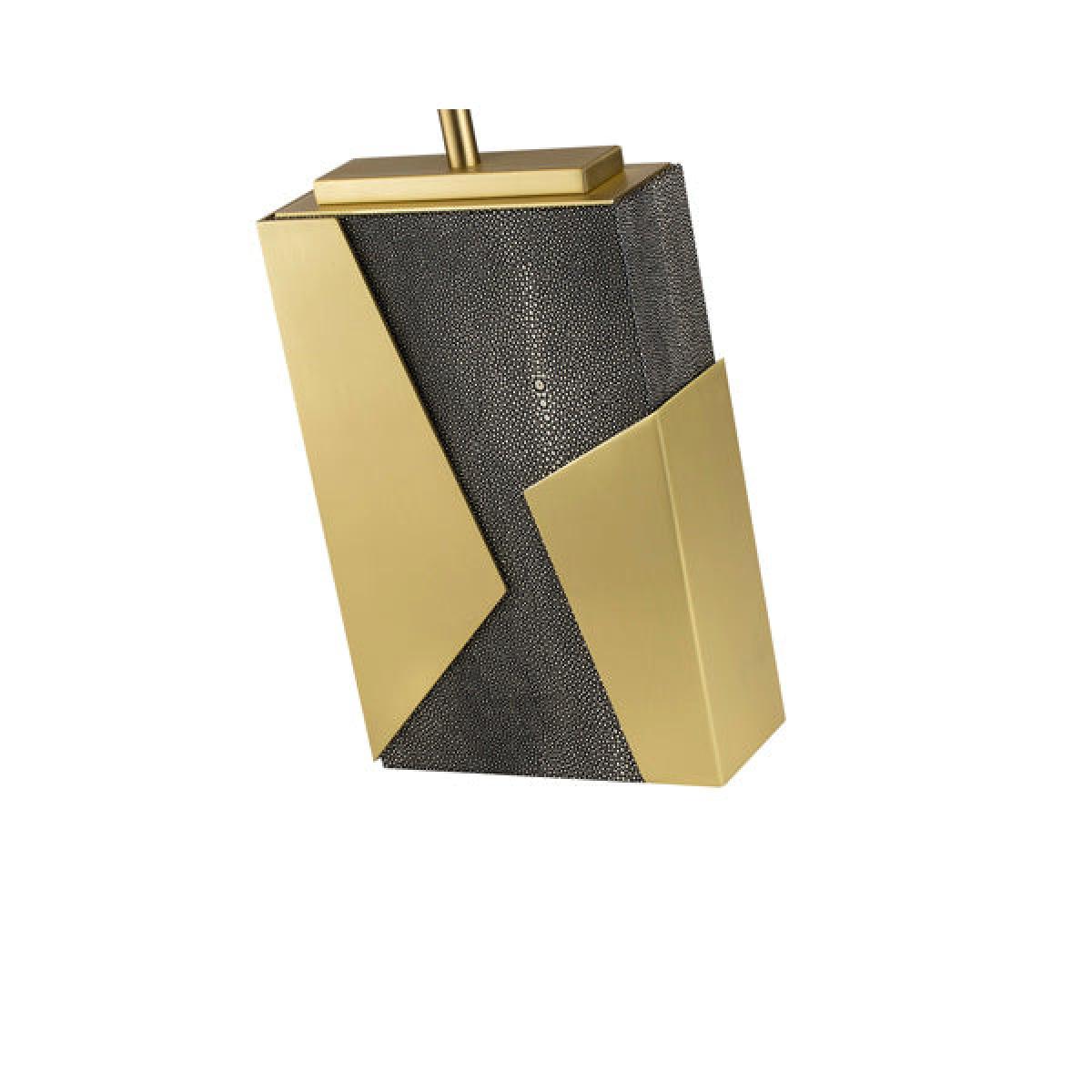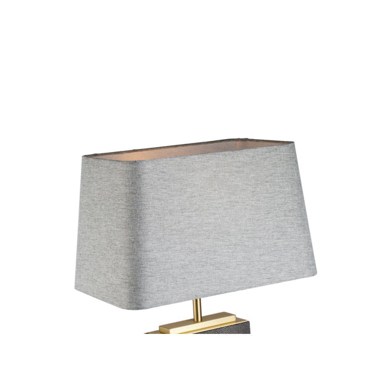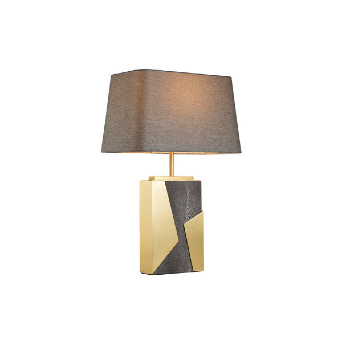 Brushed Brass with faux Shagreen body, Grey Textured Fabric Shade An Art deco inspired table lamp, featuring a abstract brushed gold finish wrap around a delicately textured faux shagreen body. The angled shade reflects the design of the base and creates a balanced whole. (Light bulbs not included)Requires 1 x E27 MAX 60. W. *Moot Trading Ltd is not a lender and acts only as an introducer. The credit product is provided by Klarna Bank AB (publ). Credit is only available to permanent UK residents aged 18 and over, subject to status. Terms and conditions apply. Please note that the following products are not regulated by the FCA: Pay in 30 days and Pay in 3 instalments. Read More.