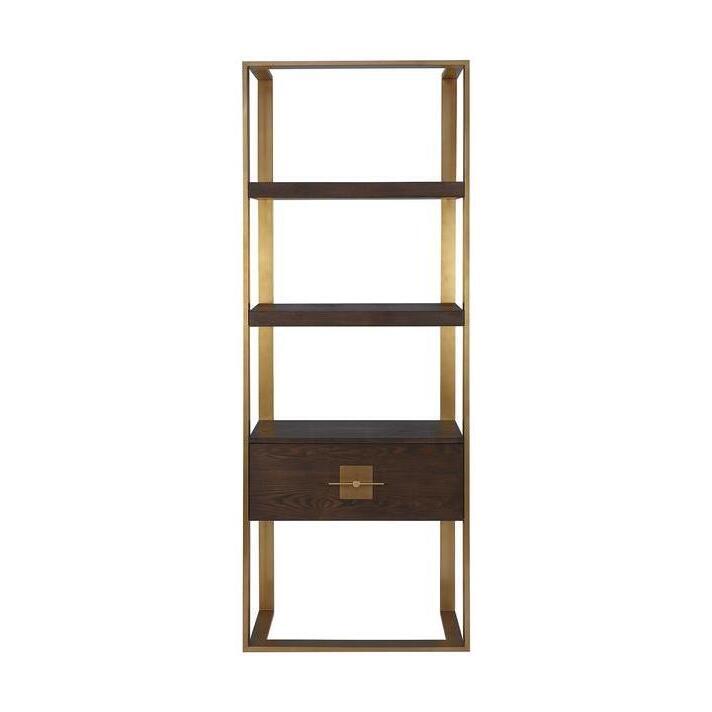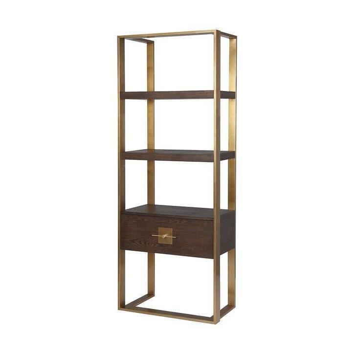 Add a touch of lavish luxury to your interior with the Ophir Shelving unit. Hand crafted by skilled artisans, the Ophir Shelving Unit acts as a flawless focal point for any interior. Finished in a dark brown ash veneer construction and dark brass handles, the shelving unit offers ample storage possibilities across two shelves and a cabinet surface with deep storage drawer. Please note: Due to the naturally occurring grain of the black ash veneer and the artisan approach used to construct the metal handles, each furniture piece has small, subtle variations, resulting in an utterly unique aesthetic with no two exactly the same.
