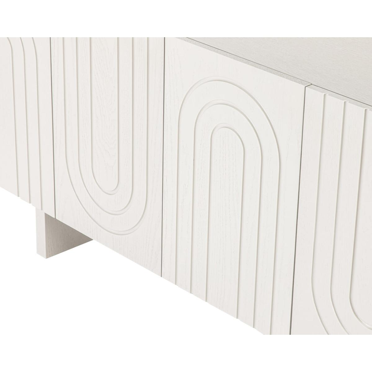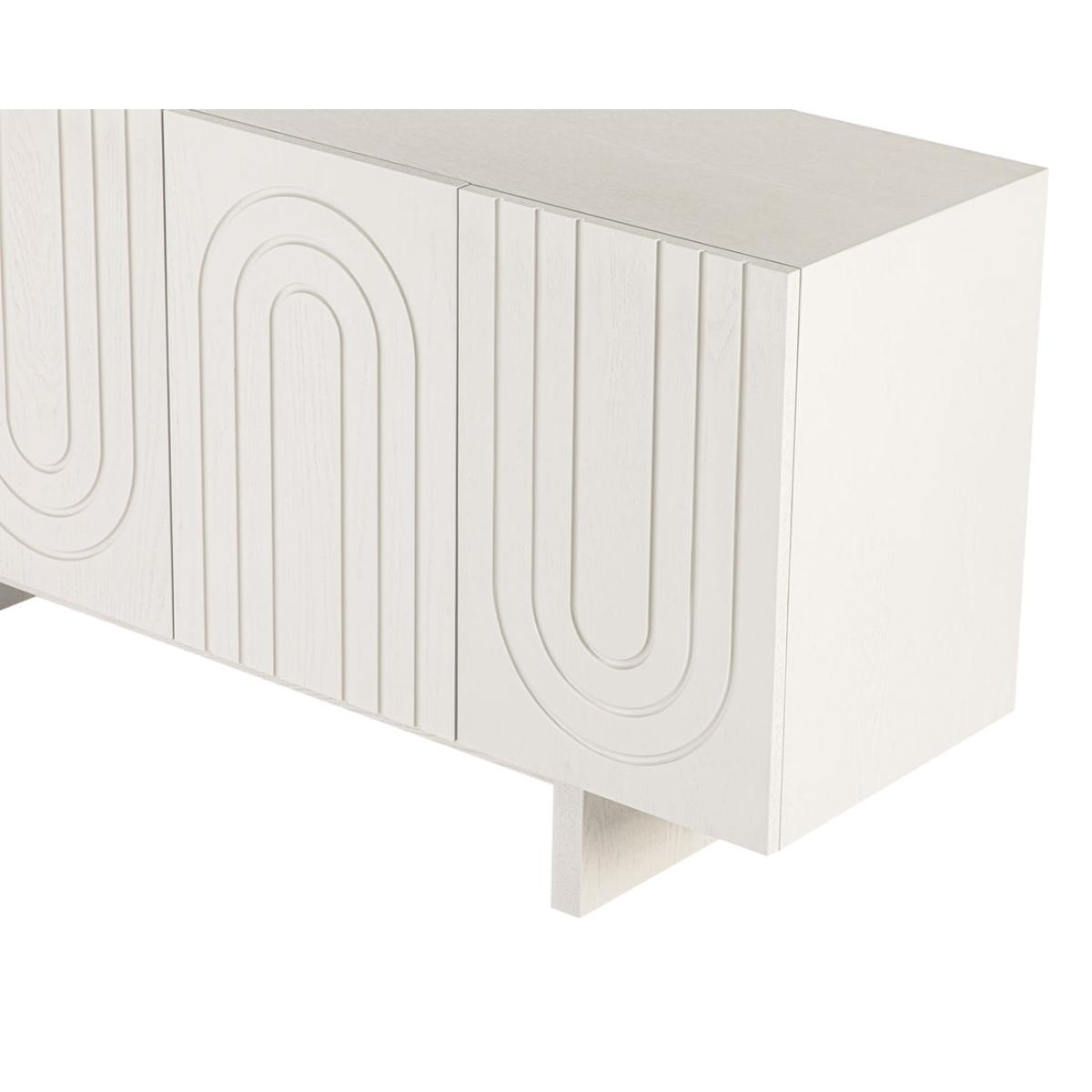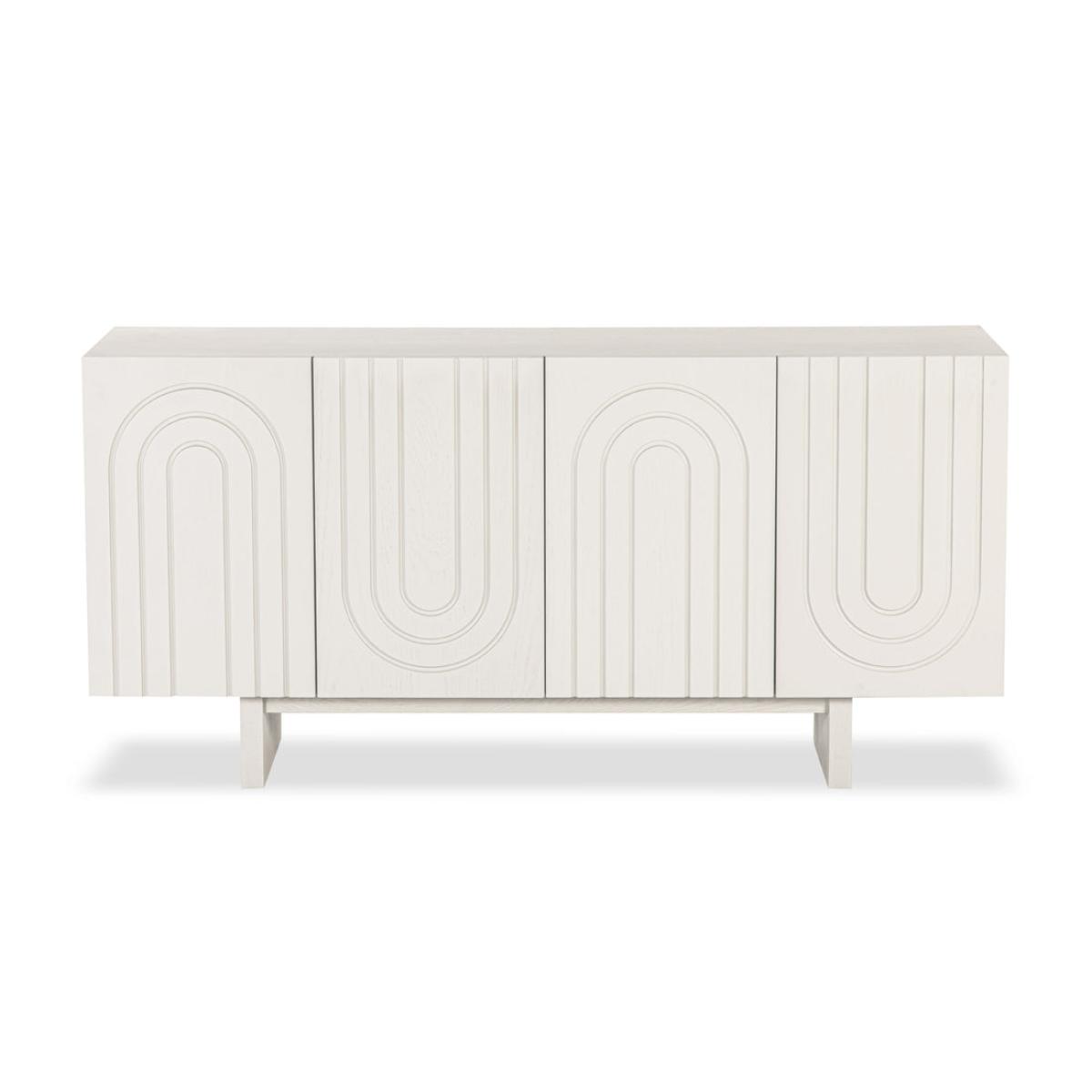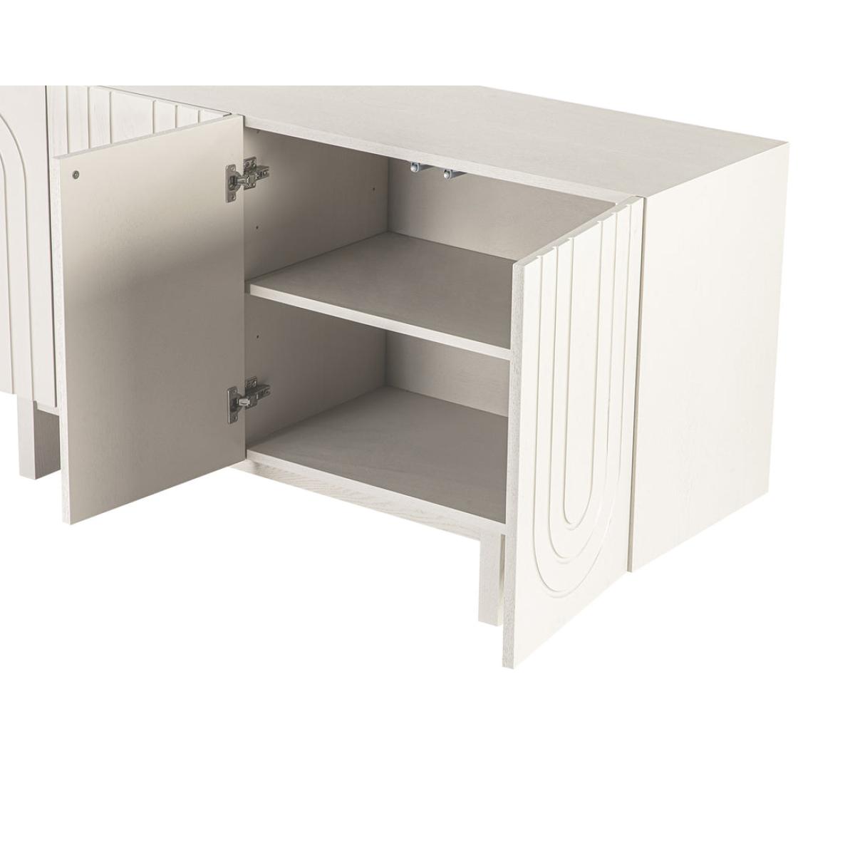 I love this sideboard for its sleek, modern aesthetic combined with subtle design details that make it stand out, like the curved line pattern on the doors. It works beautifully in contemporary interiors, especially those with minimalist or Scandinavian influences, where its neutral cream tone can add warmth without overpowering the space. Practical styling tips include pairing it with understated accessories-such as modern table lamps, a few curated decorative objects, or textured ceramics-to highlight its clean lines. It's also versatile enough to work well in living rooms, dining areas, or even bedrooms, providing both storage and style with ease.