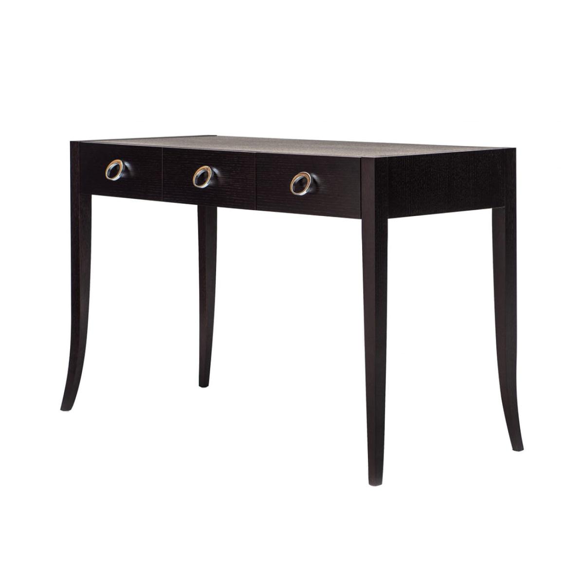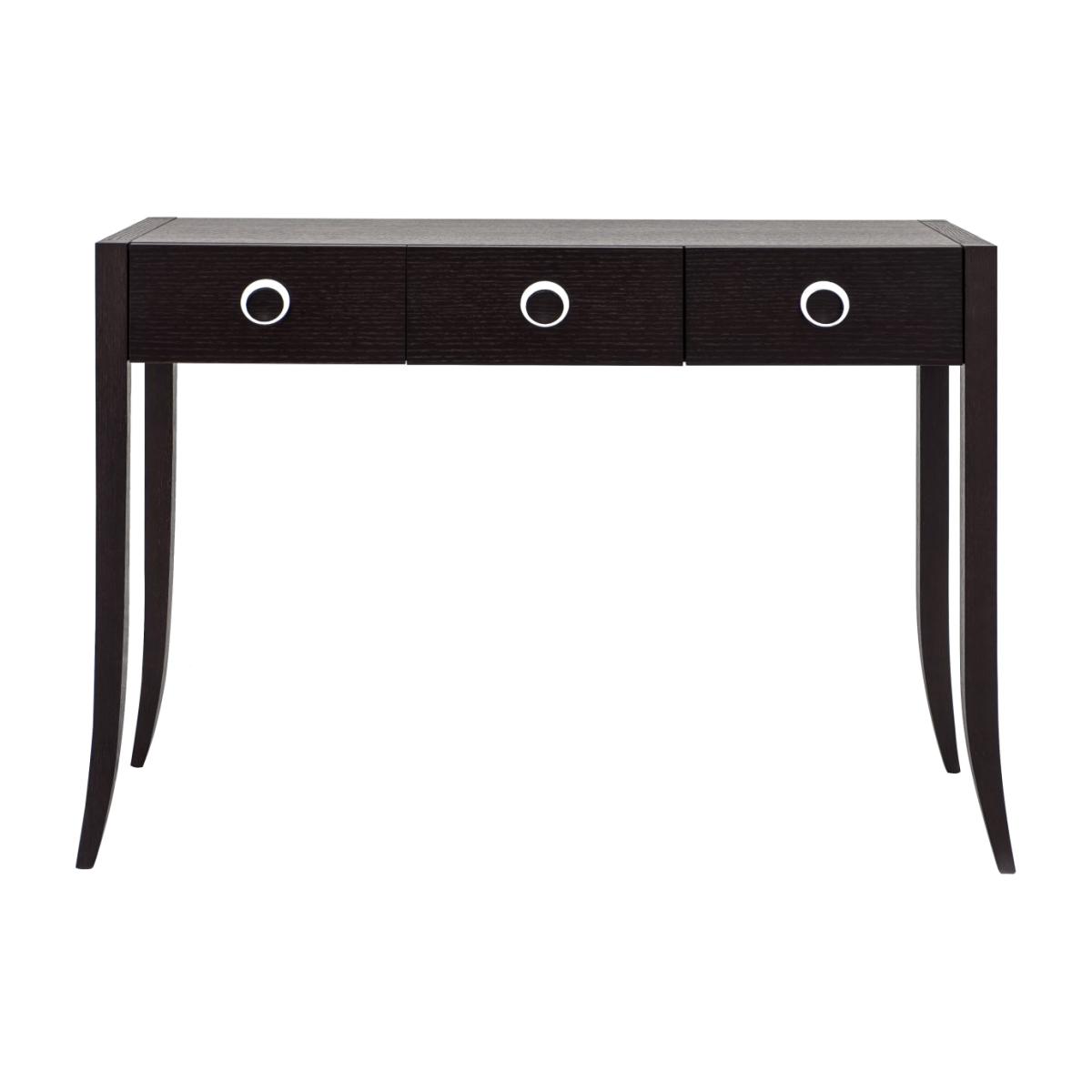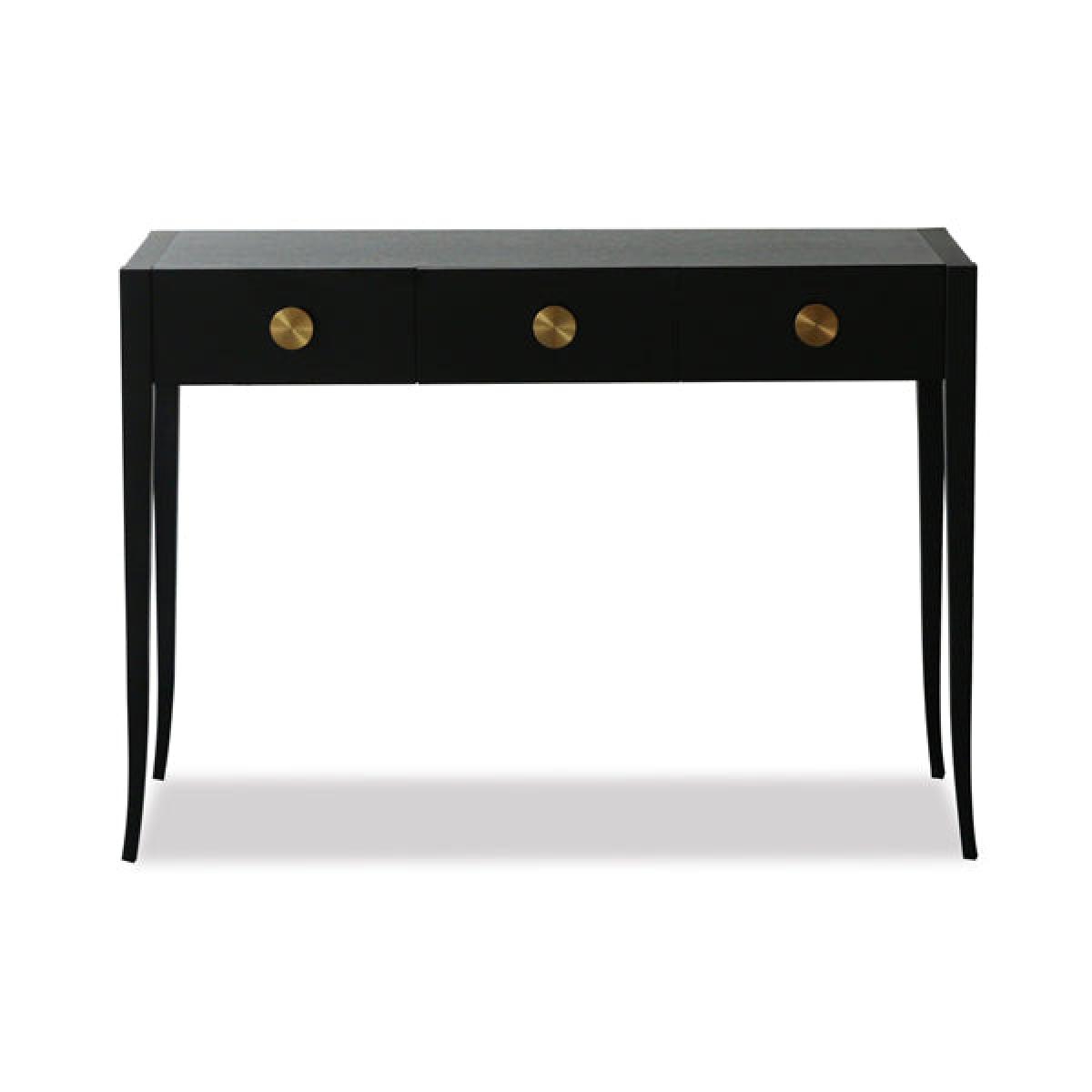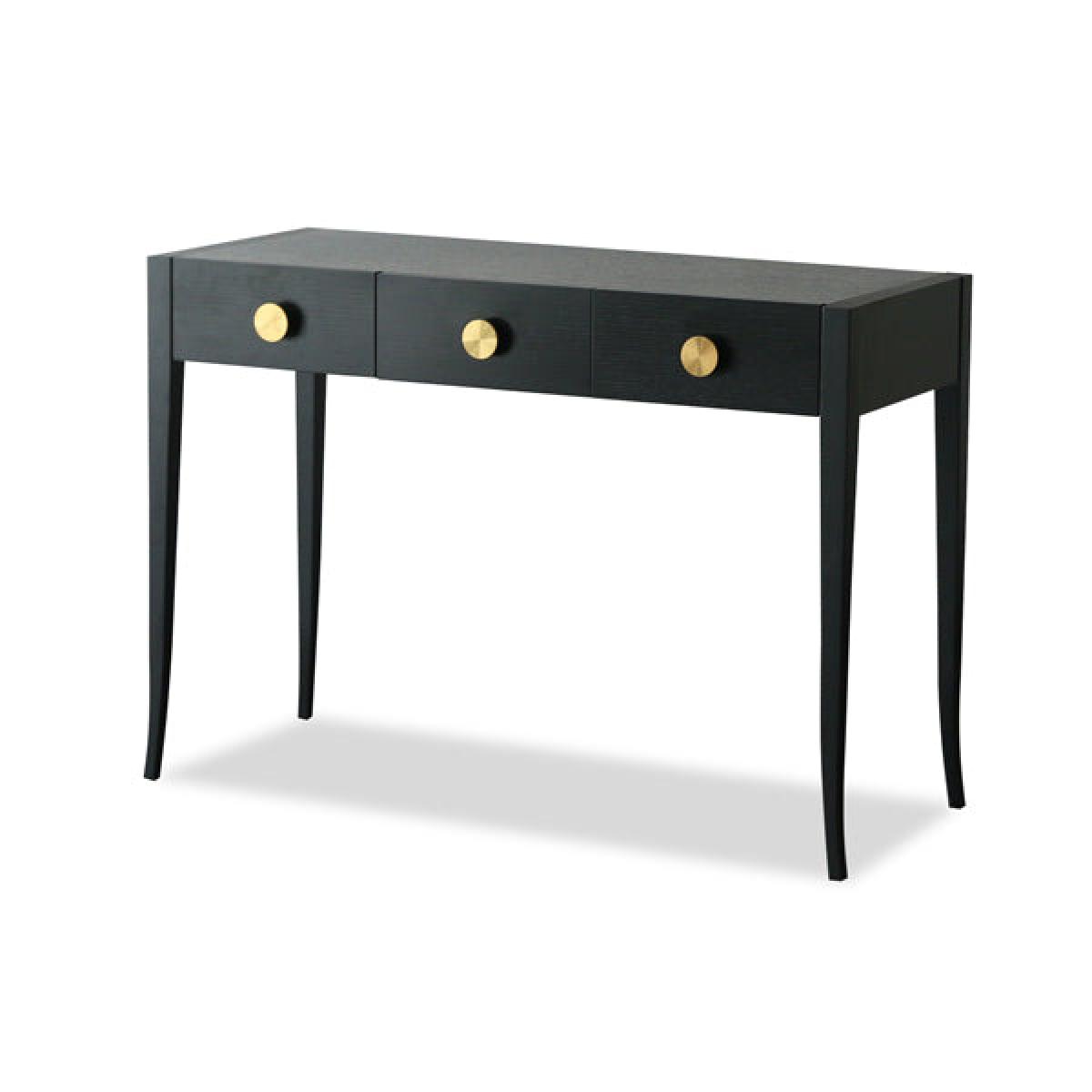 Quartered Oak Veneer, Polished Brass Finish Handles. With its elegant tapering and gently splayed legs the Orly console puts its best foot forward. Veneered in quartered oak and with solid wood legs it is versatile as a dressing table for a bedroom or as a statement piece in a hallway. Its three drawers offer ample storage and are adorned with bold polished brass finish handles. Match it with our Orly Side Table to create a stunning setting for your living room. Some assembly required.