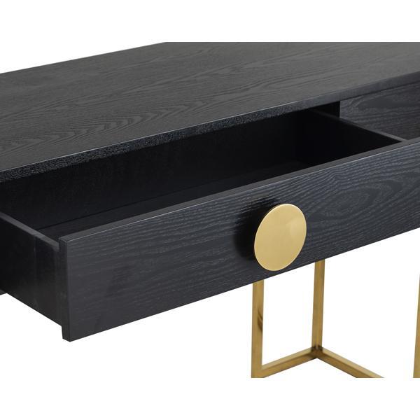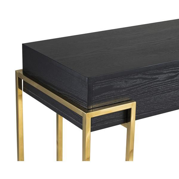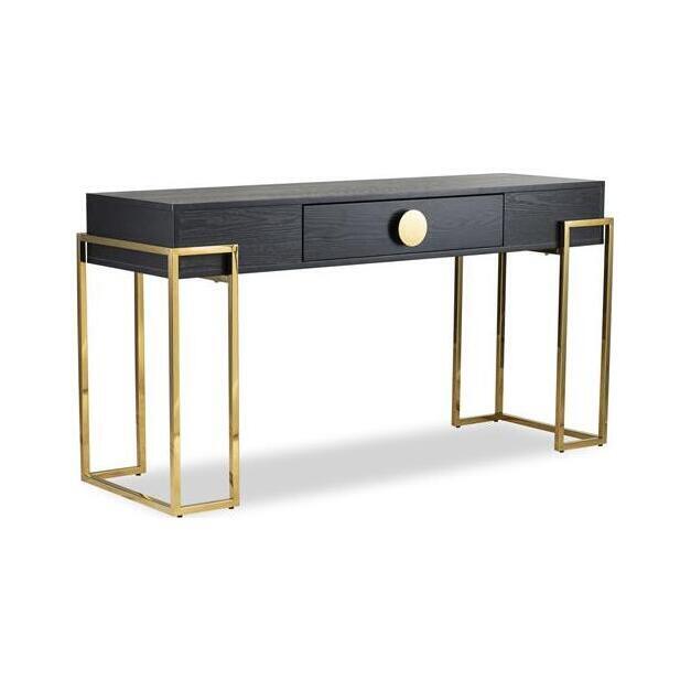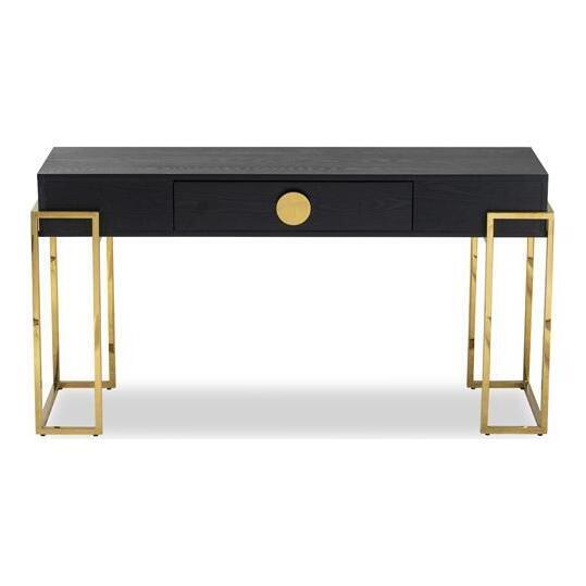 Black Ash Veneer, Polished Brass Finish Legs and handle Simple yet striking, the Paradigm Console Table is a classic design of substance for a hall or dining room or on the back of a free standing sofa. Black Ash Veneer contrasts with angular and abstract polished brass finish legs and is softened by its bold circular handle. Also available as a side table design.