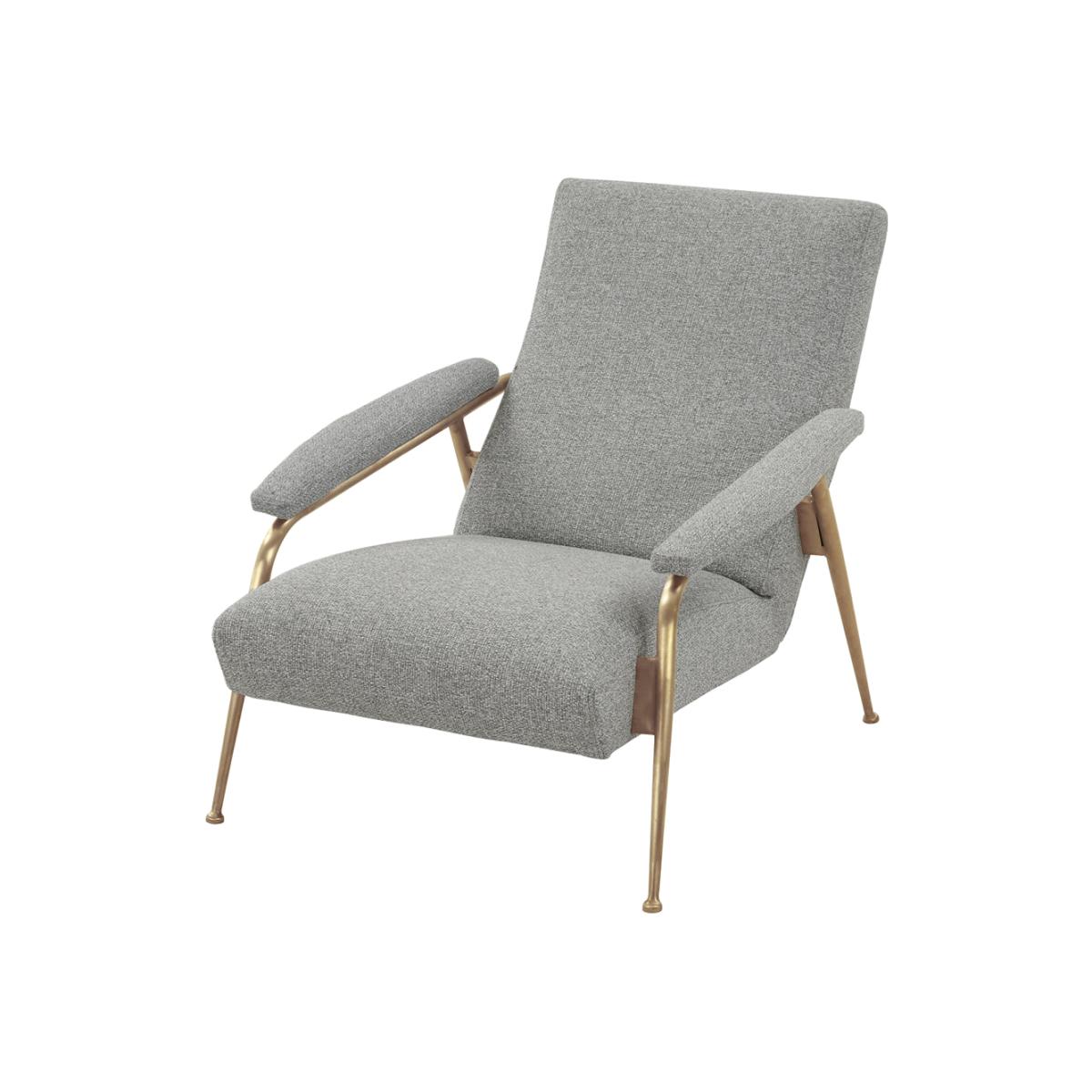 Brushed gold legs and soft, inviting upholstery give the Rex Occasional Chair by Liang & Eimil a luxurious air. With its sleek metal legs, padded armrests and reclined backrest, the Rex has a t. View More. Brushed gold legs and soft, inviting upholstery give the Rex Occasional Chair by Liang & Eimil a luxurious air. With its sleek metal legs, padded armrests and reclined backrest, the Rex has a truly modern silhouette, making it the perfect accent chair for the contemporary home. Place it in the lounge, bedroom or study to add extra seating while making an elegant and sophisticated style statement. The Rex is upholstered in easy-to-style emporio grey, while the brushed gold frame further increases the opulence and interest. The Rex is 76. 5cm tall, 71cm wide and 101cm deep, with a seat height of 37cm.