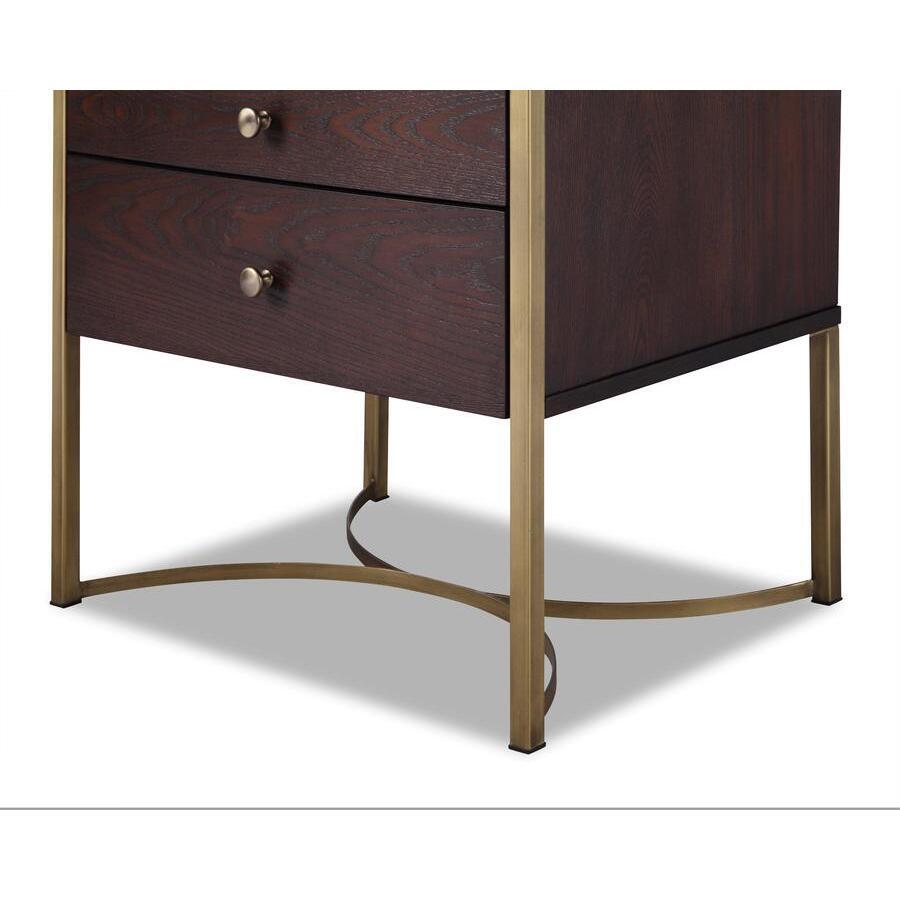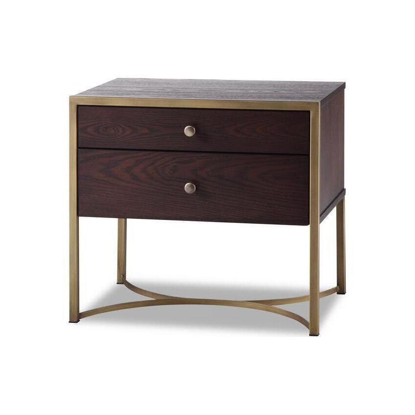 I love this bedside table for its sleek, modern design combined with warm detailing, making it a versatile piece. It works particularly well in contemporary or eclectic bedrooms, where contrasting materials and finishes add visual interest. The dark wood contrasted with brass accents adds a touch of sophistication without overwhelming the space. For styling, consider keeping the top clear with a simple lamp, a small plant, or a few personal items to enhance its minimalist appeal. It's also practical-its drawers provide discreet storage, helping to keep the bedside clutter-free. Overall, this piece can elevate a room while remaining functional and understated.