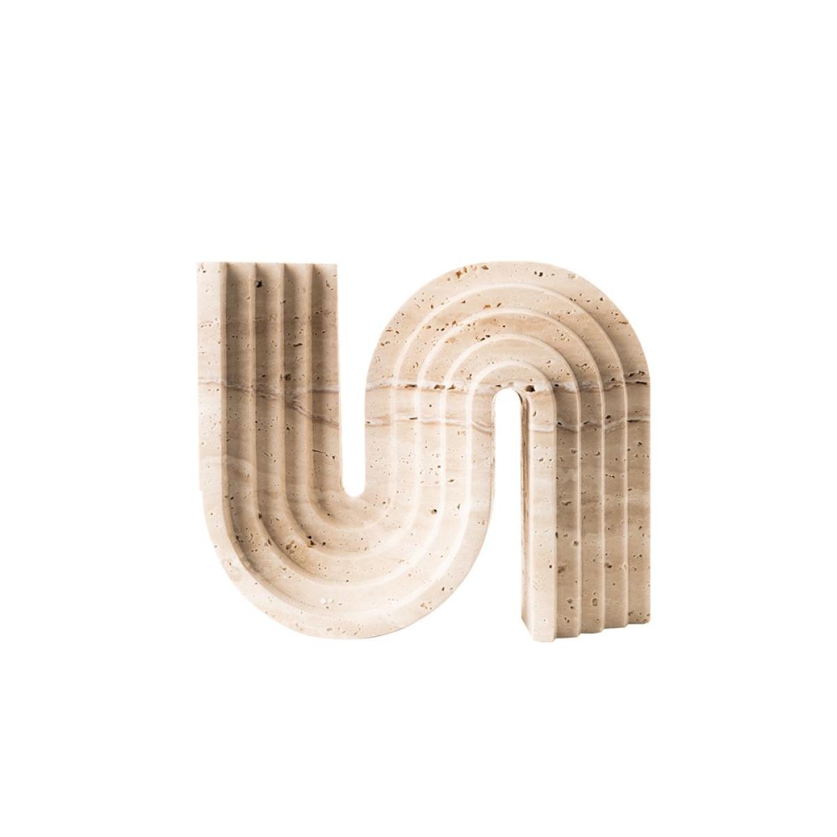 Scotti is an exquisite shaped sculpture that seamlessly blends artistry and sophistication. Crafted from pristine beige marble, Scotti stands as a testament to timeless elegance and refined aesthetics. Whether placed horizontally (like an S shape) or vertically (like an N shape), it is a versatile masterpiece that transcends orientation, inviting sophistication into every corner. The smooth, sinuous curves of Scotti create a sense of dynamic movement, capturing the eye and evoking a feeling of graceful fluidity. What sets this sculpture apart is the meticulous attention to detail in the step texturing that adorns its surface. Delicate patterns and subtle variations in the marble's texture create a tactile experience, inviting you to explore the piece with both sight and touch. The beige hue of Scotti adds warmth to any space, making it a versatile addition to both modern and classic interiors. Whether displayed as a standalone statement piece or incorporated into a curated collection, Scotti effortlessly becomes the focal point of any room. Features: Beige Marble