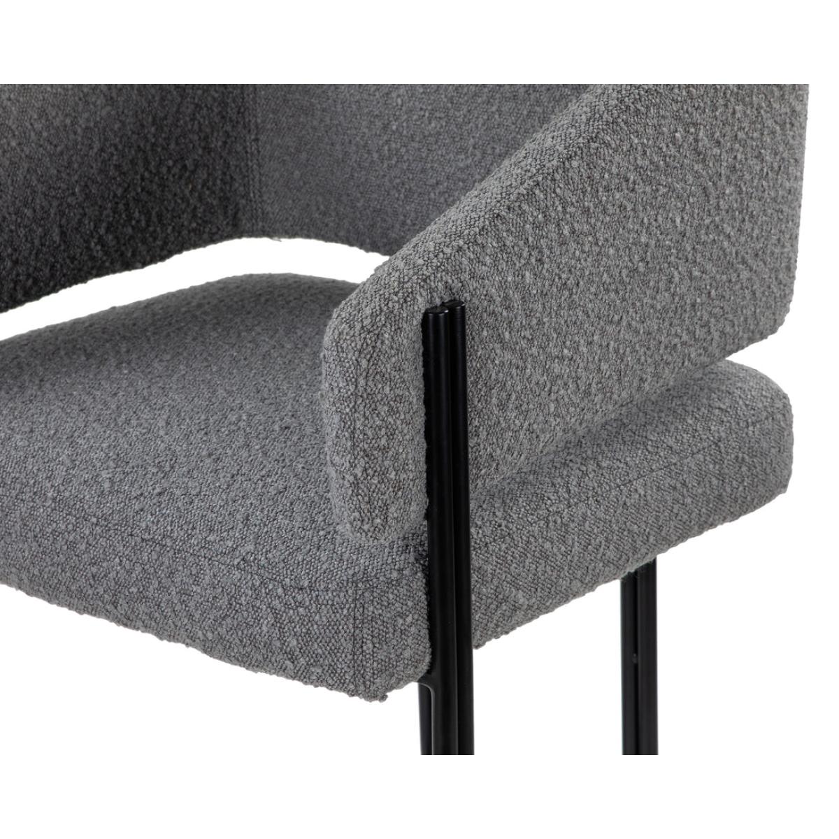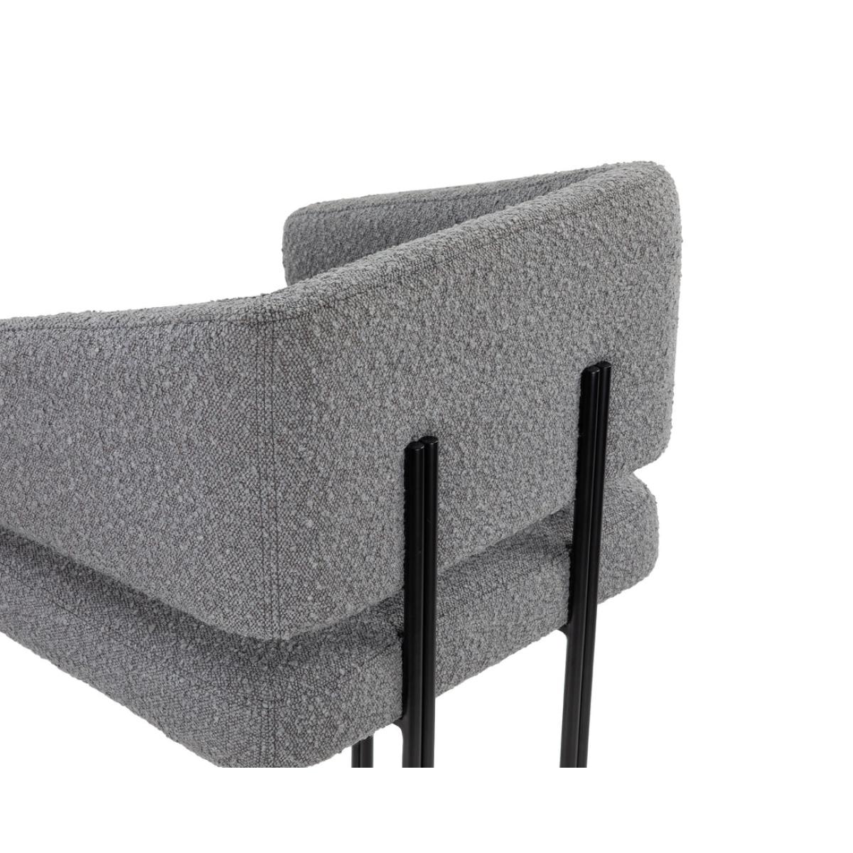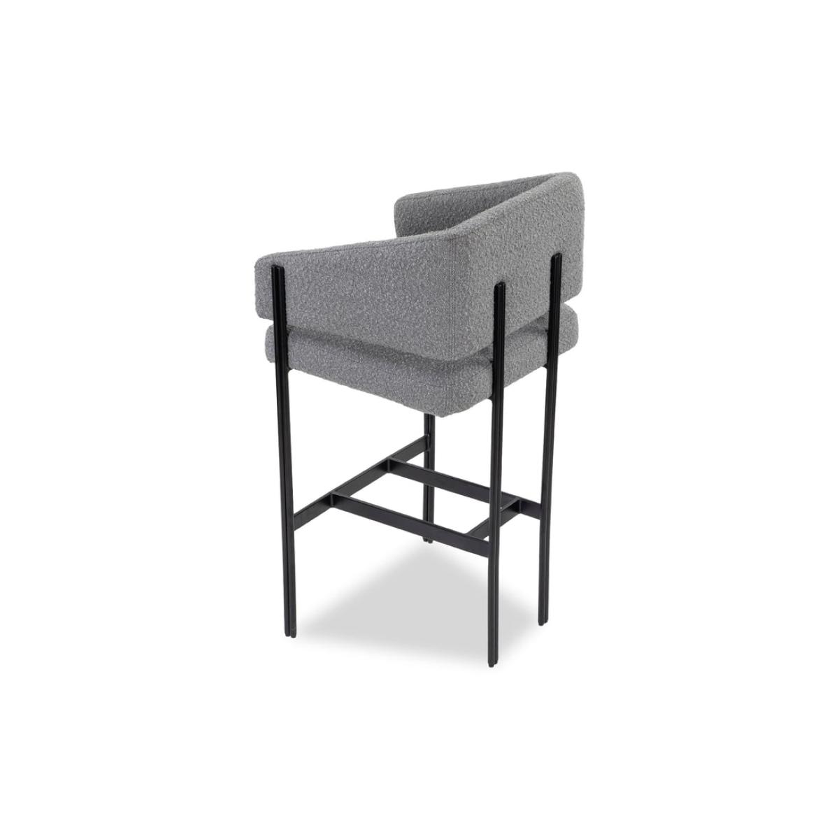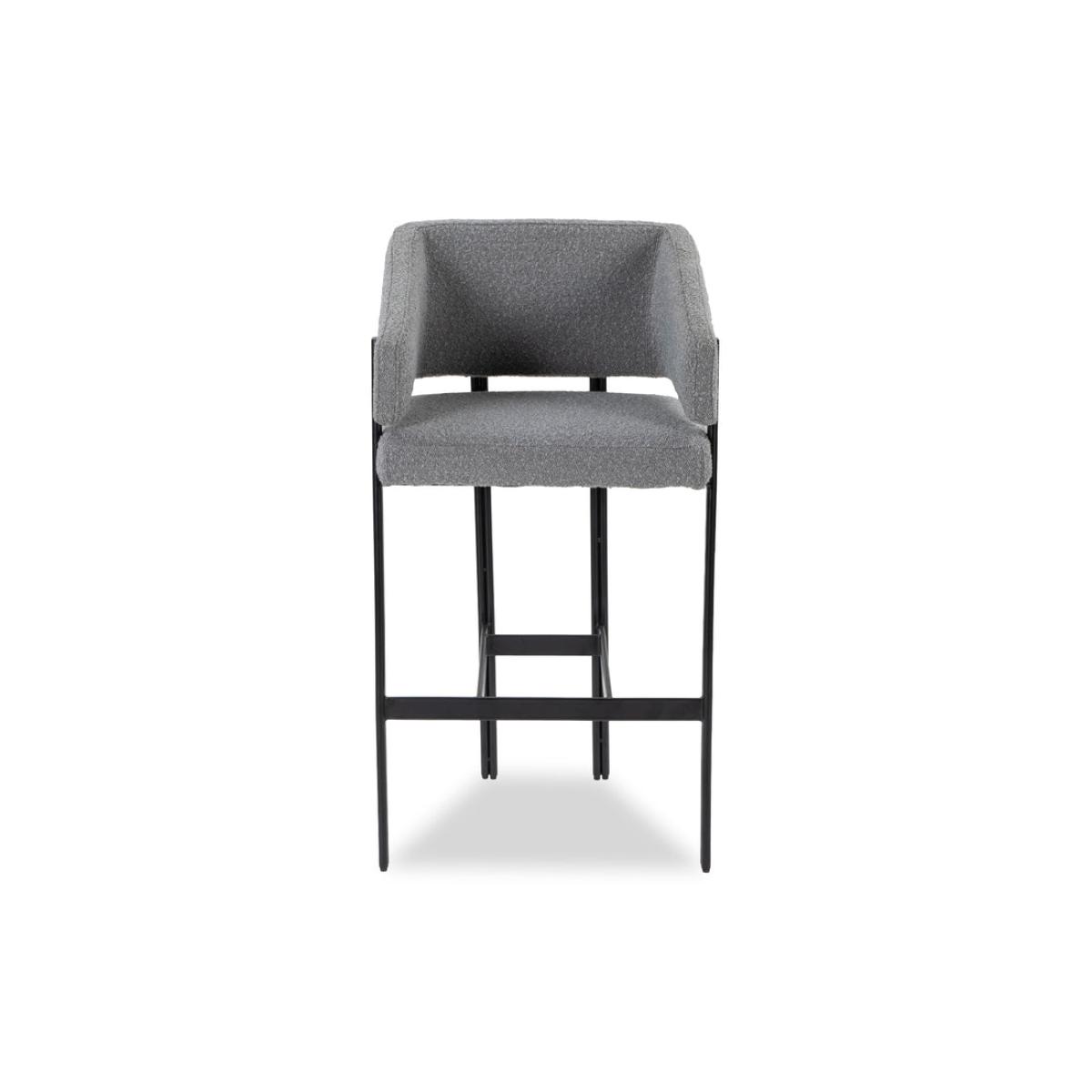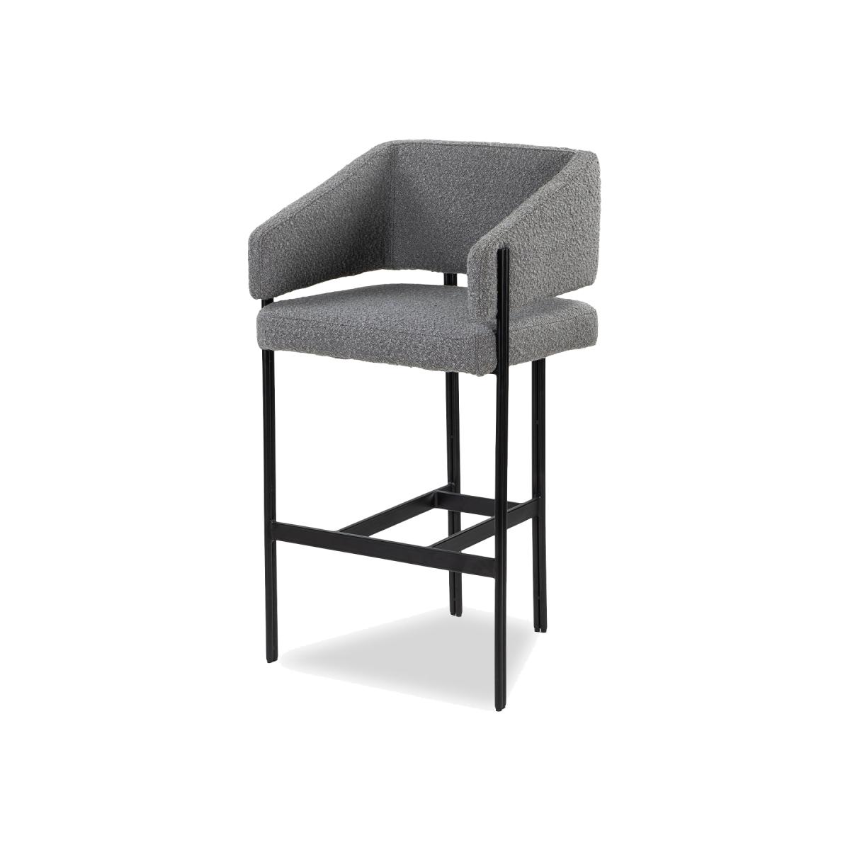 Boucle Grey, Matt Black Coated Steel legs Create a lavish look with the Tatler Bar Stool. Flaunting a cosseting curved back and sloping armrests and columned matt black steel legs it has hints of Art Deco with a very modern sensibility. Perfect for a modern breakfast bar or a boutique club environment.